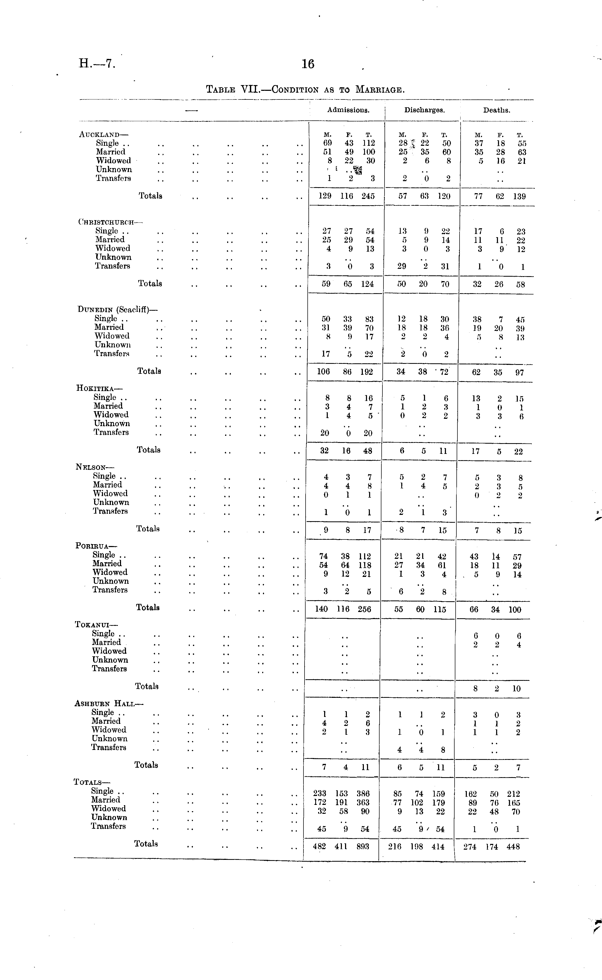 Admissions. Discharges. Deaths. Auckland— Single Married Widowed Unknown Transfers M. F. T. 09 43 112 51 49 100 8 22 30 ■ ' • •! I 2 3 M. F. 28 J 22 25 ' 35 2 6 T. 50 60 8 M. 37 35 5 F. 18 28 16 T. 55 63 21 2 '6 2 Totals 129 116 245 57 03 120 77 62 139 ('HRISTOHURCill — Single Married Widowed Unknown Transfers 27 25 4 27 29 9 54 54 13 13 5 3 9 9 0 22 14 3 17 0 23 11 11 22 3 9 12 3 0 3 29 2 31 1 "o I Totals 59 (i5 124 50 20 70 32 26 58 Dunedin (Seacliff) — Single Married Widowed Unknown Transfers 50 31 8 33 39 9 83 70 17 12 18 2 18 18 2 30 36 4 38 19 5 7 20 8 45 39 13 17 5 22 2 0 2 Totals 100 86 192 34 38 ' 72 62 35 97 Hokitika— Single Married Widowed Unknown Transfers 8 3 I 8 4 4 10 7 5 ' 5 1 (I I 2 2 6 3 2 13 I 3 2 0 3 15 1 0 20 0 20 Totals 32 16 48 5 11 17 5 22 Nelson— Single Married Widowed Unknown Transfers 4 4 0 3 4 I 7 8 I 5 1 2 4 7 5 5 2 0 3 3 o 8 5 2 1 6 1 2 1 3' Totals 9 8 17 •8 7 15 8 15 Porirua—Single Married Widowed Unknown Transfers 74 54 9 38 64 12 112 118 21 21 27 I 21 34 3 42 61 4 43 18 5 14 11 !) 57 29 14 3 *2 5 0 2 8 Totals 140 116 256 55 60 115 66 34 100 Tokanui— Single Married Widowed Unknown Transfers 6 2 0 2 0 4 Totals 2 10 Ash burn Hall— Single Married Widowed Unknown Transfers I 4 2 1 2 1 2 6 3 1 I I 6 2 1 3 1 1 3 2 2 4 4 8 Totals 7 4 11 6 5 11 5 2 7 Totals— Single Married Widowed Unknown Transfers 233 153 386 172 191 303 32 58 90 85 74 159 77 102 179 9 13 22 102 50 212 89 70 165 22 48 70 45 9 54 45 9 54 I 6 I Totals 482 411 893 216 198 414 274 174 448