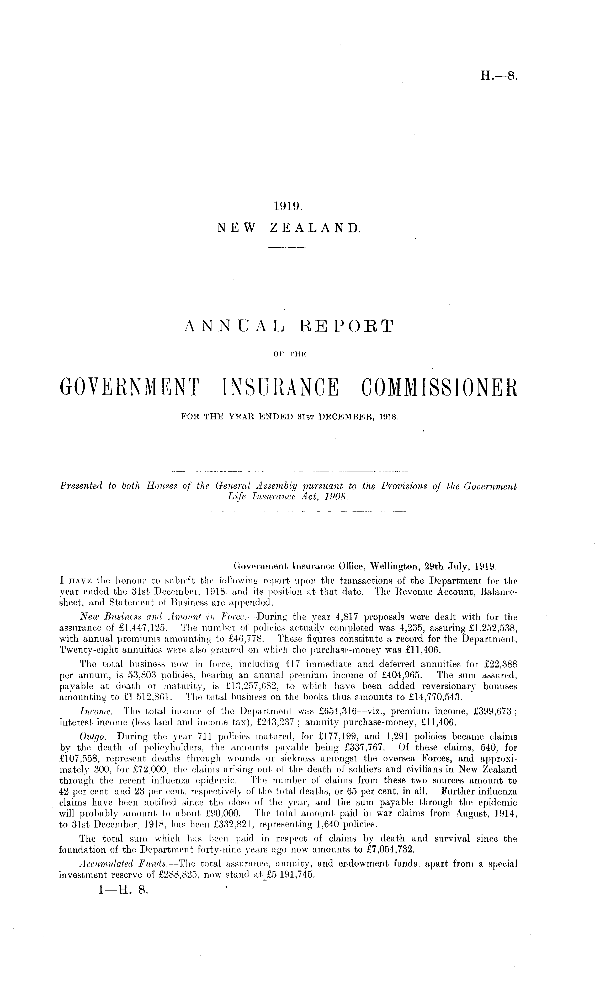 Government Insurance Office, Wellington, 29th July, 1919 I have the honour to submit the following report upon the transactions of the Department for the year ended the 31st December, 1918, and its position at that date. The Revenue Account, Balancesheet, and Statement of Business are appended. New Business and. Amount in Force.---During the year 4,817 proposals were dealt with for the assurance of £1,447,125. The number of policies actually completed was 4,235, assuring £1,252,538, with annual premiums amounting to £46,778. These figures constitute a record for the Department. Twenty-eight annuities were also granted on which the purchase-money was £11,406. The total business now in force, including 417 immediate and deferred annuities for £22,388 per annum, is 53,803 policies, bearing an annual premium income of £404,965. The sum assured, payable at death or maturity, is £13,257,682, to which have been added reversionary bonuses amounting to £1 512,861. The total business on the books thus amounts to £14,770,543. Income. —The total income of the Department was £654,316 —-viz., premium income, £399,673 ; interest income (less land and income tax), £243,237 ; annuity purchase-money, £11,406. Outgo.-- During the year 711 policies matured, for £177,199, and 1.291 policies became claims by the death of policyholders, the amounts payable being £337,767. Of these claims, 540, for £107,558, represent deaths through wounds or sickness amongst the oversea Forces, and approximately 300, for £72,000, the claims arising out of the death of soldiers and civilians in New Zealand through the recent influenza epidemic. The number of claims from these two sources amount to 42 per cent, and 23 per cent, respectively of the total deaths, or 65 per cent, in all. Further influenza claims have been notified since the close of the year, and the sum payable through the epidemic will probably amount to about £90,000. The total amount paid in war claims from August, 1914, to 31st December 1918, has been £332,821, representing 1,640 policies. The total sum which has been paid in respect of claims by death and survival since the foundation of the Department forty-nine years ago now amounts to £7,054,732. Accumulated Funds. —The total assurance, annuity, and endowment funds, apart from a special investment reserve of £288,825, now stand at_£5.191,745.