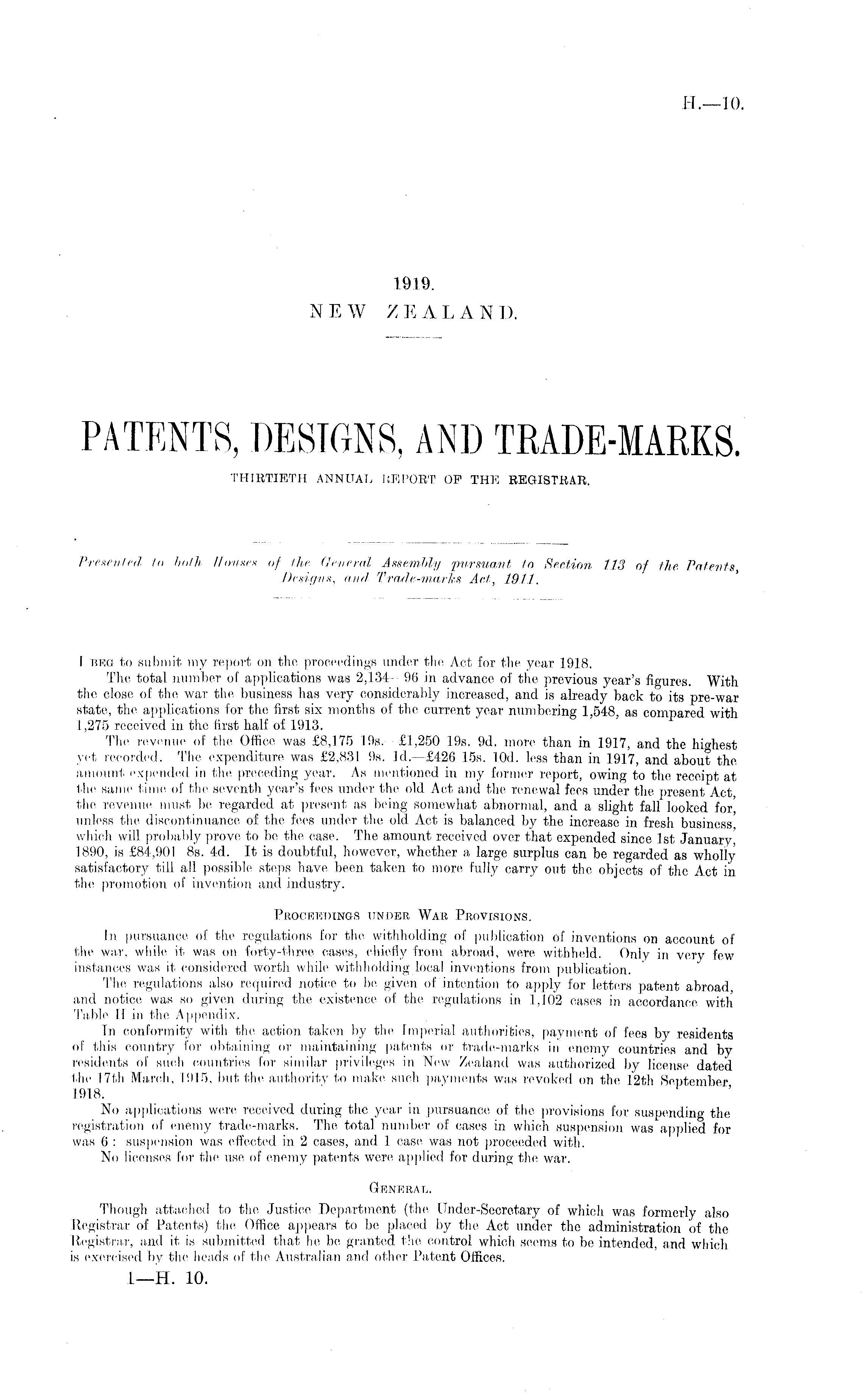 1 beg to submit my report on the proceedings under the Act for the year 1918. The total number of applications was 2,134—96 in advance of the previous year's figures. With the close of the war the business has very considerably increased, and is already back to its pre-war state, the applications for the first six months of the current year numbering 1,548, as compared with 1,275 received in the first half of 1913. The revenue of the Office was £8,175 19s. -£1,250 19s. 9d. more than in 1917, and the highest yet recorded. The expenditure was £2,831 9s. Id. —£426 15s. lOd. less than in 1917, and about the amount expended in the preceding year. As mentioned in my former report, owing to the receipt at the same time of the seventh year's fees under the old Act and the renewal fees under the present Act the revenue must be regarded at present as being somewhat abnormal, and a slight fall looked for' unless the discontinuance of the fees under the old Act is balanced by the increase in fresh business! which will probably prove to be the case. The amount received over that expended since Ist January, 1890, is £84,901 Bs. 4-d. It is doubtful, however, whether a large surplus can be regarded as wholly satisfactory till all possible steps have been taken to more fully carry out the objects of the Act in the, promotion of invention and industry. Proceedings under War Provisions. In pursuance of the regulations for the withholding of publication of inventions on account of the war, while it was on forty-three cases, chiefly from abroad, were withheld. Only in very few instances was it considered worth while withholding local inventions from publication. The regulations also required notice to be given of intention to apply for letters patent abroad and notice was so given during the existence of the regulations in 1,102 cases in accordance with Table 11 in the Appendix. In conformity with the action taken by the Imperial authorities, payment of fees by residents of this country for obtaining or maintaining patents or trade-marks in enemy countries and by residents of such countries lor similar privileges in New Zealand was authorized by license dated the 17th March, 1915, but the authority to make such payments was revoked on the 12th September 1918. No applications were received during the, year in pursuance of the provisions for suspending the registration of enemy trade-marks. The total, number of cases in which suspension was applied for was 6 : suspension was effected in 2 cases, and 1 case was not proceeded with. No licenses for the use of enemy patents were applied for during the war. General. Though attached to the Justice Department (the Under-Secretary of which was formerly also Registrar of Patents) the Office, appears to be placed by the Act under the administration of the Registrar, and it is submitted that he, be granted the control which seems to be intended, and which is exercised by the heads of the Australian and other Patent Offices.