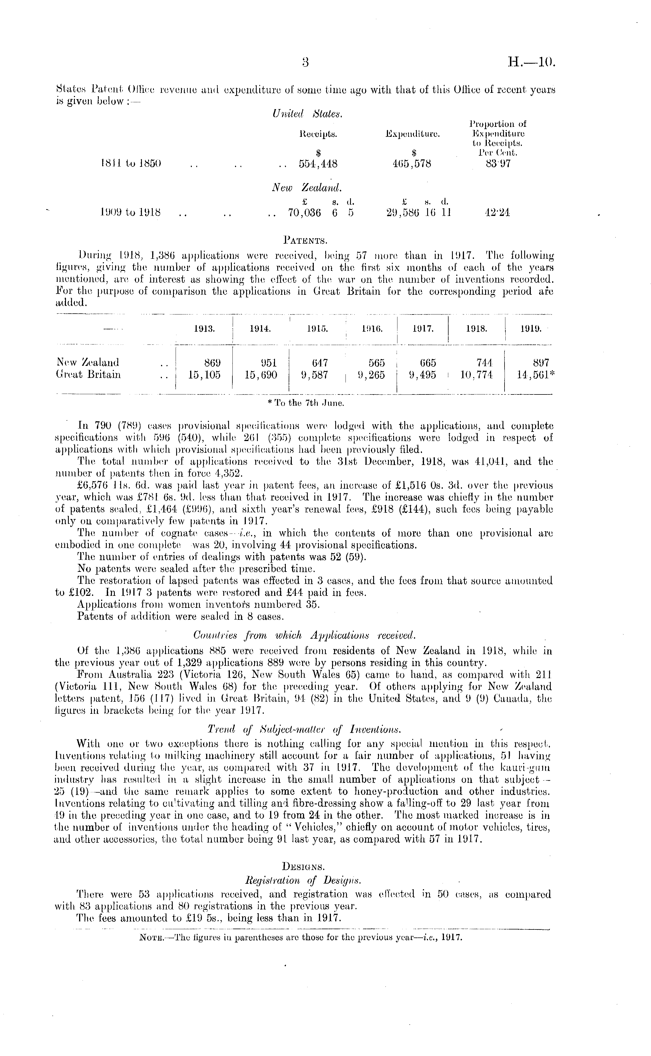 In 790 (789) cases provisional specifications were lodged with the applications, and complete specifications with 596 (540), while 261 (355) complete specifications were lodged in respect of applications with which provisional specifications bad been previously filed. The total number of applications received to the 31st December, 1918, was 11,011, and the number of patents then in force 1,352. £6,576 1 Is. (id. was paid last year in patent fees, an increase of £L,516 os. 3d. over the previous year, which was £781 6s. 9d. less than that received in 1917. The increase was chiefly in the number of patents sealed, £1,464 (£996), and sixth year's renewal fees, £918 (£14:4), such fees being payable only on comparatively few patents in 1917. The number of cognate cases i.e., in which the contents of more than one provisional are embodied in one complete was 20, involving 44 provisional specifications. The number of entries of dealings with patents was 52 (59). No patents were, sealed alter the prescribed time. The restoration of lapsed patents was effected in 3 cases, and the fees from that source, amounted to £102. In 1917 3 patents were restored and £44 paid in fees. Applications from women inventors numbered 35. Patents of addition were sealed in 8 cases. Countries from which Applications received. Of the 1,386 applications 885 were received from residents of New Zealand in 1918, while in the previous year out of 1,329 applications 889 were by persons residing in this country. From Australia 223 (Victoria 126, New South Wales 65) came to hand, a.s compared with 211 (Victoria 111, New South Wales 68) for the preceding year. Of others applying for New Zealand letters patent, .156 (117) lived in Great Britain, 91 (82) in the United States, and 9 (9) Canada,, the. figures in brackets being for the year 1917. Trend of Subject-matter of Inventions. With one or two exceptions there is nothing calling for any special mention hi this respect. Inventions relating to milking machinery still account for a fair number of applications, 51 having been received during the year, as compared with 37 in 1917. The development of the kauri gum industry has resulted in a, slight increase in the small number of applications on that subject — 25 (19) —tind the same remark applies to some extent to honey-production and other industries. Inventions relating to cultivating and tilling and fibre-dressing show a falling-off to 29 last year from 19 in the preceding year in one case, and to 19 from 24 in the other. The most marked increase is in the number of inventions under the heading of " Vehicles," chiefly on account of motor vehicles, fires, and other accessories, the total number being 91. last year, as compared with 57 in 1917. Designs. Registration of Designs. There were 53 applications received, and registration was effected in 50 oases, as compared with 83 applications and 80 registrations in the previous year. The, fees amounted to £19 55., being less than in 1917.