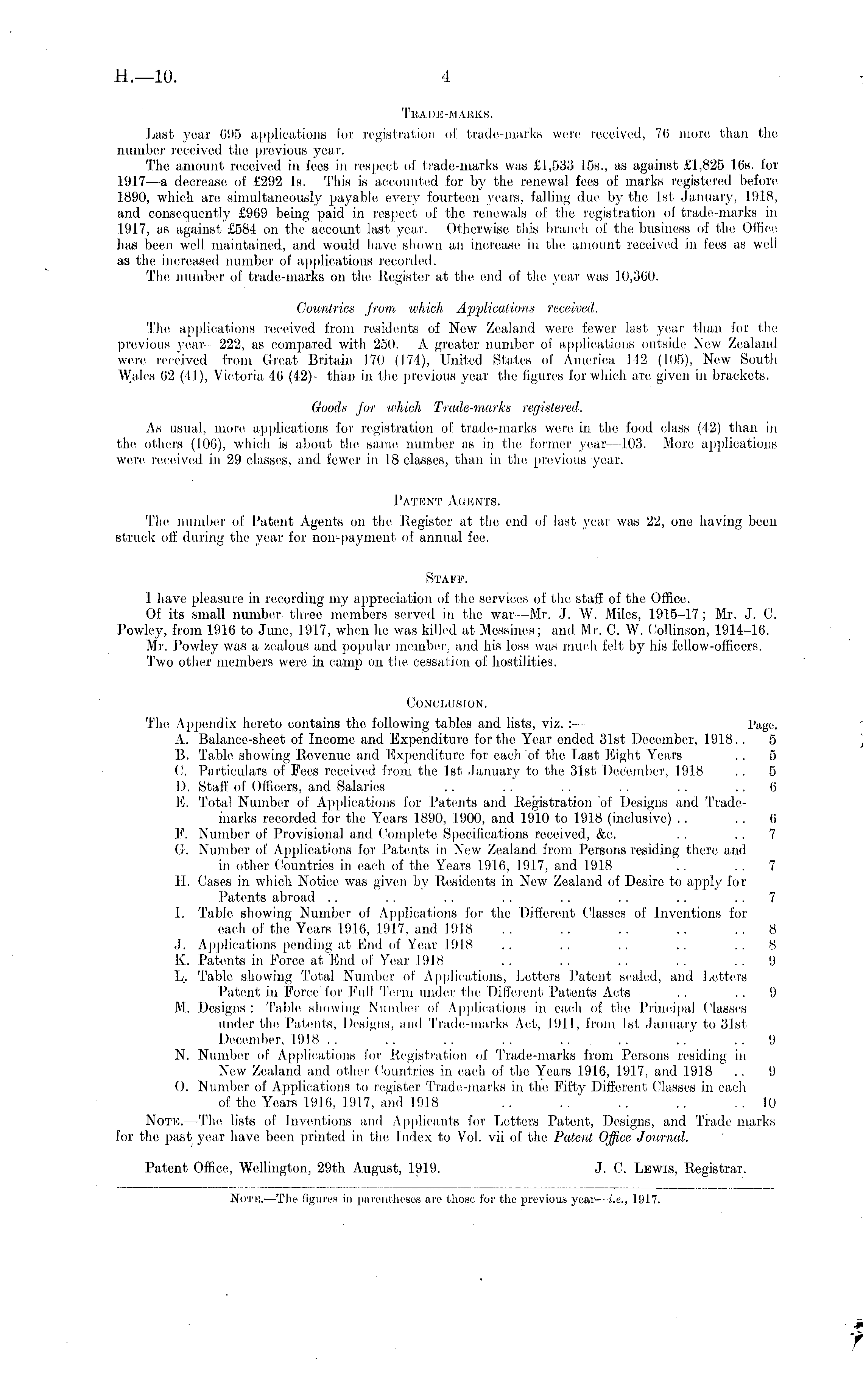 Trade-macks. Last year 695 applications for registration of trade-marks were received, 76 more than the number received the previous year. The amount received in fees in respect of trade-marks was £1,533 155., as against £1,825 16s. for 191.7—a decrease, of £292 Is. This is accounted for by the renewal fees of marks registered before 1890, which are simultaneously payable every fourteen years, falling due by the Ist January, 1918, and consequently £969 being paid in respect of the renewals of the registration of trade-marks in 1917, as against £584 on the account last year. Otherwise this branch of the business of the Office has been well maintained, and would have shown an increase, in the amount received in fees as well as the increased number of applications recorded. The, number of trade-marks on the Register at. the end of the year was 10,360. Countries from which Applications received. The applications received from residents of New Zealand were, fewer last year thai) for the previous year 222, as compared with 250. A greater number of applications outside New Zealand were received from Great Britain 170 (171), United States of America 112 (105), New South Wales 62 (41), Victoria 46 (42) —than in the previous year the figures for which are given in brackets. Goods for which Trade-marks registered. As usual, more applications for registration of trade-marks were in the food class (42) than in the. others (106), which is about the same number as in the former year- 1.03. More applications were received in 29 classes, and fewer in 18 classes, than in the previous year. Patent Agents. The number of Patent Agents on the Register at the end of last year was 22, one having been struck off during the year for non-payment of annual fee. Staff. I have pleasure in recording my appreciation of the services of the staff of the Office. Of its small number three members served in the war —Mr. J. W, Miles, 1915-17; Mr, J. C. Powley, from 1916 to June, 1917, when he was killed at Messines; and Mr. C. W. Collinson, 1914-16. Mr. Powley was a zealous and popular member, and his loss was much felt by his fellow-officers. Two other members were in camp on the cessation of hostilities. Conclusion. The Appendix hereto contains the following tables and lists, viz. : Page. A. Balance-sheet of Income and Expenditure for the Year ended 31st December, 1918.. 5 B. Table showing Revenue and Expenditure for each of the Last Eight Years .. 5 C. Particulars of Fees received from the Ist January to the 31st December, 1918 .. 5 D. Staff of Officers, and Salaries . . . . . . . . . . . . (i E. Total Number of Applications lor Patents and Registration of Designs and Trademarks recorded for the Years 1890, 1900, and 1910 to 1918 (inclusive) . ... (i F. Number of Provisional and Complete Specifications received, &.c. . . . , 7 G. Number of Applications for Patents in New Zealand from Persons residing there and in other Countries in each of the Years 1916, 1917, and 1918 . . . . 7 H. Cases in which Notice was given by Residents in New Zealand of Desire to apply for Patents abroad .. . . .. .. .. .. .. .. 7 1. 'Table showing Number of Applications for the Different Classes of Inventions for each of the Years 1916, 1917, and 1918 .. .-. .. .. ..8 J. Applications pending at Mud of Year 1918 .. .. ~ .. ~8 K. Patents in Force at End of Year 1918 .. .. .. .. ..9 L. .Table showing Total Number of Applications, Letters Patent sealed, and Letters Patent in Force for Full Term under the Different Patents Acts .. .. 9 M. Designs: Table showing Number of Applications in each of the Principal Classes under the Patents, Designs, and Trade-marks Act, 1911, from Ist January to 31st December, 1918 . . .. .. .. .. ..' ..9 N. Number of Applications for Registration of Trade-marks from Persons residing in New Zealand and other Countries in each of the Years 1916, 1917, and 1918 .. 9 O. Number of Applications to register Trade-marks in the Fifty Different Classes in each of the Years 1916, 1917, and 1918 .. .. .. .. .'.lO Note. —The lists of Inventions and Applicants for Letters Patent, Designs, and Trade marks for the past year have been printed in the Index to Vol. vii of the Patent Office Journal. Patent Office, Wellington, 29th August, 1919. J. C. Lewis, Registrar.