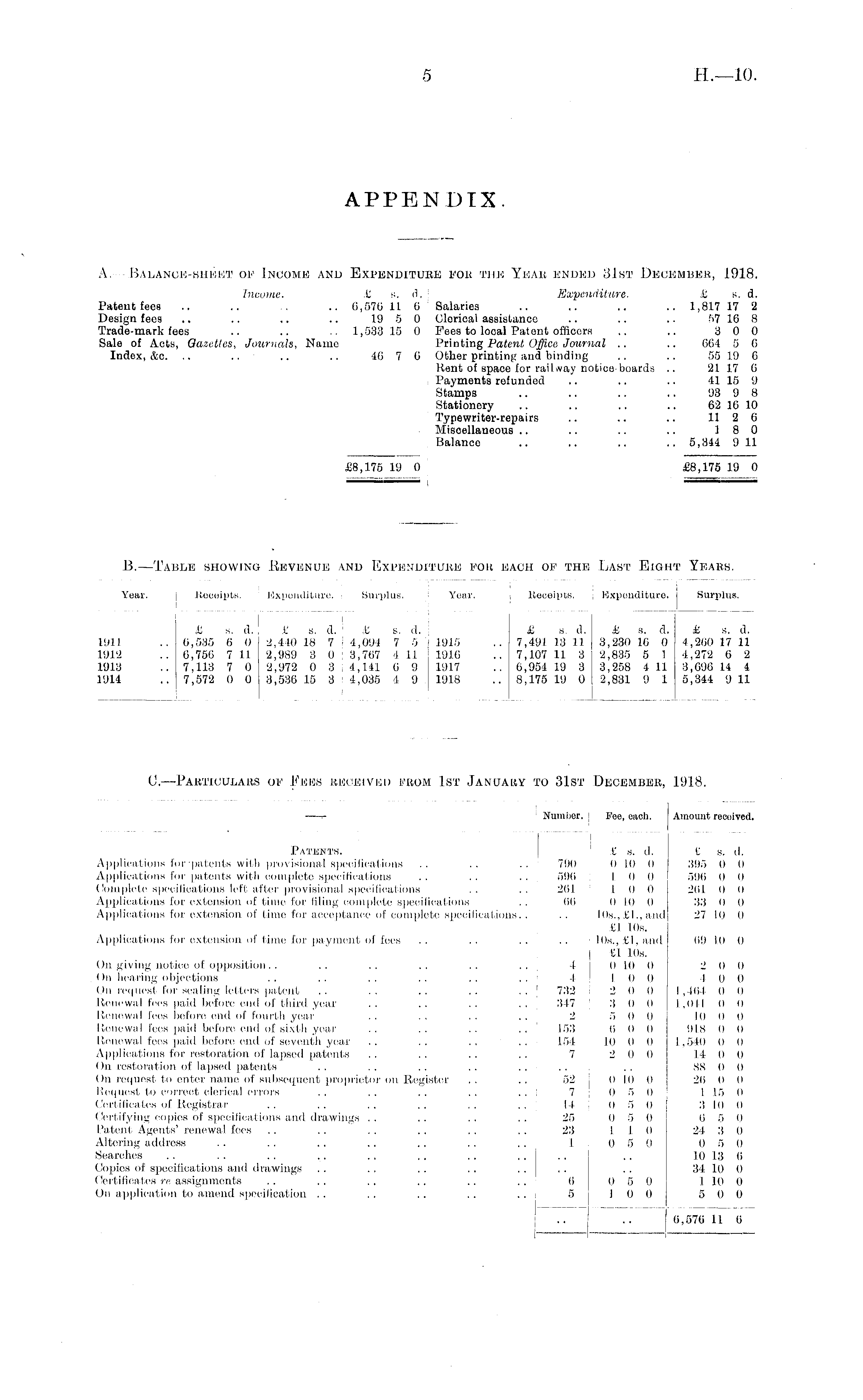 APPENDIX. A.--Balance-sheet oe Income and Expenditure fok the Year ended 31st December, 1918. Income. £ s. d. Expenditure. £ s. d. Patent fees .. .. .. .. 0,570 11 6 Salaries .. .. .. .. 1,817 17 2 Design fees .. .. .. .. 19 5 0 Clerical assistance .. .. .. 57 16 8 Trade-mark fees .. .. 1,533 15 0 Fees to local Patent officers .. .. 3 0 0 Sale of Acts, Gazettes, Journals, Name Printing Patent Office Journal .. .. 064 5 0 Index, &o. .. .. .. .. 40 7 0 Other printing and binding .. .. 55 19 6 Rent of space for railway notice boards .. 21 17 6 Payments refunded .. .. .. 41 15 9 Stamps .. .. .. .. 93 9 8 Stationery .. .. .. .. 62 16 10 Typewriter-repairs .. .. .. 11 2 6 Miscellaneous .. .. .. .. 18 0 Balanoo .. .. .. .. 5,344 9 11 £8,175 19 0 £8,175 19 0