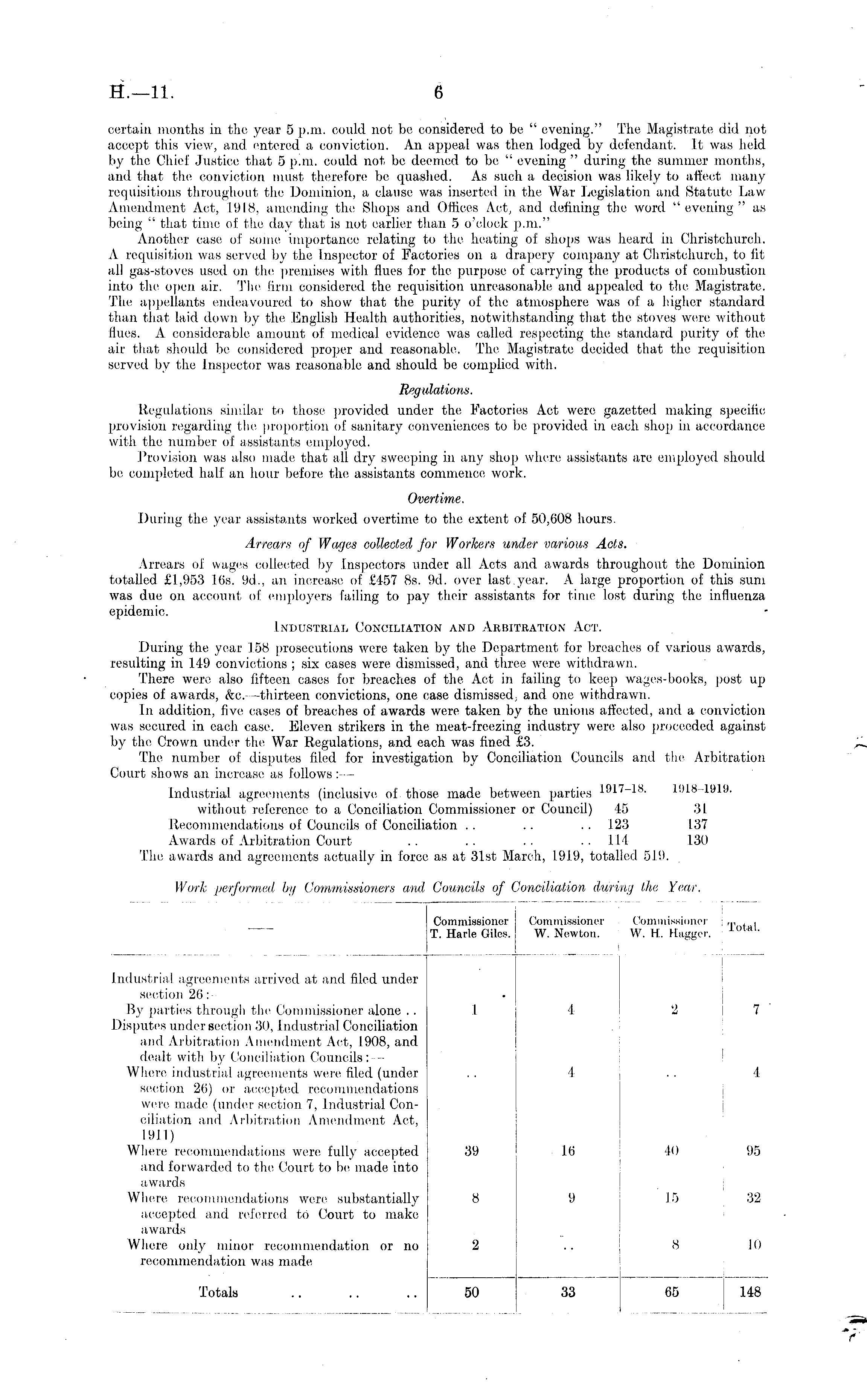 certain months in the year 5 p.m. could not be considered to be " evening." The Magistrate did not accept this view, and. entered a conviction. An appeal was then lodged by defendant. It was held by the Chief Justice that 5 p.m. could not be deemed to be " evening " during the summer months, and that tin; conviction must therefore be quashed. As such a decision was likely to affect many requisitions throughout the Dominion, a clause was inserted in the War Legislation and Statute Law Amendment Act, 1918, amending the Shops and Offices Act, and defining the word "evening" as being " that time of the day that is not earlier than 5 o'clock p.m." Another case of some importance relating to the heating of shops was heard in Christchuroh. A requisition was served by the Inspector of Factories on a drapery company at Christchurch, to fit all gas-stoves used on the premises with flues for the purpose of carrying the products of combustion into the open air. The firm considered the requisition unreasonable and appealed to the Magistrate. The appellants endeavoured to show that the purity of the atmosphere was of a higher standard than that laid down by the English Health authorities, notwithstanding that the stoves were without flues. A considerable amount of medical evidence was called respecting the standard purity of the air that should be considered proper and reasonable. The Magistrate decided that the requisition served by the Inspector was reasonable and should be complied with. Regulations. Regulations similar to those provided under the Factories Act were gazetted making specific provision regarding the proportion of sanitary conveniences to be provided in each shop in accordance with the number of assistants employed. Provision was also made that all dry sweeping in any shop where assistants arc employed should be completed half an hour before the assistants commence work. Overtime. During the year assistants worked overtime to the extent of 50,608 hours. Arrears of Wages collected for Workers under various Acts. Arrears of wages collected by Inspectors under all Acts and awards throughout the Dominion totalled £1,953 16s. 9d., an increase of £457 Bs. 9d. over last year. A large proportion of this sum was due on account ol employers failing to pay their assistants lor time lost during the influenza epidemic. Industrial Conciliation and Arbitration Act. During the year 158 prosecutions were taken by the Department for breaches of various awards, resulting in 149 convictions ; six cases were dismissed, and three were withdrawn. There were also fifteen cases for breaches of the Act in failing to keep wages-books, post up copies of awards, ore.—thirteen convictions, one case dismissed; and. one withdrawn. In addition, five cases of breaches of awards were taken by the unions affected, and a conviction was secured in each case. Eleven strikers in the meat-freezing industry were also proceeded against by the Crown under the War Regulations, and each was fined £3. The number of disputes filed for investigation by Conciliation Councils and the Arbitration Court shows an increase as follows :— Industrial agreements (inclusive of those made between parties 19 1 7 ~1 8 ' 1918 -1919. without reference to a Conciliation Commissioner or Council) 45 31 Recommendations of Councils of Conciliation .. .. .. \2'-) 137 Awards of Arbitration Court .. .. .. ..11l 130 'I'he awards and agreements actually in force as at 31st March, 1919, totalled 5111.