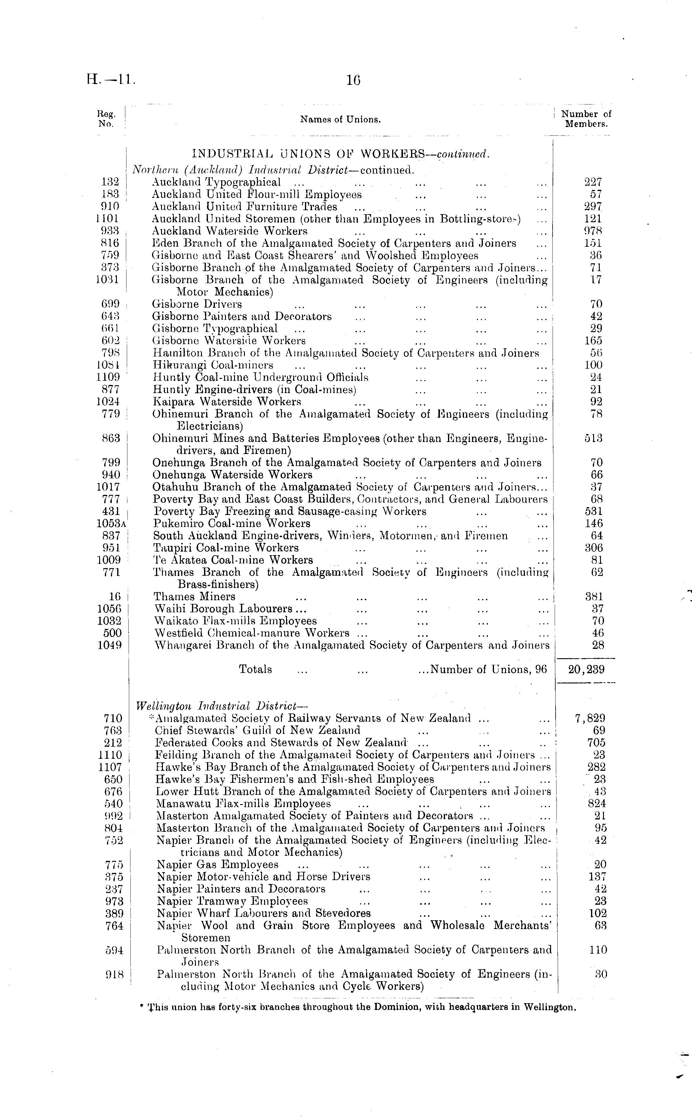 Names of Unions. Keg. No. Number of Members. INDUSTRIAL UNIONS OF WORKERS— cqnUmtfid. Northern (Auckland) Industrial District —continued. 132 Auckland Typographical ... ... 183 Auckland United Flour-mill Employees 910 : Auckland United Furniture Trades 1101 Auckland United Storemen (other than Employees in Bottling-store>) 933 Auckland Waterside Workers 816 Eden Branch of the Amalgamated Society of Carpenters and Joiners 759 Gisborno and East Coast Shearers' and Woolshed Employees 373 Gisborne Branch of the Amalgamated Society of Carpenters and Joiners... 1031 Gisborne Branch of the Amalgamated Society of Engineers (including Motor Mechanics) 699 Gisborne Drivers 643 Gisborno Painters and Decorators 661 ■ Gisborne Typographical 602 Gisborne Waterside Workers 798 Hamilton Branch of the Amalgamated Society of Carpenters and Joiners 1081 Hikurangi Coal-miners 1109 Huntly Coal-mine Underground Officials 877 Huntly Engine-drivers (in Coal-mines) 1024 Kaipara Waterside Workers 779 Ohinemuri Branch of the Amalgamated Society of Engineers (including Electricians) 863 i Ohinemuri Mines and Batteries Employees (other than Engineers, Enginedrivers, and Firemen) 799 i Onehunga Branch of the Amalgamated Society of Carpenters and Joiners 940 j Onehunga Waterside Workers 1017 Otahuhu Branch of the Amalgamated Society of Carpenters and Joiners... 777 Poverty Bay and East Coast Builders, Contractors, and General Labourers 431 Poverty Bay Freezing and Sausage-casing Workers ... ... 1053a Pukemiro Coal-mine Workers 837 | South Auckland Engine-drivers, Winders, Motormen,'and Firemen 951 | Taupiri Coal-mine Workers 1009 Te Akatea Coal-mine Workers 771 Thames Branch of the Amalgamated Society of Engineers (including Brass-finishers) 16 j Thames Miners 1056 Waihi Borough Labourers ... 1032 Waikato Flax-mills Employees 500 Westfield Chemical-manure Workers ... 1049 Whangarei Branch of the Amalgamated Society of Carpenters and Joiners 227 57 297 121 978 151 36 71 17 70 42 29 165 56 100 24 21 92 78 513 70 66 37 68 531 146 64 306 81 62 381 37 70 46 28 Totals ... ... ...Number of Unions, 96 20,239 Wellington Industrial District — 710 "'Amalgamated Society of Railway Servants of New Zealand ... 763 Chief Stewards' Guild of New Zealand 212 Federated Cooks and Stewards of New Zealand ... 1110 j Feilding Branch of the Amalgamated Society of Carpenters and Joiners ... 1107 Hawke's Bay Branch of the Amalgamated Society of Carpenters and Joiners 650 Hawke's Bay Fishermen's and Fish-shed Employees 676 Lower Hutt Branch of the Amalgamated Society of Carpenters and Joiners 540 Manawatu Flax-mills Employees 992 Masterton Amalgamated Society of Painters and Decorators ... 804 Masterton Branch of the Amalgamated Society of Carpenters ami Joiners 752 Napier Branch of the Amalgamated Society of Engineers (including Electricians and Motor Mechanics) 775 Napier Gas Employees 375 Napier Motor-vehicle and Horse Drivers 237 Napier Painters and Decorators 973 Napier Tramway Employees 389 Napier Wharf Labourers and Stevedores 764 Napier Wool and Grain Store Employees and Wholesale Merchants' Storemen 594 Palmerston North Branch of the Amalgamated Society of Carpenters and Joiners 918 Palmerston North Branch of the Amalgamated Society of Engineers (including Motor Mechanics and Cycle Workers) 7,829 69 705 23 282 23 43 824 21 95 42 20 137 42 23 102 63 110 30 • This union has forty-six branches throughout the Dominion, with headquarters in Wellin gton.