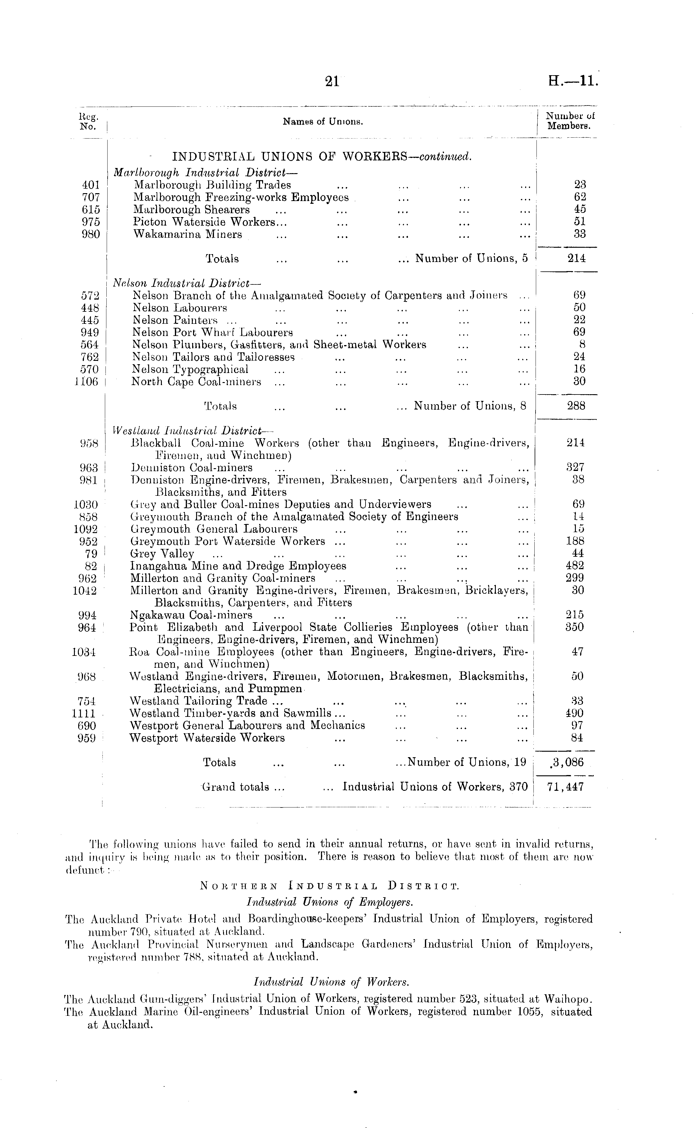 The following unions have failed to send in their annual returns, or have sent in invalid returns, and inquiry is being made us to their position. There is reason to believe that most of them are now defunct :- NOKT H E R N INBUB T R I A L DISTR 1 C T. Industrial Unions of Employers. The Auckland Private Hotel and Boardinghouse-keepers' Industrial Union of Employers, registered number 790, situated at Auckland. The Auckland Provincial Nurserymen and Landscape Gardeners' Industrial Union of Employers, registered number 788, situated at Auckland. Industrial Unions of Workers. The Auckland Gum-diggers' Industrial Union of Workers, registered number 523, situated at Waihopo. The Auckland Marine Oil-engineers' Industrial Union of Workers, registered number 1055, situated at Auckland.