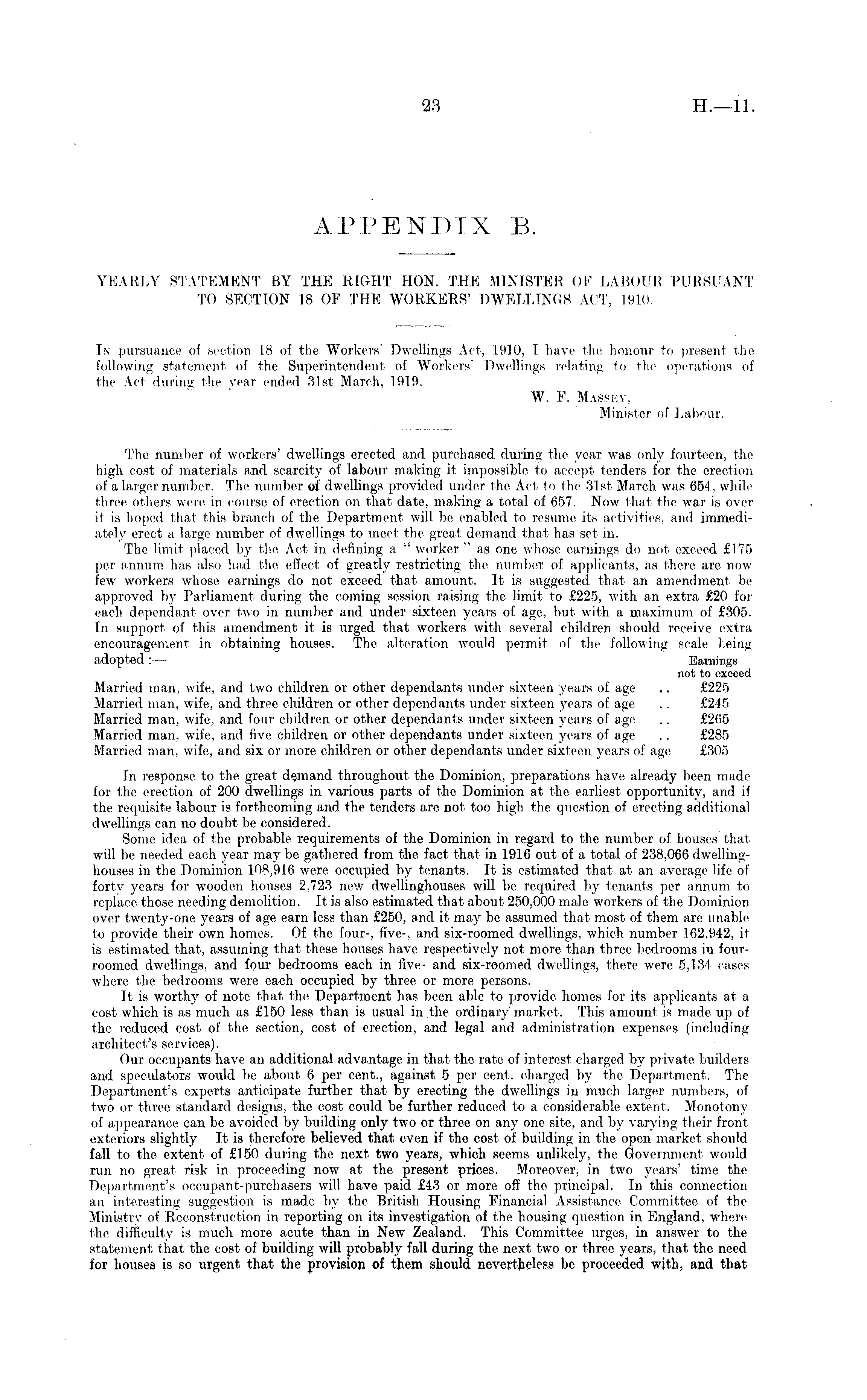 APPENDIX B. YEARLY STATEMENT BY THE RIGHT HON. THE MINISTER OF LABOUR PURSUANT TO SECTION 18 OF THE WORKERS' DWELLINGS ACT, 1910 In pursuance of section 18 of the Workers' Dwellings Act, 1910, I have the honour to present the following statement of the Superintendent of Workers' Dwellings relating to the operations of the Act during the year ended 31st March, 1919. W. F. Massky, Minister of Labour. The number of workers' dwellings erected and purchased during the year was only fourteen, the high cost of materials and scarcity of labour making it impossible to accept tenders for the erection of a larger number. The number of dwellings provided under the Act to the. 31st March was 654, while three others were in course of erection on that date, making a total of 657. Now that the war is over it is hoped that this branch of the. Department will be enabled to resume its activities, and immediately erect a large number of dwellings to meet the great demand that has set in. The limit placed by the Act in defining a " worker " as one whose earnings do not exceed £175 per annum has also had the effect of greatly restricting the number of applicants, as there are now few workers whose earnings do not exceed that amount. It is suggested that an amendment be approved by Parliament during the coming session raising the limit to £225, with an extra £20 for each dependant over two in number and under sixteen years of age, but with a maximum of £305. In support of this amendment it is urged that workers with several children should receive extra encouragement in obtaining houses. The alteration would permit of the following scale being adopted :— Earnings not to exceed Married man, wife, and two children or other dependants under sixteen years of age .. £225 Married man, wife, and three children or other dependants under sixteen years of age .. £245 Married man, wife, and four children or other dependants under sixteen years of age .. £265 Married man, wife, and five children or other dependants under sixteen years of age . . £285 Married man, wife, and six or more children or other dependants under sixteen years of age £305 In response to the great demand throughout the Dominion, preparations have already been made for the erection of 200 dwellings in various parts of the Dominion at the earliest opportunity, and if the requisite labour is forthcoming and. the tenders are not too high the question of erecting additional dwellings can no doubt be considered. Some idea of the probable requirements of the Dominion in regard to the number of houses that will be needed each year may be gathered from the fact that in 1916 out of a total of 238,066 dwellinghouses in the Dominion 108,916 were occupied by tenants. It is estimated that at an. average life of forty years for wooden houses 2,723 new dwellinghouses will be required by tenants per annum to replace those needing demolition. It is also estimated that about 250,000 male workers of the Dominion over twenty-one years of age earn less than £250, and it may be assumed that most of them are unable to provide their own homes. Of the four-, five-, and six-roomed dwellings, which number 162,942, it is estimated that, assuming that these houses have respectively not more than three bedrooms in fourroomed dwellings, and four bedrooms each in five- and six-roomed dwellings, there were 5,134 cases where the bedrooms were each occupied by three or more persons. It is worthy of note, that the Department has been able to provide homes for its applicants at a cost which is as much as £150 less than is usual in the ordinary market. This amount is made up of the reduced cost of the section, cost of erection, and legal and administration expenses (including architect's services). Our occupants have an additional advantage in that the rate of interest charged by private builders and speculators would be about 6 per cent., against 5 per cent, charged by the Department. The Department's experts anticipate further that by erecting the dwellings in much larger numbers, of two or three standard designs, the cost could be further reduced to a considerable extent. Monotony of appearance can be avoided by building only two or three on any one site, and by varying their front exteriors slightly It is therefore believed that even if the cost of building in the open market should fall to the extent of £150 during the next two years, which seems unlikely, the Government would run no great risk in proceeding now at the present prices. Moreover, in two years' time the Department's occupant-purchasers will have paid £43 or more off the principal. In this connection an interesting suggestion is made by the British Housing Financial Assistance Committee of the Ministry of Reconstruction in reporting on its investigation of the housing question in England, where the difficulty is much more acute than in New Zealand. This Committee urges, in answer to the statement that the cost of building will probably fall during the next two or three years, that the need for houses is so urgent that the provision of them should nevertheless be proceeded with, and that