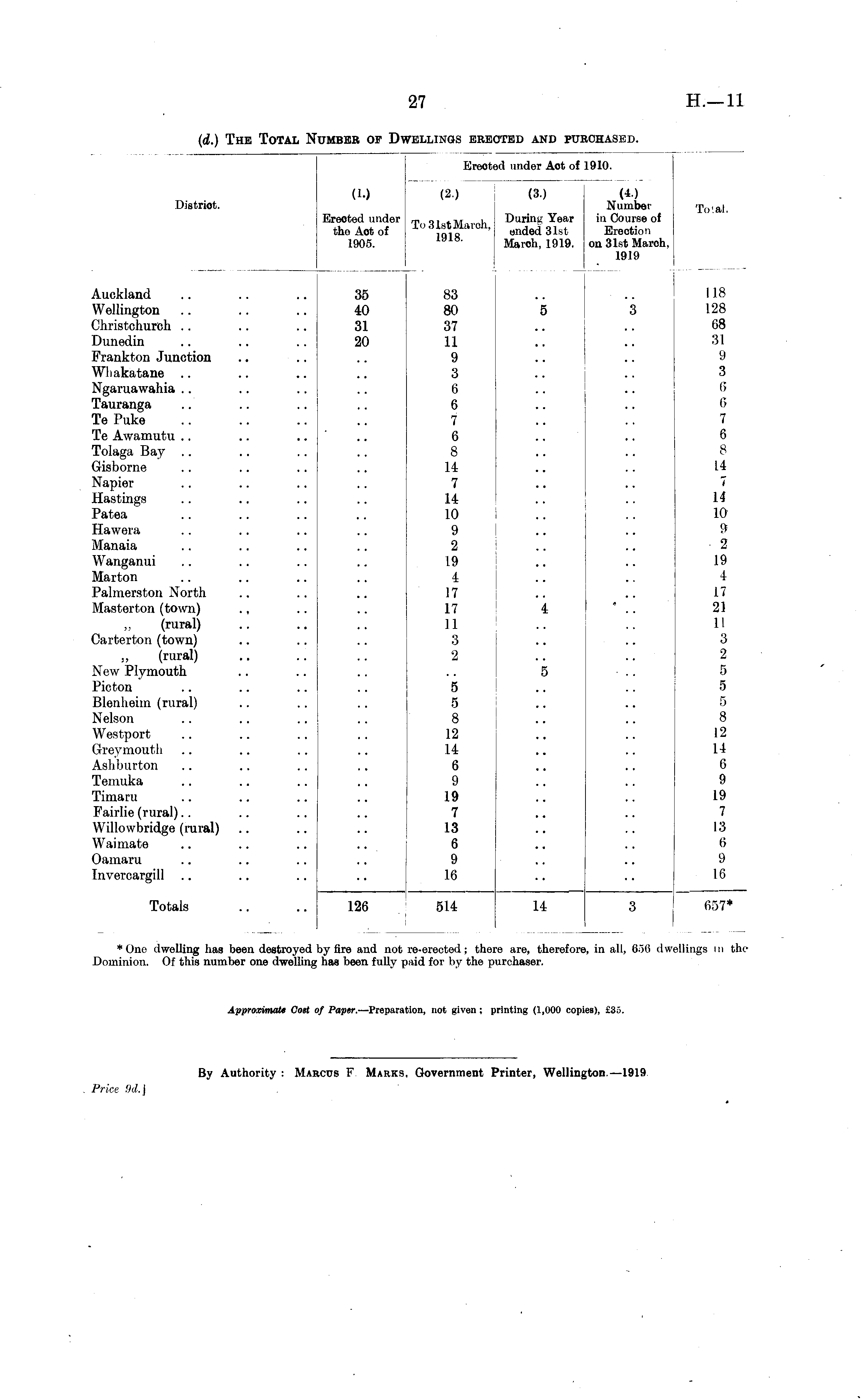 Ereoti id under Aot of 1910. Distriot. (b) Ereoted under the Aot of 1905. (2.) To 31st March, 1918. (3.) During Year ended 31st Maroh, 1919. (4) Number in Course of Erection on 31st Maroh, 1919 Total. i I Auckland. Wellington Christchurch Dunedin Frankton Junction .. Whakatane Ngaruawahia Tauranga Te Puke Te Awamutu Tolaga Bay Gisborne Napier Hastings Patea 35 40 31 20 88 80 87 11 9 3 6 6 7 6 8 14 7 II 10 9 2 L9 4 17 17 11 3 2 5 3 118 128 68 31 Hawera Manaia Wanganui Marton Palmerston North Masterton (town) ., (rural) Carterton (town) (rural) New Plymouth Picton Blenheim (rural) Nelson Westport Greymouth Ash burton Temuka Timaru Fairlie (rural) Willowbridge (rural) Waimate I I 4 4 9 3 G G 7 6 8 14 7 14 10 3 ■ 2 19 4 17 21 11 3 2 5 5 5 8 12 14 6 9 19 7 13 6 9 16 5 5 8 12 II 6 9 19 7 13 6 9 16 5 Oamaru Invercargill Totals 126 514 14 3 657* * One dwelling has been destroyed 1 Dominion. Of this number one dwelling jy fire and not re-erected; ther has been fully paid for by the pi 'e are, therefon urchaser. i, in all, 656 d illings in the