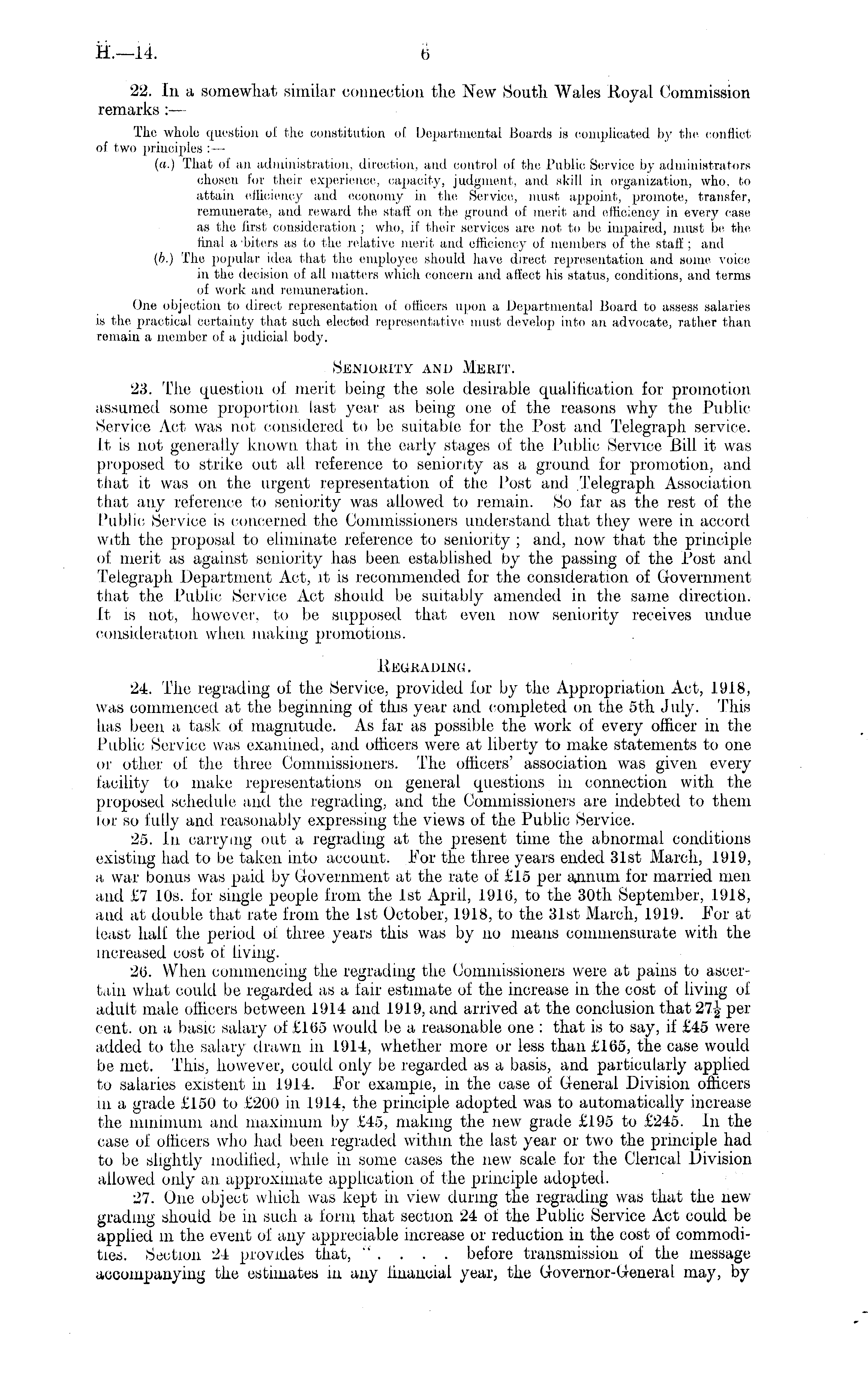 22. In a somewhat similar connection the New South Wales Royal Commission remarks : — The whole question ol the constitution of Departmental Boards is complicated by the conflict of two principles :— (a.) That of an administration, direction, and control of the Public Service by administrators chosen for their experience, capacity, judgment, and skill in organization, who, to attain efficiency and economy in the Service, must appoint, promote, transfer, remunerate, and reward the staff on the ground of merit and efficiency in every case as tho first consideration ; who, if their services are not to be impaired, must be the final arbiters as to the relative merit and efficiency of members of the staff ; and (6.) The popular idea that the employee should have direct representation and some voice in the decision of all matters which concern and affect his status, conditions, and terms of work and remuneration. One objection to direct representation of officers upon a Departmental Board to assess salaries is the practical Certainty that such elected representative must develop into an advocate, rather than remain a member of a judicial body. Seniority and Merit. 23. The question of merit being the sole desirable qualification for promotion assumed some proportion last year as being one of the reasons why the Public Service Act was not considered to be suitable for the Post and Telegraph service. It is not generally known that in the early stages of the Public Service Bill it was proposed to strike out all reference to seniority as a ground for promotion, and that it was on the urgent representation of the Post and .Telegraph Association that any reference to seniority was allowed to remain. So far as the rest of the Public Service is concerned the Commissioners understand that they were in accord with the proposal to eliminate reference to seniority ; and, now that the principle of merit as against seniority has been established by the passing of the Post and Telegraph Department Act, it is recommended for the consideration of Government that the Public Service Act should be suitably amended in the same direction. It is not, however, to be supposed that even now seniority receives undue consideration when making promotions. Reukaoino. 24. The regrading of the Service, provided for by the Appropriation Act, 1918, was commenced, at the beginning of this year and completed on the sth July. This has been a task of magnitude. As far as possible the work of every officer in the Public Service was examined, and officers were at liberty to make statements to one or other of the three Commissioners. The officers' association was given every facility to make representations on general questions in connection with the proposed schedule and the regrading, and the Commissioners are indebted to them lor so fully and reasonably expressing the views of the Public Service. 25. In carrying out a regrading at the present time the abnormal conditions existing had to be taken into account. For the three years ended 31st March, 1919, a war bonus was paid by Government at the rate of £15 per annum for married men and £7 10s. for single people from the Ist April, 1916, to the 30th September, 1918, and at double that rate from the Ist October, 1918, to the 31st March, 1919. For at least half the period of three years this was by no means commensurate with the increased cost of living. 26. When commencing the regrading the Commissioners were at pains to ascertain what could be regarded as a fair estimate of the increase in the cost of living of adult male officers between 1914 and 1919, and arrived at the conclusion that 27| per cent, on a basic salary of £165 would be a reasonable one : that is to say, if £45 were added to the salary drawn in 1914, whether more or less than £165, the case would be met. This, however, could only be regarded as a basis, and particularly applied to salaries existent in 1914. For example, in the case of General Division officers in a grade £150 to £200 in 1914, the principle adopted was to automatically increase the minimum and maximum by £45, making the new grade £195 to £245. In the case of officers who had been regraded within the last year or two the principle had to be slightly modified, while in some cases the new scale for the Clerical Division allowed only an approximate application of the principle adopted. 27. One object which was kept in view during the regrading was that the new grading shouid be in such a form that section 24 of the Public Service Act could be applied m the event of any appreciable increase or reduction in the cost of commodities. Section 24 provides that, " . . . . before transmission of the message accompanying the estimates in any financial year, the Governor-General may, by