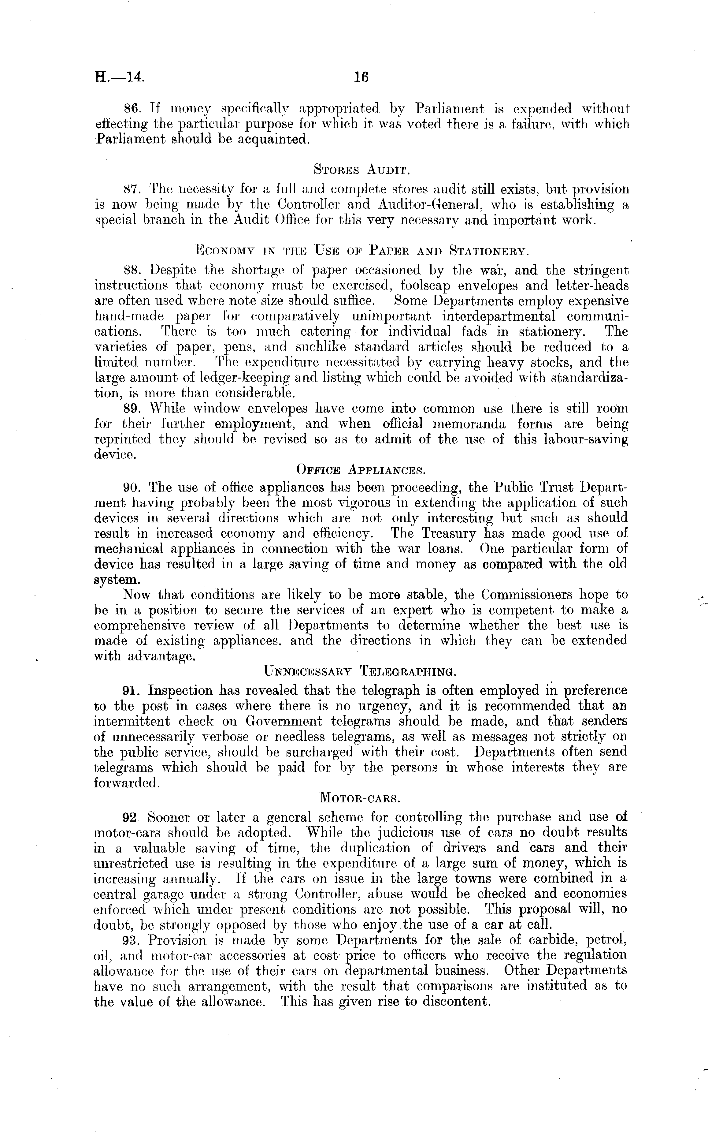 86. Tf money specifically appropriated by Parliament is expended without effecting the particular purpose for which it was voted there is a failure, with which Parliament should be acquainted. Stores Audit. 87. The necessity for a full and complete stores audit still exists, but provision is now being made by the Controller and Auditor-General, who is establishing a special branch in the Audit Office for this very necessary and important work. Economy tn the Use of Paper and Stationery. 88. Despite the shortage of paper occasioned by the war, and the stringent instructions that economy must be exercised, foolscap envelopes and letter-heads are often used where note size should suffice. Some Departments employ expensive hand-made paper for comparatively unimportant interdepartmental communications. There is too much catering for individual fads in stationery. The varieties of paper, pens, and suchlike standard articles should be reduced to a limited number. The expenditure necessitated by carrying heavy stocks, and the large amount of ledger-keeping and listing which could be avoided with standardization, is more than considerable. 89. While window envelopes have come into common use there is still room for their further employment, and when official memoranda forms are being reprinted they should be revised so as to admit of the use of this labour-saving device. Office Appliances. 90. The use of office appliances has been proceeding, the Public Trust Department having probably been the most vigorous in extending the application of such devices in several directions which are not only interesting but such as should result in increased economy and efficiency. The Treasury has made good use of mechanical appliances in connection with the war loans. One particular form of device has resulted in a large saving of time and money as compared with the old system. Now that conditions are likely to be more stable, the Commissioners hope to be in a position to secure the services of an expert who is competent to make a comprehensive review of all Departments to determine whether the best use is made of existing appliances, and the directions in which they can be extended with advantage. Unnecessary Telegraphing. 91. Inspection has revealed that the telegraph is often employed in preference to the post in cases where there is no urgency, and it is recommended that an intermittent check on Government telegrams should be made, and that senders of unnecessarily verbose or needless telegrams, as well as messages not strictly on the public service, should be surcharged with their cost. Departments often send telegrams which should be paid for by the persons in whose interests they are forwarded. Motor-cars. 92. Sooner or later a general scheme for controlling the purchase and use of motor-cars should be adopted. While the judicious use of cars no doubt results in a valuable saving of time, the duplication of drivers and cars and their unrestricted use is resulting in the expenditure of a large sum of money, which is increasing annually. If the cars on issue in the large towns were combined in a central garage under a strong Controller, abuse would be checked and economies enforced which under present conditions are not possible. This proposal will, no doubt, be strongly opposed by those who enjoy the use of a car at call. 93. Provision is made by some Departments for the sale of carbide, petrol, oil, and motor-car accessories at cost price to officers who receive the regulation allowance for the use of their cars on departmental business. Other Departments have no such arrangement, with the result that comparisons are instituted as to the value of the allowance. This has given rise to discontent.