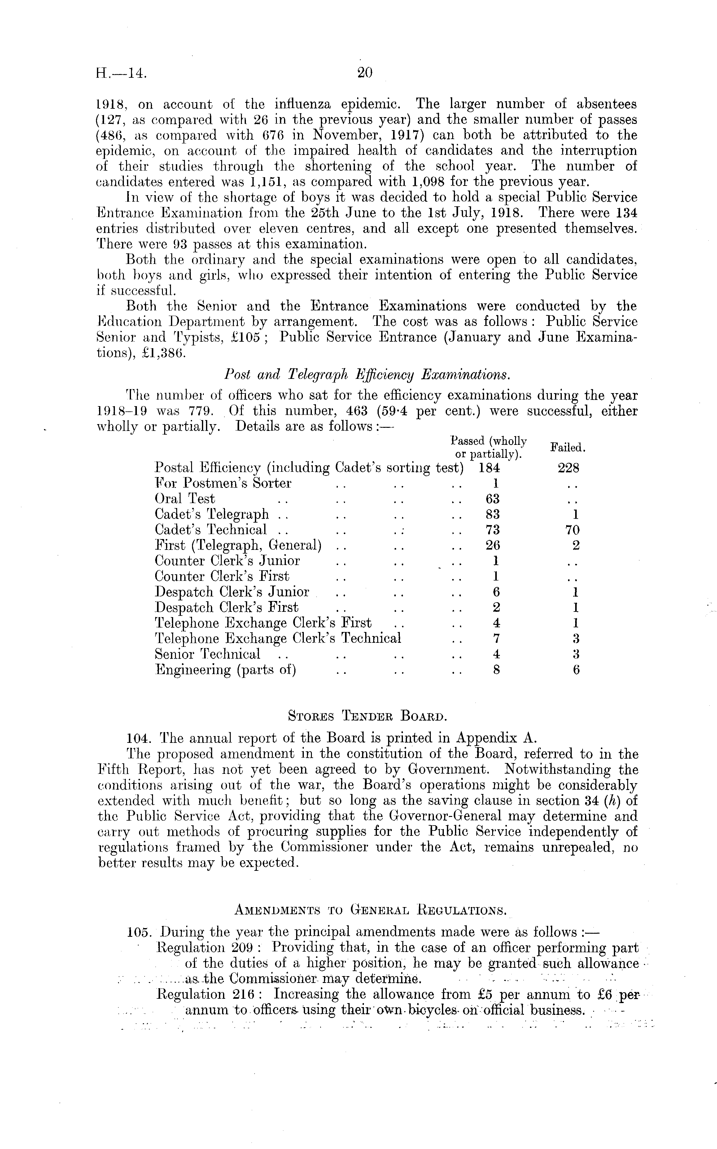 1918, on account of the influenza epidemic. The larger number of absentees (127, as compared with 26 in the previous year) and the smaller number of passes (486, as compared with 676 in November, 1917) can both be attributed to the epidemic, on account of the impaired health of candidates and the interruption of their studies through the shortening of the school year. The number of candidates entered was 1,151, as compared with 1,098 for the previous year. In view of the shortage of boys it was decided to hold a special Public Service Entrance Examination from the 25th June to the Ist July, 1918. There were 134 entries distributed over eleven centres, and all except one presented themselves. There were 93 passes at this examination. Both the ordinary and the special examinations were open to all candidates, both boys and girls, who expressed their intention of entering the Public Service if successful. Both the Senior and the Entrance Examinations were conducted by the Education Department by arrangement. The cost was as follows : Public Service Senior and Typists, £105 ; Public Service Entrance (January and June Examinations), £1,386. Post and Telegraph Efficiency Examinations. The number of officers who sat for the efficiency examinations during the year 1918-19 was 779. Of this number, 463 (59-4 per cent.) were successful, either wholly or partially. Details are as follows : — Passed (wholly d or partially). Postal Efficiency (including Cadet's sorting test) 184 228 For Postmen's Sorter .. .. .. 1 Oral Test . . . . . . 63 Cadet's Telegraph .. .. .. 83 1 Cadet's Technical . . . . .: 73 70 First (Telegraph, General) .. .. 26 2 Counter Clerk's Junior .. .. . . 1 Counter Clerk's First . . . . .. 1 Despatch Clerk's Junior .. .. .. 6 1 Despatch Clerk's First . . .. .. 2 1 Telephone Exchange Clerk's First . . . . 4 1 Telephone Exchange Clerk's Technical 7 3 Senior Technical .. .. .. .. 4 3 Engineering (parts of) . . . . . . 8 6 Stores Tender Board. 104. The annual report of the Board is printed in Appendix A. The proposed amendment in the constitution of the Board, referred to in the Fifth Report, has not yet been agreed to by Government. Notwithstanding the conditions arising out of the war, the Board's operations might be considerably extended with much benefit; but so long as the saving clause in section 34 (h) of the Public Service Act, providing that the Governor-General may determine and carry out methods of procuring supplies for the Public Service independently of regulations framed by the Commissioner under the Act, remains unrepealed, no better results may be expected. Amendments to General Regulations. 105. During the year the principal amendments made were as follows :—• Regulation 209 : Providing that, in the case of an officer performing part of the duties of a higher position, he may be granted such allowance :•' .........as. the Commissioner may determine. ....... ..'. Regulation 216 : Increasing the allowance from £5 per annum to £6 per- :...-- annum to officers- using their own- bicycles- on official business. -