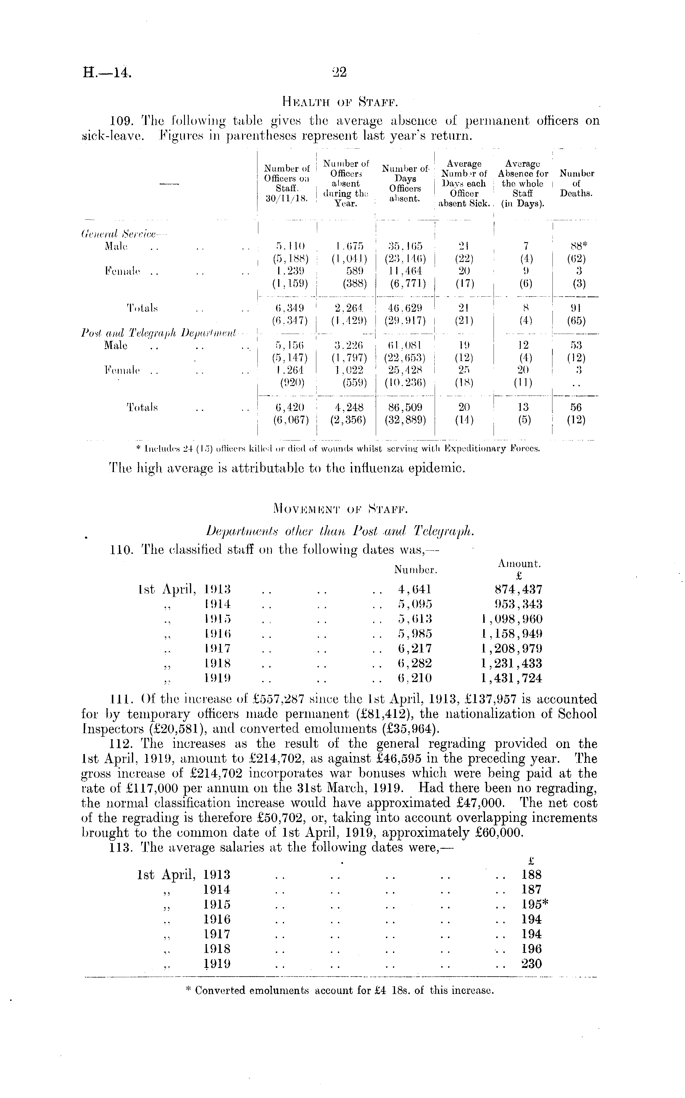 The high average is attributable to the influenza epidemic. Movement of Staff. Departments other than Post and Telegraph. 110. The classified staff on the following dates was, — M , Amount. Number. ~ Ist April, 1913 .. .. .. 4,641 874,437 1914 .. .. .. 5,095 953,343 1915 .. .. .. 5,013 1,098,960 1916 .. .. ..5,985 1,158,949 1917 .. .. .. 6,217 1,208,979 1918 .. .. ..6,282 1,231,433 1919 .. .. .. 6,210 1,431,724 111. Of the increase of £557,287 since the Ist April, 1913, £137,957 is accounted for by temporary officers made permanent (£81,412), the nationalization of School Inspectors (£20,581), and converted emoluments (£35,964). 112. The increases as the result of the general regrading provided on the Ist April, 1919, amount to £214,702, as against £46,595 in the preceding year. The gross increase of £214,702 incorporates war bonuses which were being paid at the rate of £117,000 per annum on the 31st March, 1919. Had there been no regrading, the normal classification increase would have approximated £47,000. The net cost of the regrading is therefore £50,702, or, taking into account overlapping increments brought to the common date of Ist April, 1919, approximately £60,000. 113. The average salaries at the following dates were, — £ Ist April, 1913 . . . . . . . . . . 188 1914 .. .. .. .. ..187 1915 .. .. .. .. .. 195* 1916 .. .. .. .. ..194 1917 .. . . . . . . .. 194 1918 .. .. . . . . .. 196 1919 . . . . . . .. .. 230