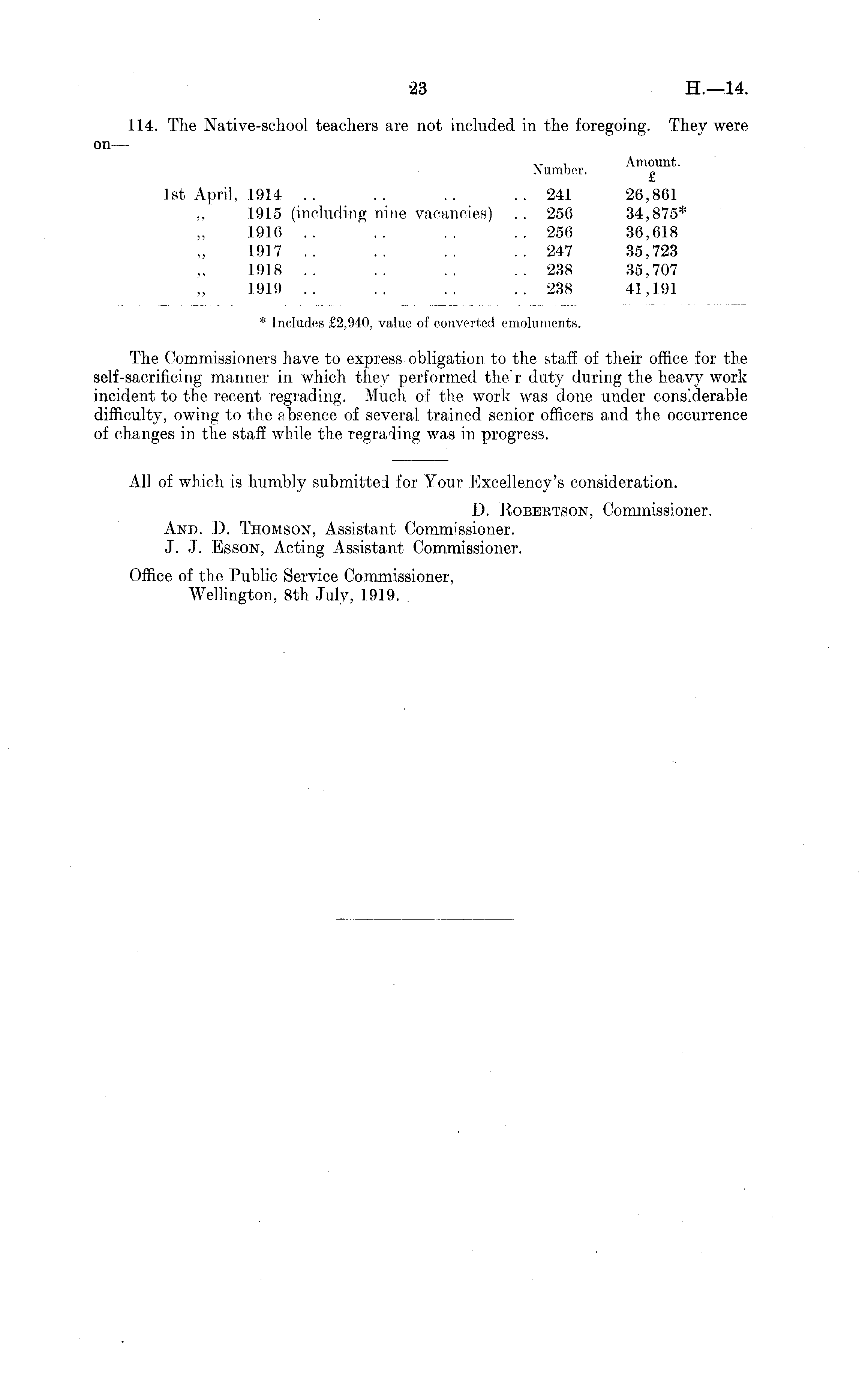 The Commissioners have to express obligation to the staff of their office for the self-sacrificing maimer in which they performed the'r duty during the heavy work incident to the recent regrading. Much of the work was done under considerable difficulty, owing to the absence of several trained senior officers and the occurrence of changes in the staff while the regrading was in progress. All of which is humbly submitted for Your Excellency's consideration. D. Eobektson, Commissioner. And. D. Thomson, Assistant Commissioner. J. J. Esson, Acting Assistant Commissioner. Office of the Public Service Commissioner, Wellington, Bth July, 1919.