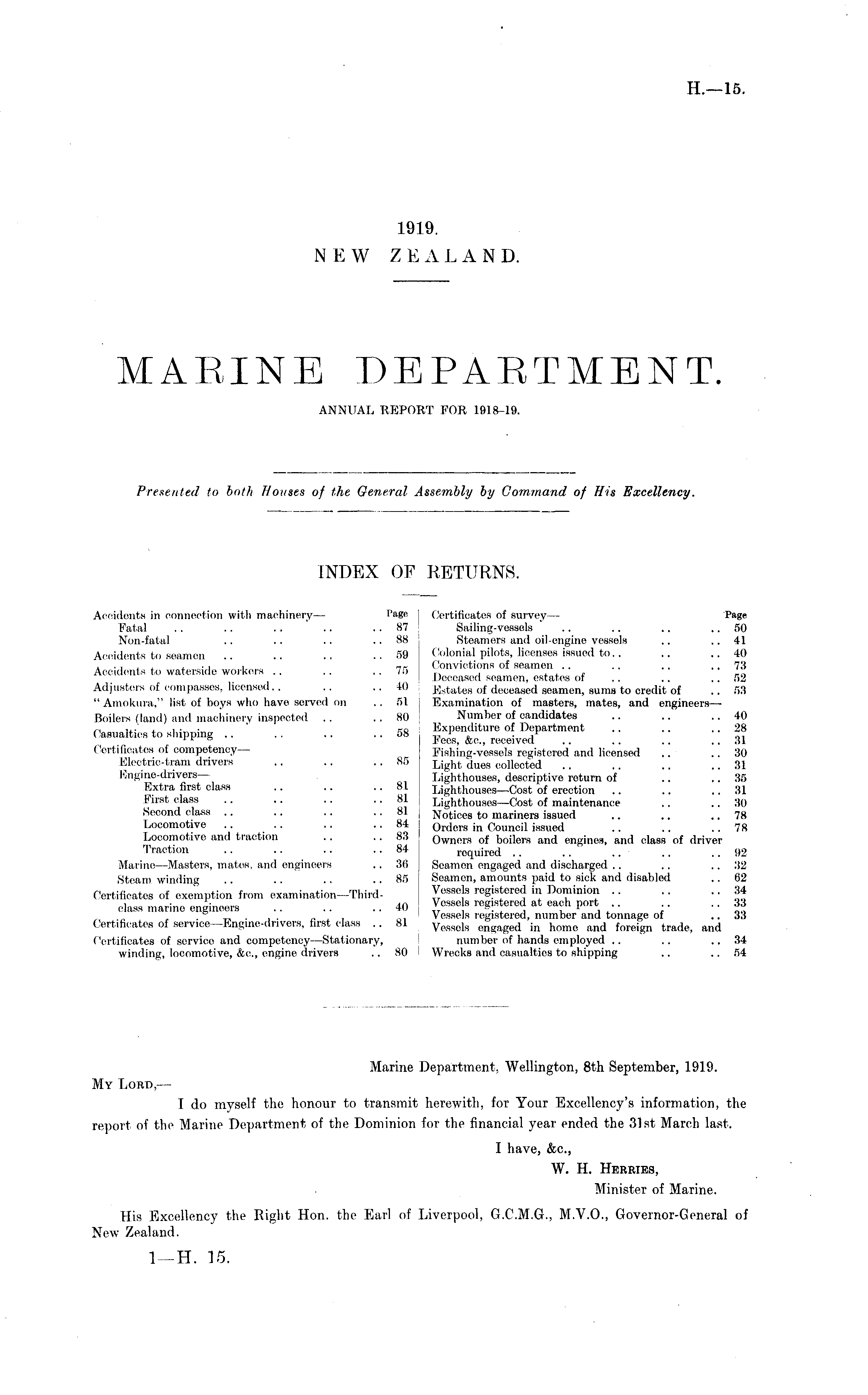 Marine Department, Wellington, Bth September, 1919. My Lord, — I do myself the honour to transmit herewith, for Your Excellency's information, the report of the Marine Department of the Dominion for the financial year ended the 31st March last. I have, &c, W. H. Hereies, Minister of Marine. His Excellency the Right Hon. the Earl of Liverpool, G.C.M.G., M.V.0., Governor-General of New Zealand.