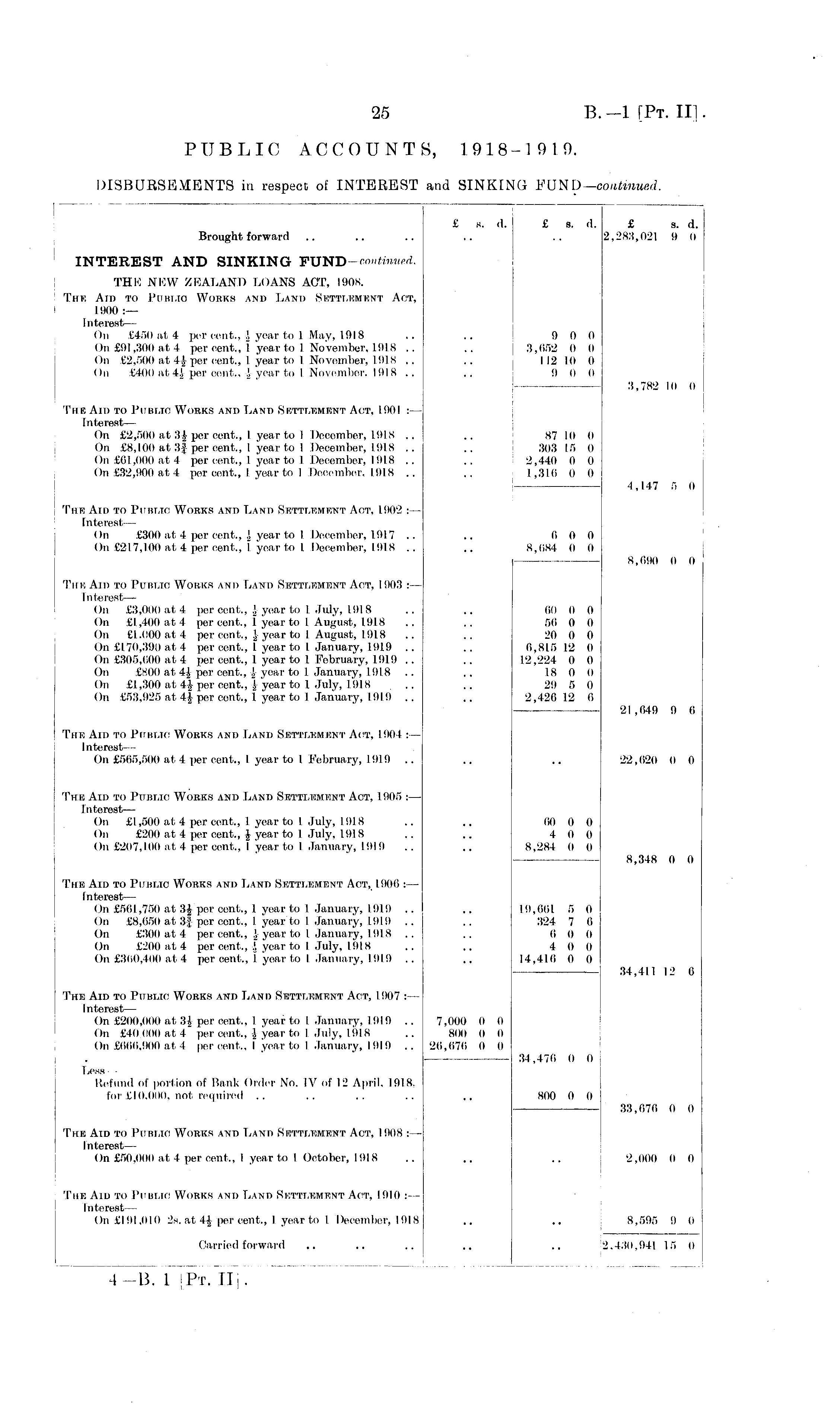 £ s. d. £ s. d. £ 2,283,021 s. d. 9 0 Brought forward INTEREST AND SINKING FUND-continued. THE NEW ZEALAND LOANS ACT, 1908. The Aid to Public Works and Land Settlement Act, 1900 :— Interest- — On £450 at 4 per cent., I year to 1 May, 1918 On £91,300 at 4 per cent., 1 year to 1 November, 1918 .. On £2,500 at 4J per cent., 1 year to 1 November, 1918 .. On £400 at 4 L por cent., J year to I November. 191 8 .. 9 0 0 3,052 0 0 I 12 10 0 9 (I 0 The Aid to Public Works and Land Settlement Act, 1901 : — Interest— On £2,500 at 3J per cent., I. year to I December, 1918 .. On £8,100 at 3-f per cent., 1 year to 1 December, 1918 .. On £61,000 at 4 per cent., 1 year to 1 December, 1918 .. On £32,900 at 4 per cent., I year to 1 December, 1918 .. 3,782 10 0 " 87 10 0 303 15 0 2,440 0 0 1,316 0 0 4,147 5 0 The Aid to Public Works and Land Settlement Act, 1902 : — Interest — < >n £300 at 4 per cent., -J year to I December, 1.917 .. On £217,100 at 4 per cent., 1 year to 1 December, 1918 .. 6 0 0 8,1184 0 0 8,690 0 0 The Aid to Public Woiucs and Land Settlement Act, 1903 :— InterestOn £3,00(1 at 4 per cent., i year to 1. July, 1918 On £1,400 at 4 percent., I year to 1 August, 1918 On £1.000 at 4 per cent., J- year to 1 August, 1918 On £170,390 at 4 per cent., 1 year to I January, 1919 . . On £305,600 at 4 per cent., 1 year to 1 Fobruary, 1919 .. On £800 at 4-J per cent., \ year to 1 January, 1,918 On £1,300 at 4J per cent., \ year to 1 July, 1918 On £53,925 at 4J per cont., 1 year to 1 January, 1919 60 0 0 56 0 0 20 0 0 6,815 12 0 12,224 0 0 18 0 0 29 5 0 2,426 12 0 The Aid to Public Works and Land Settlement Act, 1904 :— Interest — On £565,500 at 4 per cent., 1 year to 1 February, 1919 .. 21,649 9 6 22,620 0 0 The Aid to Public Works and Land Settlement Act, 1905 : — Intorest— On £1,500 at 4 per cent., 1 year to 1 July, 1918 On £200 at 4 per cent., \ year to 1 July, 1918 On £207,100 at 4 per cent., I year to I January, 1919 lid 0 0 4 0 0 8,284 0 (I lid 0 0 8,348 0 0 4 0 0 8,284 0 0 The Aid to Public Works and Land Settlement Act, 1.906 :— Interest — On £661,750 at 3| per cent., 1 year to 1 January, 1919 .. On £8,650 at 3-J per cont., 1 year to 1 January, 1919 .. On £300 at 4 per cent., \ year to I January, 1918 .. On £200 at 4 per cent., i year to I July, 1918 On £360,400 at 4 per cent., 1 year to I January, 1919 .. 19,661 5 o 19,661 5 0 324 7 6 6 0 (I 4 0 0 14,416 0 0 324 7 6 6 0 (I 4 0 0 14,416 0 0 34,411 12 6 The Aid to Public Works and Land Settlement Act, 1907 : — Interest — On £200,000 at 3| per cent., 1 year to I January, 1919 .. On £40 000 at 4 per cent., J year to 1 July, 1918 On £666,900 at 4 percent., I year to 1 January, 1910 .. 7,000 0 0 800 0 II 26,676 0 0 Less — Refund of portion of Bank Order No. IV of 12 April. 1918. for £10,000, not required .. 34,476 0 0 34,476 0 0 800 0 0 800 0 0 The Aid to Public Works and Land Settlement Act, 1908 :— Interest — On £50,000 at 4 per cent., 1 year to 1 October, 1918 33,676 0 0 2,000 II 0 The Aid to Public Works and Land Settlement Act, 1910 : — Interest— On £191.010 2s. at 4| per cent., 1 year to 1 December, 1918 8,595 9 0 Carried forward 2.430,941 15 0