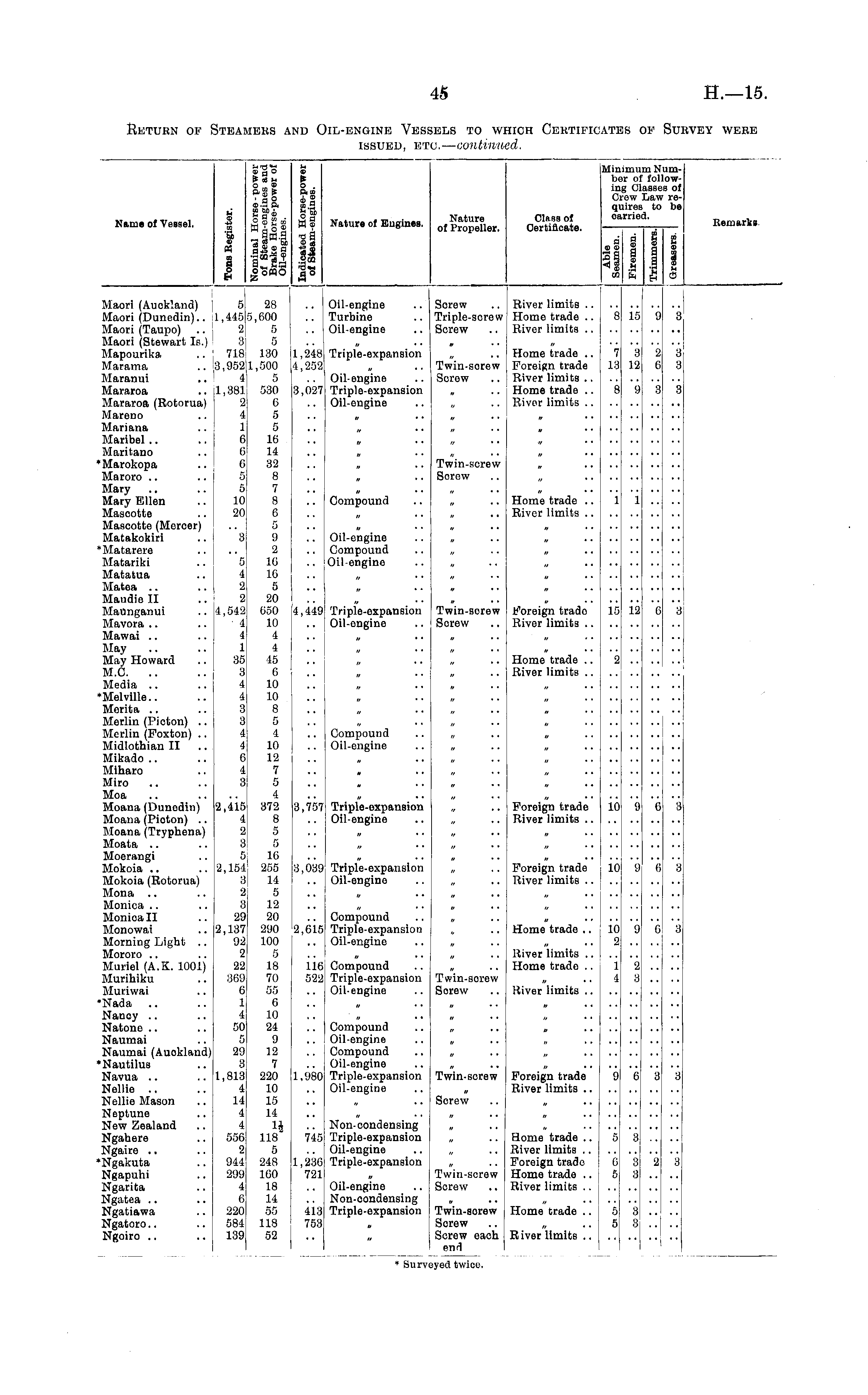 Name of Vessel. bj ui f a; w g {rl 'r"P*P ffl d o o „ ffl p-Sg ' fl ° ffl" Ph ffl Q/J 1. h a ffl ° fflgffl Who; Hal OoBO 2 141 CO i* o . p. uj is if n ffl "S3 ffl it I* Nature of Eugines. Nature of Propeller. Class of Certificate. Minimui ber of ing Cli Crew ] quires carriec nNi foil. usseE Jaw to 1 I. iw1 of rebe Remarks fl § 22 fl 3 a 8 ■* ffl .5 SO SS a I I so u ffl i ffl >H 0 Maori (Auokland) Maori (Dunedin).. Maori (Taupo) .. Maori (Stewart Is.) Mapourika Marama Maranui Mararoa Mararoa (Rotorua) M annul Mariana Maribel Maritano •Marokopa Maroro Mary Mary Ellen Masootte Mascotto (Mercer) Matakokiri •Matarere Matariki Matatua Matea Maudie II Maunganui Mavora Mawai May May Howard M.C. .. Media .. •Melville.. Merita Merlin (Picton) .. Merlin (Foxton) .. Midlothian II Mikado Miharo Miro Moa Moana (Dunedin) Moana (Pioton) .. Moana (Tryphena) Moata Moerangi Mokoia Mokoia (Rotorua) Mona Monica Monioa II Monowai Morning Light .. Mororo Muriel (A.K. 1001) Murihiku Muriwai •Nada Nancy Natone Naumai Naumai (Auokland) •Nautilus Navua Nellie Nellie Mason Neptune New Zealand Ngahere Ngaire •Ngakuta Ngapuhi Ngarita Ngatea Ngatiawa Ngatoro Ngoiro 1,445 i 2 3 j 718 3,952 4 1,381 2 4 1 6 6 6 5 5 10 20 28 5,600 5 5 130 1,500 5 530 6 5 5 16 14 32 8 7 8 6 5 9 2 16 16 5 20 650 10 4 4 45 6 10 10 8 5 4 10 i 12 7 I 5 4 . 372 8 1 5 I 5 . 16 : 255 ! 14 : 5 1 12 1 20 290 ! 100 5 18 70 55 6 10 24 9 12 7 220 10 15 14 14 118 5 248 100 18 14 55 118 52 Oil-engine Turbine Oil-engine Sorew Triple-screw Screw River limits .. Home trado .. River limits .. 8 15 9 3 3 1,248 4,252 Triple-expansion Twin-sorew Screw Home trade .. Foreign trade River limits .. Home trado .. Rivor limits .. 7 13 3 12 2 *3 6 3 3 3 3,027 Oil-engine Triple-expansion Oil-engine 8 9 3 3 3 * . ■ a .. Twin-sorew Sorew Compound Homo trade .. River limits .. i i "3 Oil-engine Compound Oilengine 5 4 2 2 4,542 4 4 1 35 3 4 4 3 3 4 4 6 4 3 4,449 Triple-expansion Oil-ongino Twin-sorew Screw Foreign trado Rivor limits .. Homo trade .. Rivor limits .. is '2 12 *6 3 *3 Compound Oil-engine 2,415 4 2 3 5 2,154 3 2 3 29 2,137 92 2 22 369 6 1 4 50 5 29 3 1,813 4 14 4 4 556 2 944 299 4 6 220 584 139 3,757 Triple-expansion Oil-engine Foreign trade River limits .. to il 6 e '3 3,039 Triple-expansion Oil-engine Foreign trade River limits .. io 9 6 3 6 2,615 Compound Triple-expansion Oil-engine Home trade .. io 2 9 (3 *6 8 iie 522 Compound Triple-expansion Oil-engine River limits .. Home trado .. i 4 *2 3 Twin-sorew Sorew River limits .. Compound Oil-engine Compound Oil-engine Triple.expansion Oil-engine 1,980 Twin-screw Foreign trade River limits .. '9 b 3 3 3 Screw 745 Non-condensing Triple-expansion Oil-engine Triple-expansion Home trade .. River limits .. Foreign trade Home trade .. River limits .. '5 3 1,286 721 6 5 8 3 2 8 2 Oil-engine Non-oondensing Triple-expansion Twin-screw Screw 413 753 Twin-screw Screw Sorew eaoh end .yed twice. Home trade .. River limits .. 5 5 3 8 * Survi