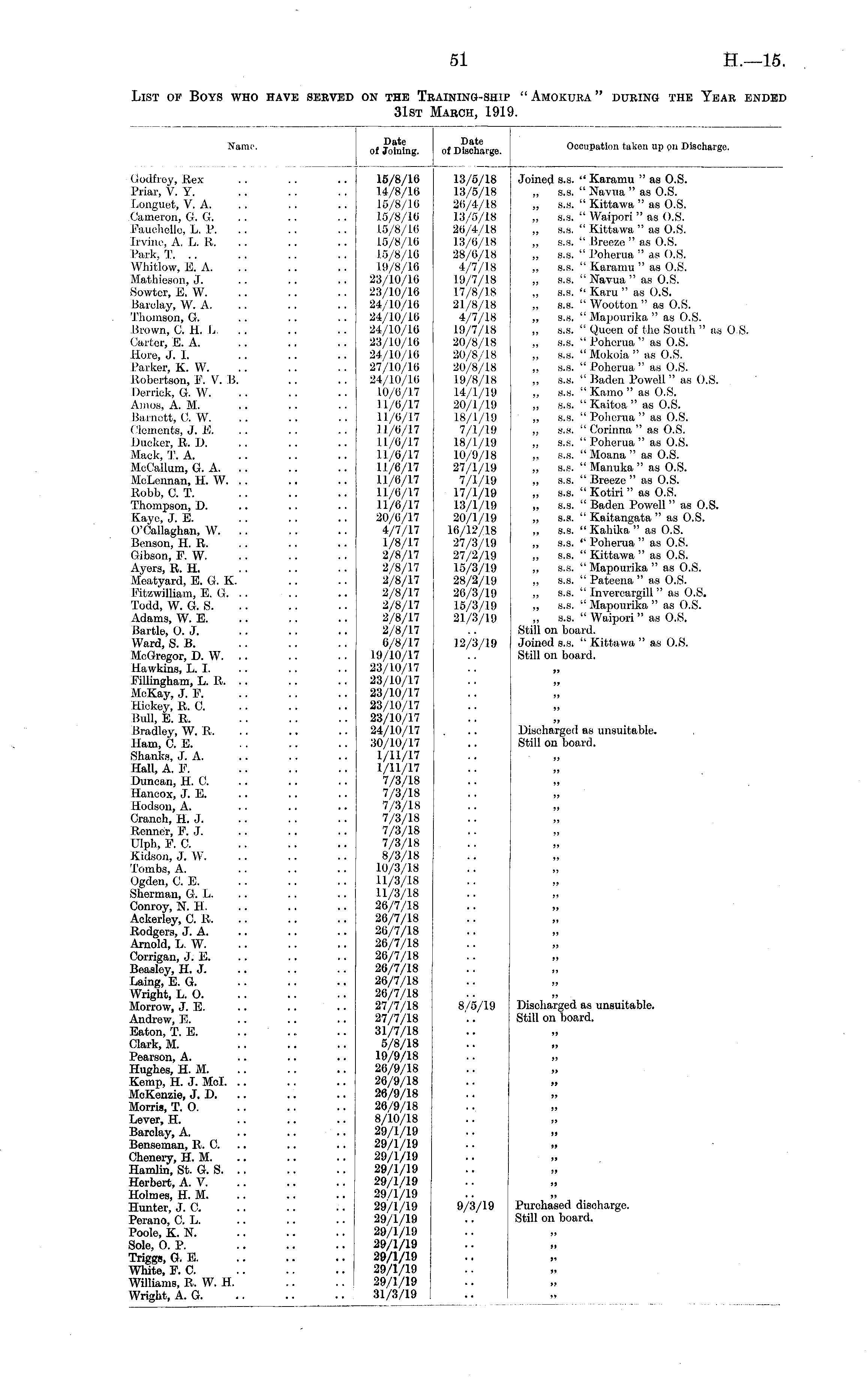 List of Boys who have served on the Training-ship "Amokura" during the Year ended 31st March, 1919.