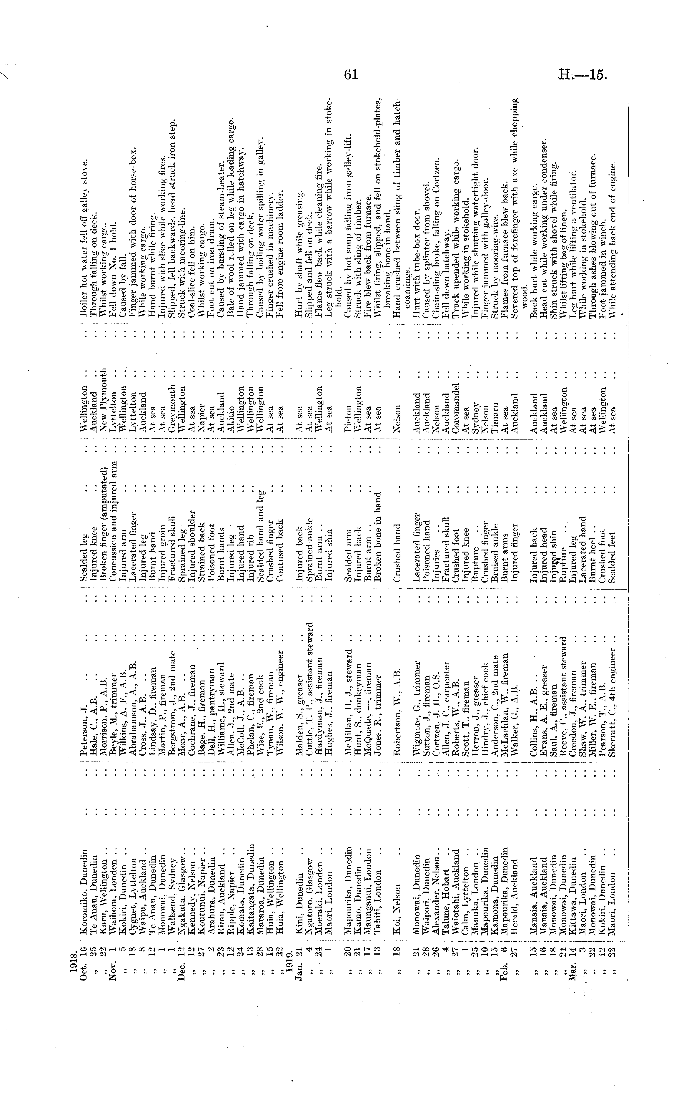 Oct. 16 I Koromiko. Dunedin ., 25 : Te Anau, Dunedin „ 22 Karu, Wellington .. Nov. 1 Waihora. London .. „ 5 Kokiri, Dunedin .. „ 18 ; Cygnet, Lyttelton ,, 8 Waipu, Auckland .. ,, 12 Te Anau, Dunedin ,, 1 j Monowai, Dunedin „ 1 Wallsend, Sydney Dec. 12 Ngakuta. Glasgow.. ,, 12 Kenned}', Nelson .. ,, 27 Koutunui, Napier .. ,, 2 Arahura, Dunedin „ 23 Rimu, Auckland .. „ 12 Ripple, Napier ,, 24 Komata, Dunedin „ 13 Kaitangata, Dunedin ,, 28 Mararoa, Dunedin ,, 15 Huia. Wellington . . „ 22 Huia. Wellington . . 1919. Jan. 21 Kini, Dunedin ,, 4 Ngatoro, Glasgow „ 24 Moeraki, London . . ,, 1 Maori, London ,, 20 Mapourika, Dunedin „ 21 i Kamo. Dunedin „ 17 i Maunganui. London „ 13 Tahiti, London „ 18 Koi, Nelson ,, 21 Monowai, Dunedin ,, 28 Waipori, Dunedin „ 26 Alexander, Nelson.. 4 Talune, Hobart .. „ 27 Waiotahi. Auckland ,, 1 Calm, Lyttelton ,, 25 Manuka, London .. ,, 10 Mapourika. Dunedin „ 15 Kamona, Dunedin Feb. 6 Mapourika. Dunedin „ 27 Herald, Auckland ,, 15 Manaia. Auckland ,, 16 Manaia, Auckland ,, 18 ; Monowai. Dunedin ,, 24 Monowai, Dunedin Mar. 14 ! Kittawa, Dunedin „ 3 j Maori, London „ 22 ; Monowai. Dunedin ,, 12 '■ Kokiri, Dunedin .. ,. 22 . Maori. London Peterson, J. .. Hale, C, A.B. .. .. Morrison, P., A.B. Be vie, M., trimmer .. i Wilkins, A. F., A.B. Abrahamson. A.. A.B. .. Cross, J., A.B. Lindsay, D., fireman Martin, P., fireman Bergstrom. J., 2nd mate .. .. Moar, A., A.B. Cochrane, J., fireman Bage, H, fireman Dell, H, pantryman .. | Williams, H, steward .. Allen, J., 2nd mate .. McColl, J., A.B. .. Phelan, G, fireman Wise, E., 2nd cook Tynan, W.. fireman .. j Wilson. W. W-, engineer .. .. | Maiden, S-, greaser Cuttle, T. P., assistant steward Hardy man, J., fireman Hughes, J., fireman .. McMillan, H. J., steward .. Hunt, S., donkeyman McQuade, —. fireman Jones, R., trimmer .. Robertson, W., A.B. Wigmore, G., trimmer Sutton, J., fireman 4. | Cortzen, J. H. O.S. Allen, J. C, carpenter .. ; Roberts, W.. A.B. Scott, T.. fireman Herron, J., greaser Hindry, J., chief cook Anderson, C, 2nd mate McLachlan. W.. fireman .. Walker, G.. A.B. .. Collins. H. A.B. .. Evans. A. E., greaser Saul, A., fireman Reeve, ('.. assistant steward Creedon, J., fireman Shaw, W. A., trimmer Miller, W. E.. fireman .. Pearson, T., A.B. Skerratt, G, 4th engineer .. .. | Scalded leg .. .. I Wellington .. Injured knee .. .. ] Auckland Bioken finger (amputated) .. ■ New Plymouth Concussion and injured arm .. j Lyttelton Injured arm .. .. \ Wellington .. Lacerated finger .. .. Lyttelton Injured leg .. .. Auckland Burnt hand .. . . At sea Injured groin .. .. At sea Fractured skull .. .. I Greymouth .. Sprained leg .. .. ! Wellington .. Injured shoulder .. .. j At sea Strained back .. .. Napier Poisoned foot .. , .. At sea Burnt hands .. .. j Auckland Injured leg .. .. Akitio Injured hand ., .. Wellington .. Injured rib .. . . Wellington . . Scalded hand and leg .. Wellington .. Crushed finger .. At sea Contused back .. .. At sea .. i Injured back .. .. At sea Sprainedankle .. .. At sea Burnt arm .. .. .. Wellington .. Injured shin .. .. I At sea Scalded arm .. .. Picton Injured back .. .. Wellington .. Burnt arm .. .. .. At sea Broken bone in hand .. At sea Crushed hand .. .. Nelson Lacerated finger .. .. Auckland Poisoned hand .. .. Auckland Inj uries .. .. .. ; Nelson .. i Fractured skull .. . . Auckland Crushed foot .. .. | Coromandel .. Injured knee .. .. At sea Rupture .. .. .. Sydney Crushed finger .. .. Nelson Bruised ankle .. .. Timaru Burnt arms .. .. I At sea Injured finger .. .. | Auckland Injured back .. .. Auckland Injured hear! .. .. Auckland Injured shin .. .. j At sea Rupture .. .. .. I Wellington .. Injured leg .. .. At sea Lacerated hand .. .. j At sea Burnt heel . . .. .. | At sea Crushed foot .. .. j Wellmgton .. Scalded feet .. .. At sea .. I Boiler hot water fell off galley-stove. .. i Through falling on deck. Whilst working cargo. Fell down No. I hold. Caused by fall. Finger jammed with door of horse-box. While working cargo. Hand burnt while firing. .. ; Injured with slice while workmg fires. .. ■ Slipped, fell backwards, head struck iron step. Struck with mooring-line. Coal-slice fell on him. Whilst working cargo. Foot cut on iron drum. .. j Caused by bursting of steam-heater. .. i Bale of wool rolled on leg while loading cargo. Hand jammed with cargo in hatchway. .. | Through falling on deck. Caused by boiling water spilling in galley. .. ; Finger crushed in machinery. Fell from engine-room ladder. Hurt by shaft while greasing. Slipped and fell on deck. Flame flew back while cleaning fire. Leg struck with a barrow while workmg in stokehold. Caused by hot sou]) falling from gt»llcy-lift. Struck with sling of timber. Fire blew- back from furnace. Whilst firing, slipped, and fell on stokehold-plates, breaking bone in hand. .. I Hand crushed between sling of timber and hatchcoamings. Hurt with tube-box doer. .. ! Caused by splinter from shovel. Chain-sling broke, falling on Cortzen. Fell down hatchway. Truck upended while working cargo. While working in stokehold. Injured while shutting watertight door. Finger jammed with galley-door. Struck by mooring-wire. .. | Flames from furnace blew back. .. I Severed top of forefinger with axe while choppmg wood. Back hurt while working cargo. Head cut wF.ile working under condenser. .. i Shin struck with shovel while firing. .. ■ Whilst lifting bag of linen. .. | Leg hurt while lifting a ventilator. While working in stokehold. .. i Through ashes blowing cut cf furnace. .. I Foot jammed in winch. While attending back end of engine.