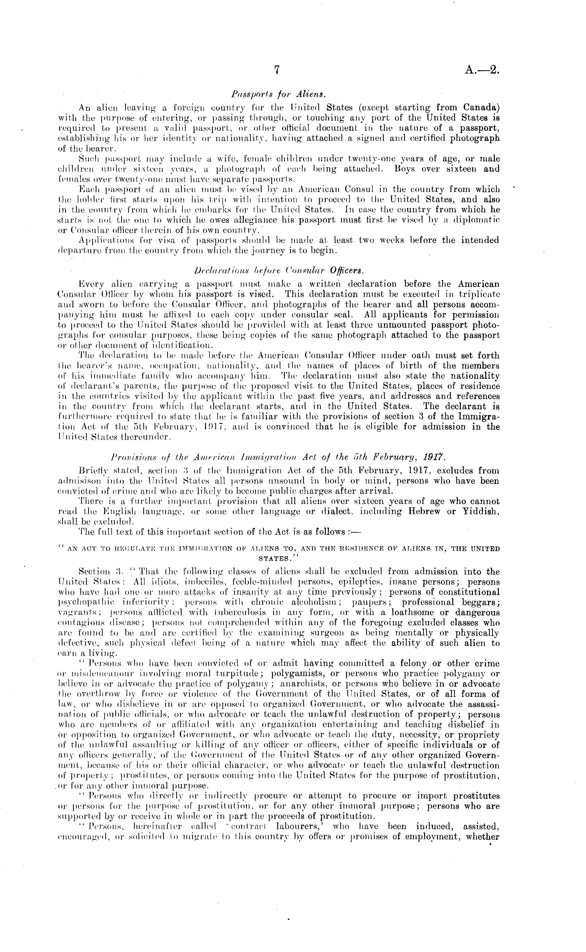 Passports for Aliens. An alien leaving a foreign country for the United States (except starting from Canada) with the purpose of entering, or passing through, or touching any port of the United States is required to present a valid passport, or other official document in the nature of a passport, establishing his or her identity or nationality, having attached, a signed and certified photograph of the bearer. Such passport may include a wife, female children under twenty-one years of age, or male children under sixteen years, a photograph of each being attached. Boys over sixteen and females over twenty-one must have separate passports. - Each passport of an alien must be vised by an American Consul in the country from which the holder first starts upon his trip with intention to proceed to the United States, and also in the country from which he embarks for the United States. In case the country from which he starts is not the one to which he owes allegiance his passport must first be vised by a diplomatic or Consular officer therein of his own country. Applications for visa of passports should lie made at least two weeks before the intended departure from the country from which the journey is to begin. Declarations before Consular Officers. Every alien carrying a passport must make a written declaration before the American Consular Officer by whom his passport is vised. This declaration must be executed in triplicate and sworn to before the Consular Officer, and photographs of the bearer and all persons accompanying him must be affixed to each copy under consular seal. All applicants for permission to proceed to the United States should be provided with at least three unmounted passport photographs for consular purposes, these being copies of the same photograph attached to the passport or other document of identification. The declaration to be made before the American Consular Officer under oatli must set forth the bearer's name, occupation, nationality, and the names of places of birth of the members of his immediate family who accompany him. The declaration must also state the nationality of declarant's parents, the purpose of the proposed visit to the United States, places of residence in the countries visited by the applicant within the past five years, and addresses and references in the country from which the declarant starts, and in the United States. The declarant is furthermore required to state that he. is familiar with the provisions of section 3 of the Immigration Act of the sth February, 1917, and is convinced that he is eligible for admission in the United States thereunder. Provisions of the American, immigration Act of the sth February, 1917. Briefly stated, section 3 of the Immigration Act of the sth February, 1917, excludes from admisison info the United States all persons unsound in body or mind, persons who have been convicted of crime and who are likely to become public charges after arrival. There is a further important provision that all aliens over sixteen years of age who cannot read the English language, or some other language or dialect, including Hebrew or Yiddish, shall be excluded. The full text of this important section of the Act is as follows : — " an act to regulate the immigration of aliens to, and the residence of aliens in, the united STATES." Section 3. " That the following classes of aliens shall be excluded from admission into the United States: All idiots, imbeciles, feeble-minded persons, epileptics, insane persons; persons who have had one or more attacks of insanity at any time previously; persons of constitutional psychopathic inferiority; persons with chronic alcoholism; paupers; professional beggars; vagrants; persons afflicted with tuberculosis in any form, or with a loathsome or dangerous contagious disease; persons not comprehended within any of the foregoing excluded classes who are found to be and are certified by the examining surgeon as being mentally or physically defective, such physical defeel being of a nature which may affect the ability of such alien to earn a living. " Persons who have been convicted of or admit having committed a felony or other crime or misdemeanour involving moral turpitude; polygamists, or persons who practice polygamy or believe in or advocate the practice of polygamy; anarchists, or persons who believe in or advocate the overthrow by force or violence of the Government of the United States, or of all forms of law, or who disbelieve in or are opposed to organized Government, or who advocate the assassination of public officials, or who advocate or teach the unlawful destruction of property; persons who arc members of or affiliated with any organization entertaining and teaching disbelief in or opposition to organized Government, or who advocate or teach (he duty, necessity, or propriety of the unlawful assaulting or killing of any officer or officers, either of specific individuals or of any officers generally, of the Government of the United States or of any other organized Government, because of his or their official character, or who advocate or teach the unlawful destruction of property; prostitutes, or persons corning into (he United States for the purpose of prostitution, or for any other immoral purpose. " Persons who directly or indirectly procure or attempt to procure or import prostitutes or persons for the purpose of prostitution, or for any other immoral purpose; persons who are supported by or receive in whole or in part the proceeds of prostitution. ',' Persons, hereinafter called ' contract labourers,' who have been induced, assisted, encouraged, or solicited to migrate to this country by offers or promises of employment, whether
