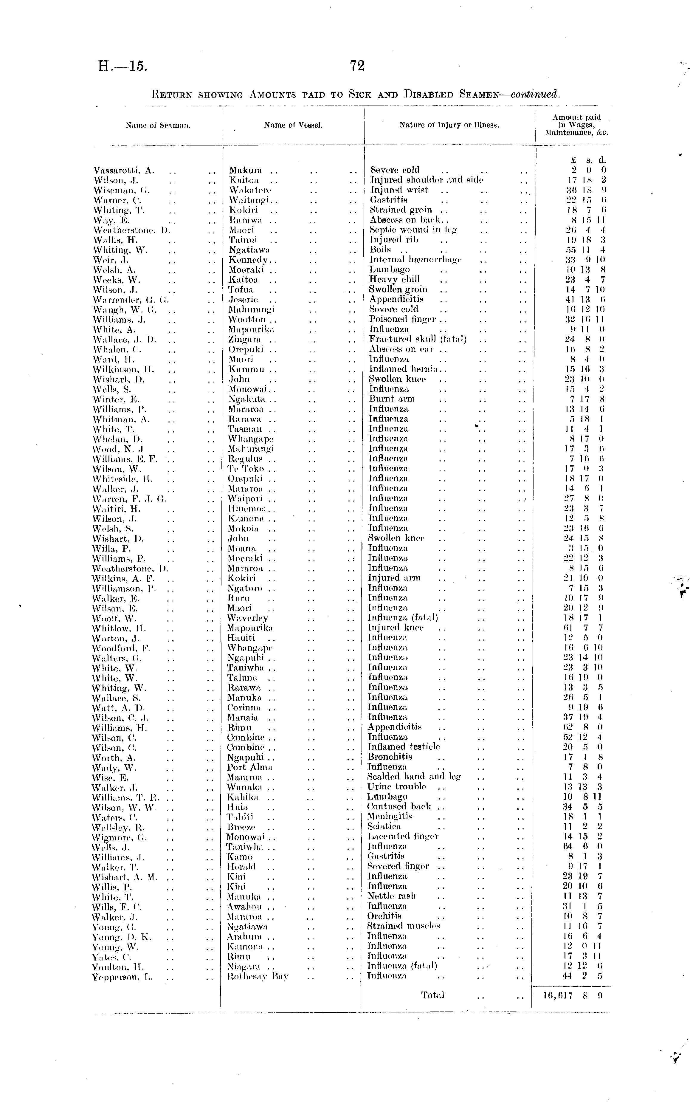Name of Seaman. Name of Vessel. Nature of Injury or Illness. Amount paid in Wages, ! Maintenance, Ac. Vassarotti, A. Wilson, J. Wiseman. G. Warner, C. Whiting, T. Way, \i. Weatherstono, I). Wallis, II. Whiting, W. Weir, J. Welsh, A. Weeks, W. Wilson, .1. Warrcnilcr, G. G. Waugh, W. G. .. Williams, ,1. White, A. Wallace, ,1. I). .. Whaleu, C. Ward. H. Wilkinson. II. Wishart, D. Wells, S. Winter, K. Williams, P. Whitman, A. While, T. Whelan, D. Wood, N. .1 Williams, E. F. .. Wilson, W. Whiteside, If. Walker, .1. Warren, F. J. G. Waitiri. II. Wilson. ,1. Welsh, S. Wishart, I). Willa, P. Williams, P. Weatherstone. I). Wilkins, A. P. .. Williamson, P. .. Walker. E. Wilson. E. Woolf, W. Whitlow. II. W.irlon. ,1. Woodford, P. Walters, G. White, W. White, W. Whiting, W. Wallace, S. Watt. A. I). Wilson, C. ,1. Williams, If. Wilson, G. Wilson, C. Worth, A. Wady, W. Wise, E. Walker. J. Williams. T. R. . . Wilson, W. W. .. Waters. ('. Wellsley, R. Wigmore. G. Wells,.!. Williams, .1. Walker, T. Wishart, A. M. .. Willis. P. White. T. Wills, P. C. Walker. .I. Young. G. Young, I). K. Young, W. Yales. ('. Xoulton, 11. Yepjierson, L. Makura Kaitoa Wakatere Waitangi Kokiri Ra rawa Maori Tainui Ngatiawa Kennedy. . Moeraki Kaitoa Tofua .leseric Mahurangi Wootton'.. Mapourika Zingara .. Orepuki Maori Karamu John Monowai Ngakuta Mararoa , . Rarawa Tasmaii . . Whangape Mahurangi Regulus Te Teko Orojiuki Mararoa Waipori Hinenioa Kamona Mokoia John Moana Moeraki .. Mararoa Kokiri Ngatoro Ruru Maori Waverlev Mapourika Hauiti .. Whangape Ngapuhi Taniwha Talune Rarawa Manuka Corinna Manaia Rimu ( Vnnliine . . (lom bine Ngapuhi Port Alma Mararoa Wanaka Kahika .. Huia Tahiti Breeze Monowai Taniwha Kamo Herald .. Kini Kini Manuka Awahou Mararoa Ngatiawa Arahura Kamona Rimu Niagara . . Rothesay Bay Severe cold Injured shoulder anil side Injured wrist, Gastritis Strained groin Abscess on hack. , Septic wound in leg Injured rib Boils Infernal hemorrhage Lumbago Heavy chill Swollen groin Appendicitis Severe cold Poisoned linger Influenza Pra.-lureil skull (fatal) . . .Abscess on ea r . , Influenza Inflamed hernia Swollen knee Influenza Burnt arm Influenza Influenza Influenza .. *! . Influenza Influenza Influenza Influenza Influenza Influenza Influenza Influenza Influenza [nfluenza Swollen knee Influenza I nil uenza Influenza [njured a rm Influenza Inlluenza [nfluenza [nfluenza (fatal) [njured knee Influenza Influenza Influenza Influenza Influenza Influenza [nfluenza Influenza [nfluenza Appendicitis Inlluenza Inflamed testicle Bronchitis Influenza Scalded hand anil leg Urine trouble Lumbago Contused back Moningii is Seialica Lacerated linger Inlluenza Gastritis Severed linger . . ... Influenza Influenza Nettle rash Influenza Orchitis Strained muscles [nfluenza Influenza Influenza [nfluenza (fatal) Influenza £ s. d. 2 0 0 1.7 IS 2 36 IS 9 22 15 6 15 7 6 8 15 II 26 1 4 I!) IS 3 rn, 11 I 33 9 io Id 13 8 23 4 7 14 7 10 41 13 6 16 12 IO 32 10 I I 9 11 II 24 S II 16 8 2 8 -I 0 15 16 3 23 10 ii 15 4 2 7 17 8 13 14 6 5 IS I 11 -I I SIT 0 17 3 li 7 16 6 IT O 3 IS IT 0 14 5 I 27 s o 23 3 T 12 5 S 23 16 (i 2-1 15 8 3 16 0 22 12 3 8 1.5 6 21 10 0 7 15 3 Hi 17 9 20 12 9 15 17 I 61 7 7 12 5 0 16 6 io 23 I-l io 23 3 10 Hi 19 II 13 3 5 26 5 I 9 19 li 3T 19 -I 62 8 0 52 12 4 20 5 0 IT I s 7 8 0 11 3 4 13 13 3 10 8 I I 34 5 5 18 1 I 112 2 I-l 15 2 64 6 0 8 I 3 9 17 I 23 19 7 20 10 6 1113 7 31 I 5 10 8 7 1116 7 Hi 6 -I 12 (III 17 3 11 12 12 0 ■14 2 5 Total 16.617 8 9