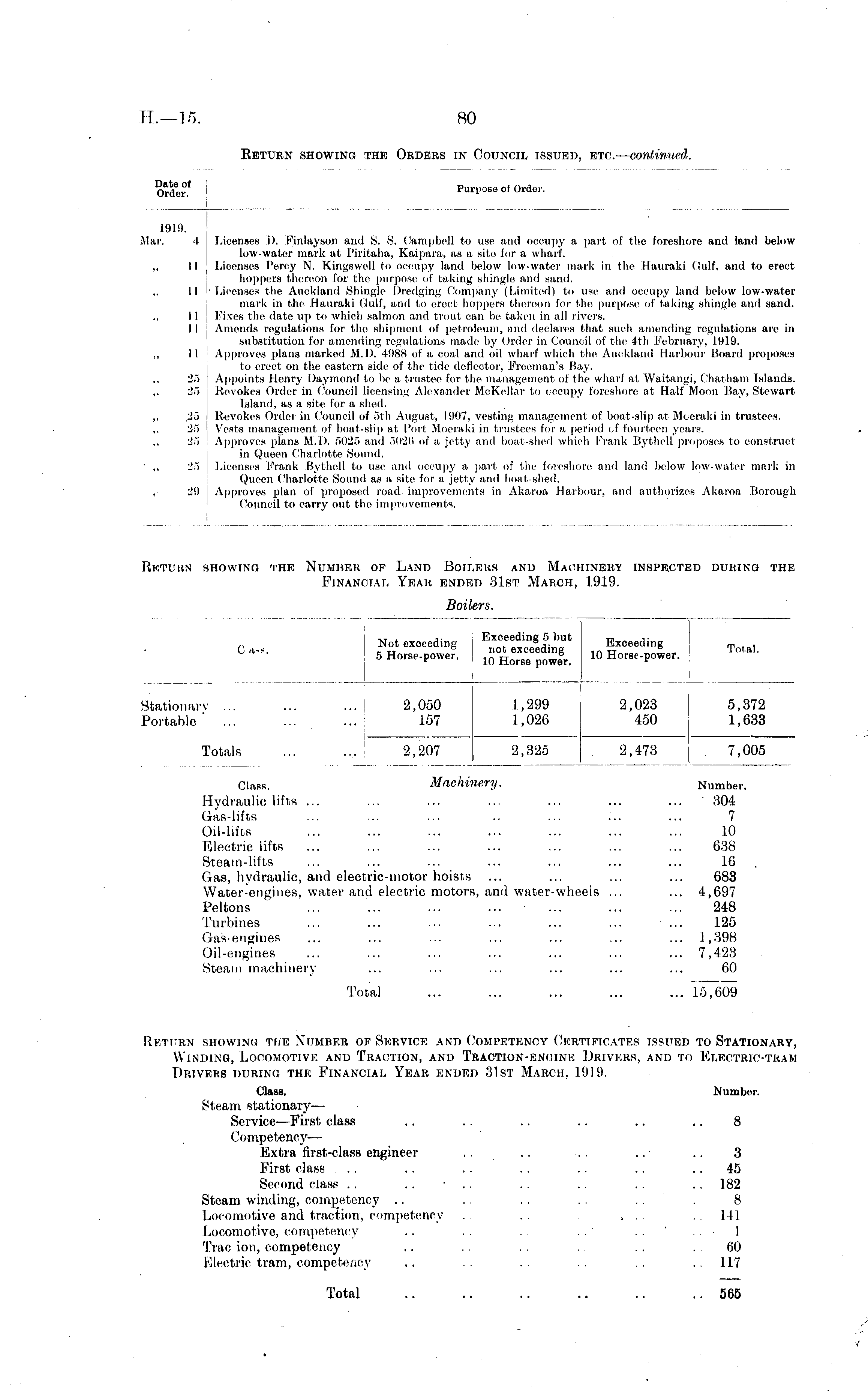 Class. Machinery. Number. Hydraulic lifts ... ... ... ... ... ... ... 304 Gas-lifts ... ... ... .. ... :.. ... 7 Oil-lifts ... ... ... ... ... ... ... 10 Electric lifts ... ... ... ... ... ... ... 638 Steam-lifts ... ... ... ... ... ... ... 16 . Gas, hvdraulic, and electric-motor hoists ... ... ... ... 683 Water-engines, water and electric motors, and water-wheels ... ... 4,697 Peltons ... ... ... ... ... ... ... 248 Turbines ... ... ... ... ... ... ... 125 Gas-engines ... ... ... ... ... ... ... 1,398 Oil-engines ... ... ... ... ... ... ... 7,423 Steam machinery ... ... ... ... ... ... 60 Total ... ... ... ... ... 15,609 Return showing the Number of Service and Competency Certificates issued to Stationary, Winding, Locomotive and Traction, and Traction-engine Drivers, and to Electric-tram Drivers during the Financial Year ended 31st March, 1919. Class. Number. Steam stationary- — Service —First class .. .. .. .. .. .. 8 Competency^ — Extra first-class engineer .. .. .. .. .. 3 First class .. .. ~ .. .. .. 45 Second class . . .. • . . .. . . .. .. 182 Steam winding, competency .. . . . . .. 8 Locomotive and traction', competency .. .. , .. ..11l Locomotive, competency .. . . ' . . . . I Trac ion, competency .. .. . . .60 Electric tram, competency .. .. .. 117 Total .. .. .. .. .. ..565