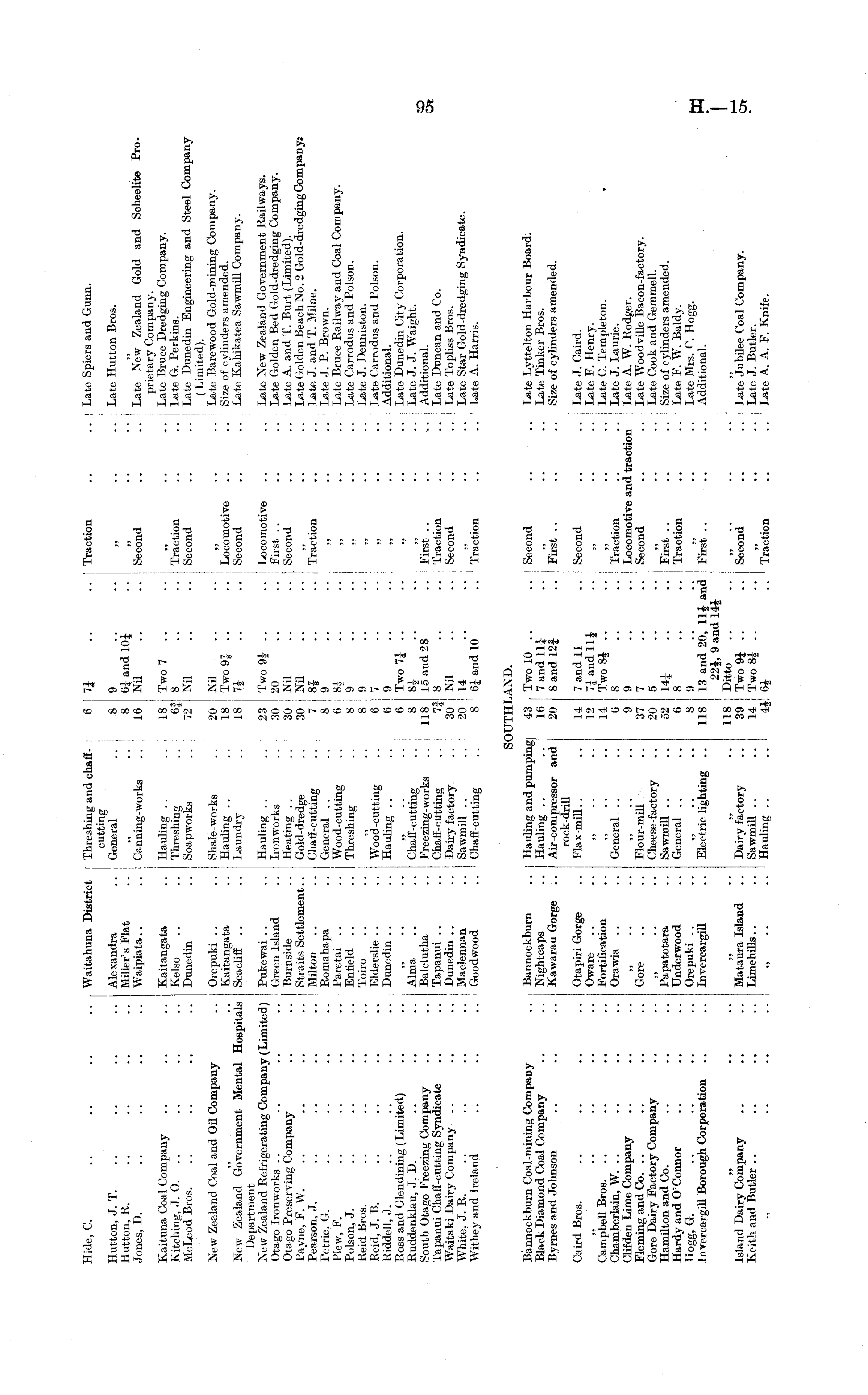 Hide, C. .. .. .. .. Waitahuna District Threshing and chaff- 6 "J .. .. Traction .. .. ! Late Spiers and Gunn. cutting Hutton, J. T. .. .. .. .. Alexandra .. General .. 8 9 .. .. „ .. .. Late Hutton Bros. Hutton, R. .. .. .. .. Miller's Flat .. „ .. 8 6J and 10J .. „ .. ... Jones, D. .. .. .. .. Waipiata.. .. Canning-works .. 16 Nil .. .. Second .. .. Late New Zealand Gold and Seheelite Proprietary Company. Kaituna Coal Company .. .. .. Kaitangata .. Hauling .. .. 18 Two 7 .. .. „ .. .. Late Bruce Dredging Company. Kitching, J. 0. .. .. .. .. Kelso .. .. Threshing .. 6| 8 .. .. Traction .. .. | Late G. Perkins. McLeod Bros. .. .. .. .. Dunedin .. Soapworks .. 72 Nil .. .. Second .. .. ! Late Dunedin Engineering and Steel Company (Limited). New Zealand Coal and Oil Company .. Orepuki .. .. Shale-works .. 20 Nil .. .. „ .. .. Late Barewood Gold-mining Company. „ .. Kaitangata .. Hauling .. .. 18 Two 9| .. .. Locomotive .. .. Size of cylinders amended. New Zealand Government Mental Hospitals Seacliff .. .. Laundry .. 18 7J .. .. Second .. .. Late Ka'hikatea Sawmill Company. Department New Zealand Refrigerating Company (Limited) I Pukewai .. .. Hauling .. .. 23 Two 9J- .. .. Locomotive .. .. Late New Zealand Government Railways. Otago Ironworks .. .. .. .. Green Island .. Ironworks .. 30 20 .. .. First .. .. .. ! Late Golden Bed Gold-dredging Company. Otago Preserving Comjiany .. .. Burnside .. Heating .. .. 30 Nil .. .. Second .. .. ! Late A. and T. Burt (Limited). Payne, F. W. '.. .. .. .. Straits Settlement.. Gold-dredge .. 30 j Nil .. .. „ .. .. Late Golden Beach No. 2 Gold-dredgingCompanyj Pearson, J. .. .. .. .. Milton .. .. Chaff-cutting ... 7 i 8J .. .. Traction .. .. Late J. and T. Milne. Petrie, G. .. .. .. .. | Romahapa .. General .. .. 8 j 9 .. .. „ .. .. Late J. P. Brown. Plew, F. .. .. .. .. I Paretai .. .. Wood-cutting .. 6 81 .. .. „ .. .. Late Bruce Railway and Coal Comjiany. Poison, J. .. .. .. .. Enfield .. .. Threshing .. 8 9 .. .. ,, .. .. Late Carrodus and Poison. Reid Bros. .. .. .. .. j Toiro .. .. „ .. 8 9 .. .. ,, .. .. Late J. Denniston. Reid, J. B. .. .. .. .. I Elderslie .. .. Wood-cutting .. 6 7 .. .. „ .. .. Late Carrodus and Poison. Riddell, J. .. .. .. .. Dunedin .. .. Hauling .. .. 6 9 .. .. „ .. .. Additional. Ross and Glendining (Limited) .. .. ,, .. .. ,, .. .. 6 Two 7J .. .. ,, .. .. i Late Dunedin City Corporation. Ruddenklau, J. D. .. .. .. Alma .. .. Chaff-cutting .. 8 8| .. .. ,, .. .. I Late J. J. Waight. South Otago Freezing Company .. .. Balclutha .. Freezing-works .. 118 15 and 28 .. First .. .. .. Additional. Tapanui Chaff-cutting Syndicate .. .. Tapanui .. .. Chaff-cutting .. 7| 8 .. .. Traction .. .. i Late Duncan and Co. Waitaki Dairy Company .. .. .. Dunedin .. .. Dairy factory .. 30 Nil .. .. Second .. .. Late Topliss Bros. White, J. R. .. .. .. .. | Maclennan .. Sawmill .. .. i 20 14 .. .. „ .. .. Late Star Gold-dredging Syndicate. Withey and Ireland .. .. .. i Goodwood .. Chaff-cutting .. ' 8 6J and 10 .. Traction .. .. ' Late A. Harris. ii 7SOUTHLAND. Bannockburn Coal-mining Company .. Bannockburn .. Hauling and pumping 43 , Two 10 .. .. I Second .. .. Late Lyttelton Harbour Board. Black Diamond Coal Company .. .. Nightcaps .. Hauling .. .. 16 7 and 11J .. „ .. .. Late Tinker Bros. Byrnes and Johnson .. .. .. Kawarau Gorge .. Air-compressor and 20 8 and 12J .. First .. .. .. Size of cylinders amended. rock-drill Caird Bros. .. .. .. .. Ota piri Gorge .. Flax-mill.. .. 14 7 and 11 .. Second .. .. Late J. Caird. Oware .. .. „ .. .. 12 7J and 11 \ .. „ .. .. Late F. Henry. Campbell Bros. .. .. .. .. Fortification .. ,, .. .. 14 Two 8£ .. .. ,, .. .. Late C. Templeton. . Chamberlain, W. .. .. .. .. Orawia .. .. General .. .. 6 8 .. .. Traction .. .. Late J. Laurie. Clifden Lime Company .. .. .. „ .. .. „ .. .. 9 9 .. .. Locomotive and traction Late A. W. Rodger. Fleming and Co. .. .. .. .. Gore .. .. Flour-mill .. 37 7 .. .. Second .. .. Late Wood ville Bacon-factory. Gore Dairy Factory Company .. .. „ .. .. Cheese -factory .. 20 5 .. .. „ .. .. Late Cook and Gemmell. Hamilton and Co. .. .. .. Papatotara .. Sawmill .. .. 52 14J .. .. First .. .. .. Size of cylinders amended. Hardy and O'Connor .. .. .. Underwood .. General .. .. 6 8 .. .. Traction .. .. Late F. W. Baldy. Hogg* G. .. .. .. .. Orepuki .. .. „ .. .. 8 9 .. .. „ .. .. Late Mrs. C. Hogg. Invercargill Borough Corporation .. .. Invercargill .. Electric lighting .. 118 ! 13 and 20, 11J and First .. .. .. Additional. 22-J, 9 and 14<J .... „ .. „ .. 118 | Ditto .. .. „ .. Island Dairy Company .. .. .. Mat-aura Island .. Dairy factory .. 39 Two 9£ .. .. Second .. .. Late Jubilee Coal Company. Keith and Butler .. ' .. .. .. Limehills.. .. Sawmill .. .. 14 Two 8J .. .. „ .. .. Late J. Butler. „ .. .. Hauling .. .. 4JI 6J .. Traction .. .. Late A. A. F. Knife.
