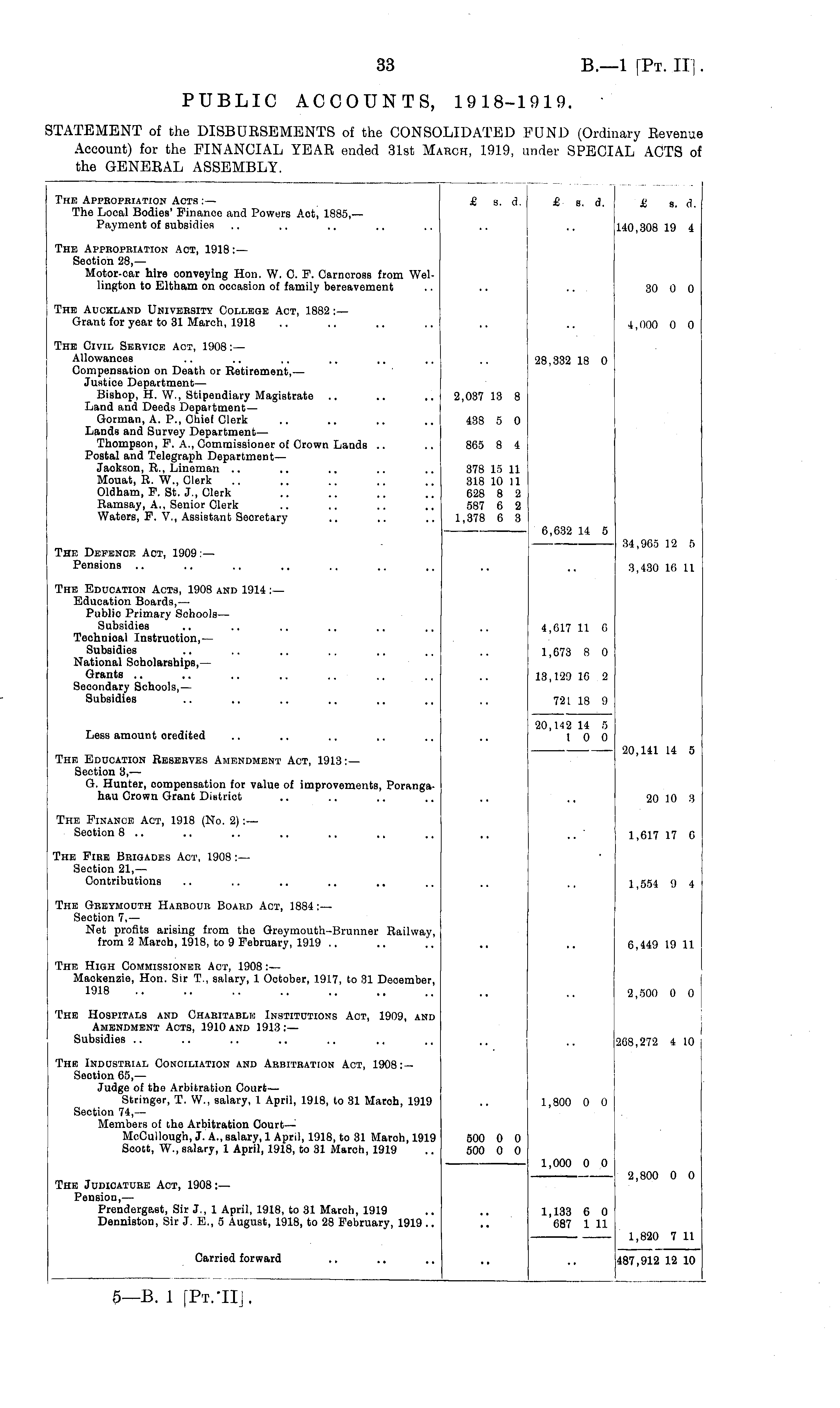 The Appropriation Acts :— The Local Bodies' Finance and Powers Aot, 1885,— Payment of subsidies £ s. d. £ s. d. £ s. d. 140,308 19 4 The Appropriation Act, 1918:— Section 28,— Motor-car hire oonveying Hon. W. C. F. Carncross from Wellington to Eltham on occasion of family bereavement 30 0 0 The Auckland University College Act, 1882 :— Grant for year to 31 March, 1918 4,000 0 0 The Civil Service Act, 1908: — Allowances Compensation on Death or Retirement, — Justice Department— Bishop, H. W., Stipendiary Magistrate Land and Deeds Department— Gorman, A. P., Chief Clerk Lands and Survey Department— Thompson, F. A., Commissioner of Crown Lauds .. Postal and Telegraph Department— Jaokson, R., Lineman .. Mouat, R. W., Clerk Oldham, F. St. J., Clerk Ramsay, A., Senior Clerk Waters, F. V., Assistant Secretary 2,037 13 8 438 5 0 865 8 4 28,332 18 0 378 15 11 318 10 11 628 8 2 587 6 2 1,378 6 3 6,632 14 5 The Defence Act, 1909:— Pensions 34,965 12 5 3,430 16 11 The Education Acts, 1908 and 1914 :— Education Boards, — Public Primary Schools— Subsidies Technioal Instruction, — Subsidies National Scholarships,— Grants Secondary Schools, — Subsidies 4,617 11 6 1,673 8 0 13,129 16 2 721 18 9 Less amount credited 20,142 14 5 1 0 0 The Education Reserves Amendment Act, 1913: — Section 3, — G. Hunter, compensation for value of improvements, Porangahau Crown Grant District 20,141 14 5 20 10 3 The Finance Act, 1918 (No. 2) :— Section 8 .. 1,617 17 6 The Fire Brigades Act, 1908 :— Section 21, — Contributions 1,554 9 4 The Greymouth Harbour Board Act, 1884:— Section 7, — Net profits arising from the Groymouth-Brunner Railway, from 2 Maroh, 1918, to 9 February, 1919 6,449 19 11 The High Commissioner Act, 1908 :— Mackenzie, Hon. Sir T., salary, 1 October, 1917, to 31 December, 1918 2,500 0 0 The Hospitals and Charitable Institutions Act, 1909, and Amendment Acts, 1910 and 1913: — Subsidies 268,272 4 10 The Industrial Conciliation and Arbitration Act, 1908:Section 65, — Judge of the Arbitration Court— Stringer, T. W., salary, 1 April, 1918, to 31 Maroh, 1919 Section 74, — Members of the Arbitration Court— MoCullough, J. A., salary, 1 April, 1918, to 31 March, 1919 Scott, W., salary, 1 April, 1918, to 31 March, 1919 1,800 0 0 500 0 0 500 0 0 1,000 0 0 The Judicature Act, 1908 :— Pension, — Prendergast, Sir J., 1 April, 1918, to 31 March, 1919 Denniston, Sir J. E., 5 August, 1918, to 28 February, 1919 .. 2,800 0 0 1,133 6 0 687 1 11 1,820 7 11 Carried forward 487,912 12 10