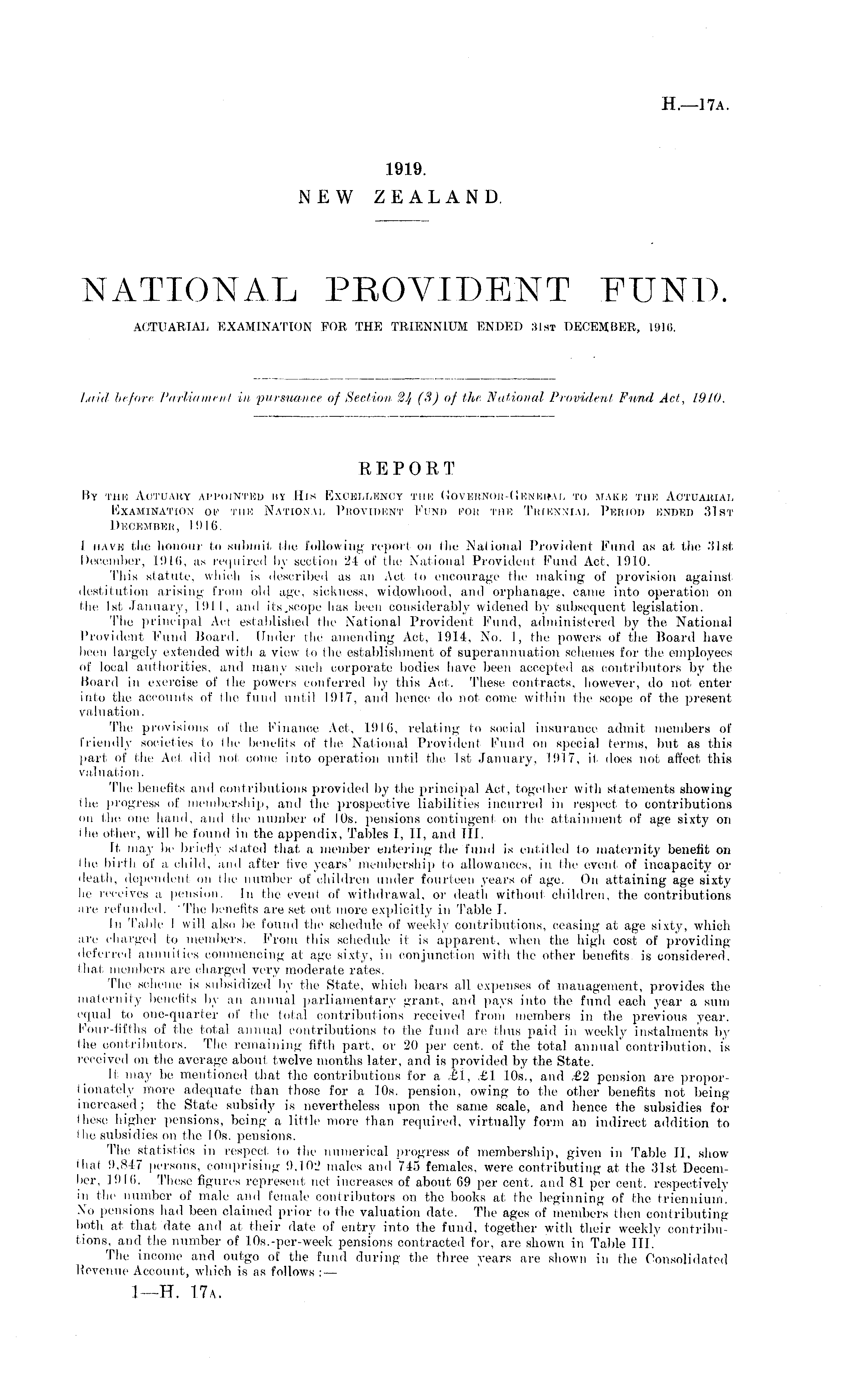 REPORT By the Actuary appointed by His Excellency the Governor-General to make the Actuarial Examination of the National Provident Fund for the Triennial Period ended 81st December, 1016. I have the honour to submit the following- report on tire National Provident Fund as at the 31st December, 1916, as required by section 24 of the National Provident Fund Act, 1910. This statute, which is described as an Act to encourage the making of provision against destitution arising from old age, sickness, widowhood, and orphanage, came into operation on the Ist January, 1911, and its .scope has been considerably widened by subsequent legislation. The principal Act established the National Provident Fund, administered by the National Provident Fund Board, tinder the amending Act, 1914, No. 1, the powers of tire Board have been largely extended with a view lo (he establishment of superannuation schemes for the employees of local authorities, and many such corporate bodies have been accepted as contributors by the Board in exercise of the powers conferred by this Act. These contracts, however, do not enter into the accounts of the fund until 1917, and hence do not come within lire scope of the present valuation. The provisions of the Finance Act, 191G, relating to social insurance admit members of friendly societies to the Irenelits of the National Provident Fund on special terms, but as this part of the Act did not comer into operation until the Ist January, 1917, it does not affect this valuation. The benefits and contributions provided by the principal Apt, together with statements showing the progress of membership, and the prospective liabilities incurred in respect to contributions orr lire one hand, and the number of 10s. pensions contingenl on (he attainment of age sixty on ihe other, will be found in the appendix, Tables I, 11, and Til. It may be briefly stated that a member entering the fund is entitled lo maternity benefit on lire birth of a child, ami after five years' membership to allowances, in the event of incapacity or death, dependent on the number- of children under fourteen years of age. On attaining age sixty he receives a pension. In the even! of withdrawal, or death without children, the contributions are refunded. 'The benefits are set out more explicitly in Table I. In Table I will also Ire found the schedule of weekly contributions, ceasing at age sixty, which are charged to members. From this schedule it is apparent, when the high cost of providing deferred annuities commencing at age sixty, in conjunction with the other benefits is considered, that members are charged very moderate rates. The scheme is subsidized by the State, which bears all expenses of management, provides the maternity benefits by an annual parliamentary grant, and pays into the fund each year a sum equal to one-quarter of the total contributions received from members in the previous year. Four-fifths of the total annual contributions to the fund are thus paid in weekly instalments by the contributors. The remaining fifth part, or 20 per cent, of the total annual' contribution, is received on the average about twelve months later, and is provided by the State. It may be mentioned that the contributions for a £1, £] 10s., and £2 pension are proportionately more adequate than those for a 10s. pension, owing to the other benefits not beingincreased; the State subsidy is nevertheless upon the same scale, and hence the subsidies for these higher pensions, being a little more than required, virtually form an indirect addition to (Ire subsidies on the 10s. pensions. The statistics in respect to the numerical progress of membership, given in Table 11, show thai 9,847 persons, comprising 9,102 males and 745 females, were contributing at the 31st December, 1910. These figures represent net increases of about 69 per cent, and 81 per cent, respectively in the number of male and female contributors on the books at the beginning of the triennium. No pensions had been claimed prior to the valuation date. The ages of members then contributing both at that date and at their date of entry into the fund, together with their weekly contributions, and the number of lOs.-per-week pensions contracted for, are shown in Table lII.' The income and outgo of the fund during the three years are shown in the Consolidated Bevenue Account, which is as follows : —