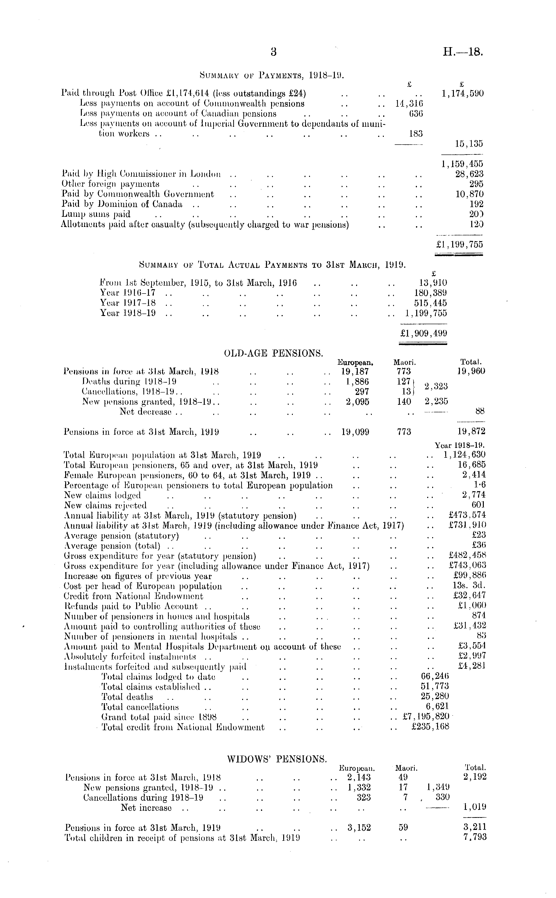 Summary of Payments, 1918-19. £ £ Paid through Post Office £1,174,614 (less outstandings £24) .. .. .. 1,174,590 Less payments on account of Commonwealth pensions .. .. 14,316 Less payments on account of Canadian pensions .. .. .. 636 Less payments on account of Imperial Government to dependants of munition workers .. .. . . .. .. .. . . 183 15,135 1,159,455 I'aidby High Commissioner in London .. .. .. .. .. .. 28,623 Other foreign payments . . . . .. . . .. .. .. 295 Paid by Commonwealth Government .. .. .. .. .. .. 10,870 Paid by Dominion of Canada .. . . .. .. . . . . .. 192 Lump sums paid .. .. .. .. .. .. .. .', 20.) Allotments paid after casualty (subsequently charged to war pensions) .. .. 120 £1,199,755 Summary of Total Actual Payments to 31st March, 1919. £ From Ist September, L 91.5, to 31st March, 1916 .. .. .. 13,910 Year 1916-17 .. .. .. .. .. .. .. 180,389 Year 1917-18 .. .. .. .. .. .. .. 515.445 Year 1918-19 .. .. ~ .. .. .. .. 1,199,755 £1,909,499 OLD-AGE PENSIONS. Furopean, Maori. Total. Pensions in force at 31st March, 1918 .. .. ..19,187 773 19,960 Deaths during 1918-19 .. .. .. .. .1,886 127 I „ ~„., Cancellations, 1918-19.. .. .. .. ~ 297 13] ' New pensions granted, 1918-19.. .. .. .. 2,095 140 2,235 Net decrease .. .. .. . < .. .. .. 88 Pensions in force at 31st March, 1919 .. .. .. 19,099 773 19,872 Year 1918-19. Total European population at 31st March, 1919 .. .. .. .. .. 1,124,630 Total European pensioners, 65 and over, at 31st March, 1919 .. . . .. 16,685 Female European pensioners, 60 to 64, at 31st March, 1919 ~ .. .. .. 2,414 Percentage of European pensioners to total European population .. .. •• L 6 New claims lodged .. .. .. .. .. .. .. .. 2,774 New claims rejected . . . . . . . . .. .. .. . . 601 Annual liability at 31st March, 1919 (statutory pension) .. .. .. .. £473.574 Annual liability at 31st March, 1919 (including allowance under Finance Act, 1917) .. £731 ,910 Average pension (statutory) . . .. . . .. . . . . .. £23 Average pension (total) . . .. . . . . .. . . .. .. £36 Gross expenditure for year (statutory pension) .. .. .. .. •• £482,458 Cross expenditure for year (including allowance under Finance Act, 1917) .. .. £743,063 Increase on figures of previous year .. .. .. .. .. .. £99,886 Cost per head of European population . . .. .. .. .. .. 13s. 3d. Credit from National Endowment .. .. .. .. .. ■• £32,647 Refunds paid to Public Account .. .. .. .. i, .. .. £1,060 Number of pensioners in homes and hospitals .. ... .. .. •• 874 Amount paid to controlling authorities of these .. .. .. .. •■ £31,432 Number of pensioners in mental hospitals . . .. . . .. .. .. 83 Amount, paid to Mental Hospitals Department on account of these .. .. .. £3,554 Absolutely forfeited instalments .. .. .. .. .. .. •• £2,997 Instalments forfeited and subsequently paid .. .. .. .. ~ £4,281 Total claims lodged to date .. .. .. .. .. 66.246 Total claims established .. .. .. .. .. .. 51.773 Total deaths .. .. .. .. .. .. .. 25,280 Total cancellations .. .. .. .. .. .. 6,621 Grand total paid since 1898 .. .. .. .. ..£7,195,820 Total credit from National Endowment .. .. .. .. £235,168 WIDOWS' PENSIONS. European. Maori. Total. Pensions in force at 31st March, 1918 .. .. .. 2,143 49 2,192 New pensions granted, 1918-19 .. .. .. .. 1.332 17 1,349 Cancellations during 1918-19 .. .. .. ..323 7 330 Net increase .. .. .. .. .. .. .. 1,019 Pensions in force at 31st March, 1919 .. ..3,152 59 3,211 Total children in receipt of pensions sit 31st March, 1919 .. .. .. 7,793