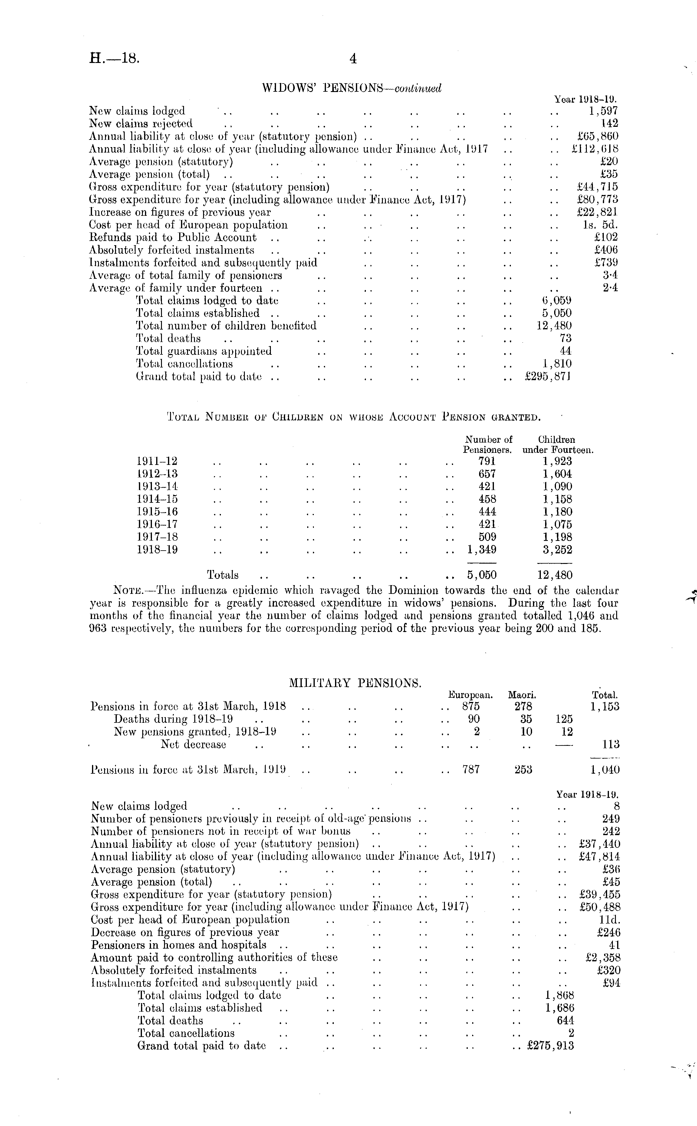 WIDOWS' PENSIONS continued Year 1918-19. New claims lodged ' .. .. .. .. .. .. . . .. 1 ,597 New claims rejected .. .. .. .. .. .. .. .. 142 Annual liability at close of year (statutory pension) .. .. .. .. .. £65,860 Annual liability at close of year (including allowance under Finance Act, 1917 . . .. £112.618 Average pension (statutory) .. .. .. .. .. .. .. £20 Average pension (total) .. . . .. . . . . . . ,". . . £35 Cross expenditure for year (statutory pension) .. .. .. .. .. £44,715 Gross expenditure for year (including allowance under Finance Act, 1917) . . .. £80,773 Increase on figures of previous year .. .. .. .. .. .. £22,821 Cost per head of Furopean population . . .. ■ . . . . .. .. Is. sd. Refunds paid to Public Account .. .. .-. .. .. .. .. £102 Absolutely forfeited instalments .. .. .. .. .. .. .. £406 Instalments forfeited and subsequently paid .. .. .. .. .. £739 Average of total family of pensioners .. . . . . .. .. .. 3-4 Average of family under fourteen .. .. .. . . .. . . .. 2-4 Total claims lodged to date .. .. .. .. .. 6,059 Total claims established .. .. .. .. .. .. 5,050 Total number of children benefited .. .. .. .. 12,480 Total deaths .. . . .. .. .. . . .. 73 Total guardians appointed .. .. .. .. .. 44 Total cancellations .. .. .. .. .. .. 1,810 Grand total paid to date .. .. .. .. .. .. £295,871 Total Number of Children on whose Account Pension granted. Number of Children Pensioners, under Fourteen. 1911-12 .. .. .. .. .. .. 791 1,923 1912-13 .. .. .. .. .. .. 657 1,604 1913-14 .. .. .. .. .. .. 421 1,090 1914-15 .. .. .. .. .. .. 458 1,158 1915-16 .. .. .. .. .. .. 444 1,180 1916-17 .. .. .. .. .. .. 421 1,075 1917-18 .. .. .. .. .. ..509 1,198 1918-19 .. .. .. .. .. .. 1,349 3,252 Totals .. .. .. .. .. 5,050 12,480 Note. —The influenza epidemic which ravaged the Dominion towards the end of the calendar year is responsible for a greatly increased expenditure in widows' pensions. During the last four months of the financial year the number of claims lodged and pensions granted totalled 1,046 and 963 respectively, the numbers for the corresponding period of the previous year being 200 and 185. MILITARY PENSIONS. Furopean. Maori. Total. Pensions in force at 31st March, 1918 .. ..875 278 1,153 Deaths during 1918-19 .. .. .. .. .. 90 35 125 New pensions granted, 1918-19 .. .. .. 2 10 12 Net decrease .. .. .. .. .... .. 113 Pensions in force at 31st March, 1919 .. .. .. ..787 253 1,040 Year 1918-19. New claims lodged .. .. .. .. .. .. .. .. 8 Number of pensioners previously in receipt of old-age pensions .. .. .. .. 249 Number of pensioners not in receipt of war bonus .. .. . . .. .. 242 Annual ttability at close 'of year (statutory pension) .. .. .. .. .. £37,440 Annual liability at close of year (including allowance under Finance Act, 1917) . . .. £47,814 Average pension (statutory) .. . . . . .. . . .. .. £36 Average pension (total) .. .. .. .. .. .. .. .. £45 Gross expenditure for year (statutory pension) .. .. .. .. .. £39,455 Cross expenditure for year (including allowance under Finance Act, 1917) .. .. £50,488 Cost per head of Furopean population .. .. .. .. .. .. lid. Decrease on figures of previous year . . .. . . . . . . .. £246 Pensioners in homes and hospitals . . . . .. . . .. . . .. 41. Amount paid to controlling authorities of these .. .. .. .. .. £2,358 Absolutely forfeited instalments .. .. .. .. . . . . . . £320 Installments forfeited and subsequently paid . . .. . . . . .. .. £94 Total claims lodged to date .. .. .. .. .. 1,868 Total claims established .. .. .. .. .. .. 1,686 Total deaths .. .. .. .. .. .. .. 644 Total cancellations . . .. .. . . . . .. 2 Grand total paid to date .. .. .. .. .. .. £275,913