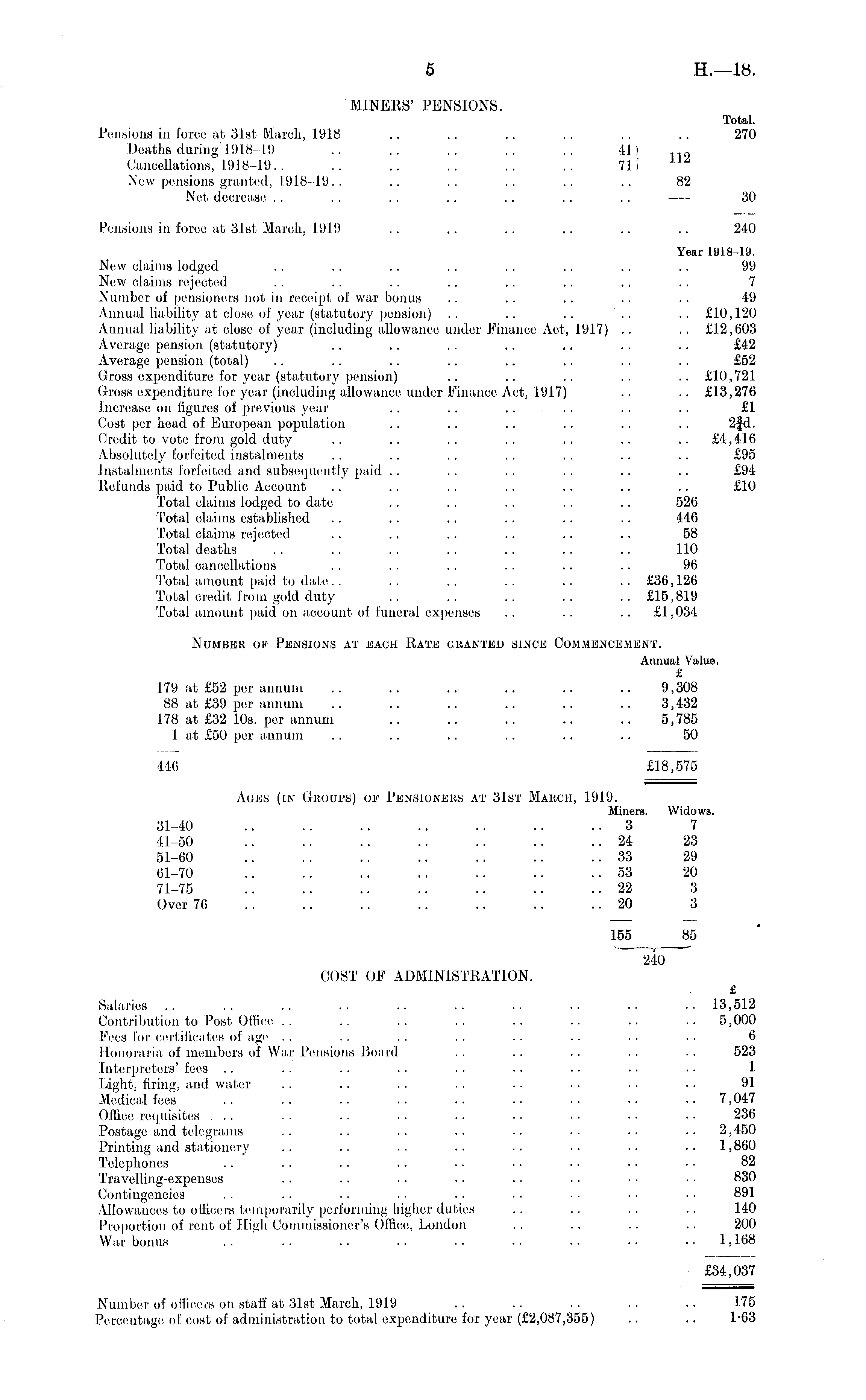 MINERS' PENSIONS. Total. Pensions in force at 31st March, 1918 .. .. .. .. . . .. 270 Deaths during'l9lB-19 .. .. .. .. .. 41] Cancellations, 1918-19. . .. .. .. .. .. 71 i New pensions granted, 1918-19.. .. .. .. .. .. 82 Net decrease . . . . .. .. .. .. .. 30 Pensions in force at 31st March, 1919 .. .. .. .. .. .. 240 Year 1918-19. New claims lodged . . . . .. .. . . .. .. .. 99 New claims rejected .. .. .. .. .. .. .. .. 7 Number of pensioners not in receipt of war bonus .. .. . . . . .. 49 Annual liability at close of year (statutory pension) . . . . . . . . .. £10,120 Annual liability at close of year (including allowance under Finance Act, 1917) .. .. £12,603 Average pension (statutory) .. .. . . .. .. . . . . £42 Average pension (total) .. .. .. .. .. .. .. .. £52 Cross expenditure for year (statutory pension) .. .. .. .. .. £10,721 Cross expenditure for year (including allowance under Finance Act, 1917) .. . . £13,276 Increase on figures of previous year .. .. .... .. .. £1 Cost per head of European population .. . . . . .. .. . . 2fd. Credit to vote from gold duty .. .. .. .. .. .. .. £4,416 Absolutely forfeited instalments . . .. . . . . . . .. . . £95 Instalments forfeited and subsequently paid . . .. .. .. .. .. £94 Refunds paid to Public Account . . .. .. .. . . . . .. £10 Total claims lodged to date . . .. .. . . .. 526 Total claims established .. .. .. . . .. .. 446 Total claims rejected .. .. .. .. .. .. 58 Total deaths .. .. .. .. .. .. .. 110 Total cancellations .. . . . . . . .. . . 96 Total amount paid to date.. .. . . .. .. .. £36,126 Total credit from gold duty .. .. .. .. .. £15,819 Total amount paid on account of funeral expenses .. .. .. £1,034 Number of Pensions at each Rate granted since Commencement. Annual Value. £ 179 at £52 per annum .. .. .., .. .. .. 9,308 88 at £39 per annum .. .. .. .. .. .. 3,432 178 at £32 10s. per annum .. .. .. .. .. 5,785 lat £50 per annum .. .. .. .. .. .. 50 446 £18,575 Ages (in Groups) of Pensioners at 31st March, 1919. Miners. Widows. 31-40 .. .. .. .. .. .. ..3 7 41-50 .. .. .. .. .. .. ..24 23 51-60 .. .. .. .. .. .. .. 33 29 61-70 .. .. .. .. .. .. ..53 20 71-75 .. .. .. .. .. .. ..22 3 Over 76 . . .. .. .. .. .. .. 20 3 155 85 240 COST OF ADMINISTRATION. £ Salaries .. .. .. .. .. •• 13,512 Contribution to Post Office .. .. .. .. .. .. .. ..5,000 Fees for certificates of age . . . . . . . . .. . . . . . . 6 Honoraria of members of War Pensions Board .. .. .. ..' .. 523 Interpreters' fees .. .. .. .. .. .. . • • • • • 1 Light, firing, and water . . . . . . . . . . . . .. • • 91 Medical fees .. .. .. 7,047 Office requisites ... ■ ■ .. • • • • • ■ • • • • • • 236 Postage and telegrams ... .. .. .. .. .. •• •■ 2,450 Printing and stationery .. .. .. .. ■• •• •■ •• 1,860 Telephones .. .. .. .. ■ • • • • • ■ ■ • • 82 Travelling-expenses . . .. . . .. . . .. • ■ • • 830 Contingencies . . . . . . • ■ . . ■ ■ • • • ■ • • 891 Allowances to officers temporarily performing higher duties . . . . .. . . 140 Proportion of rent of High Commissioner's Office, London .. .. .. .. 200 War bonus .. .. .. .. • ■ . • • • • ■ • ■ 1,168 £34,037 Number of officers on staff at 31st March, 1919 .. .. .. .. .. 175 Percentage of cost of administration to total expenditure for year (£2,087,355) .. .. 1-63