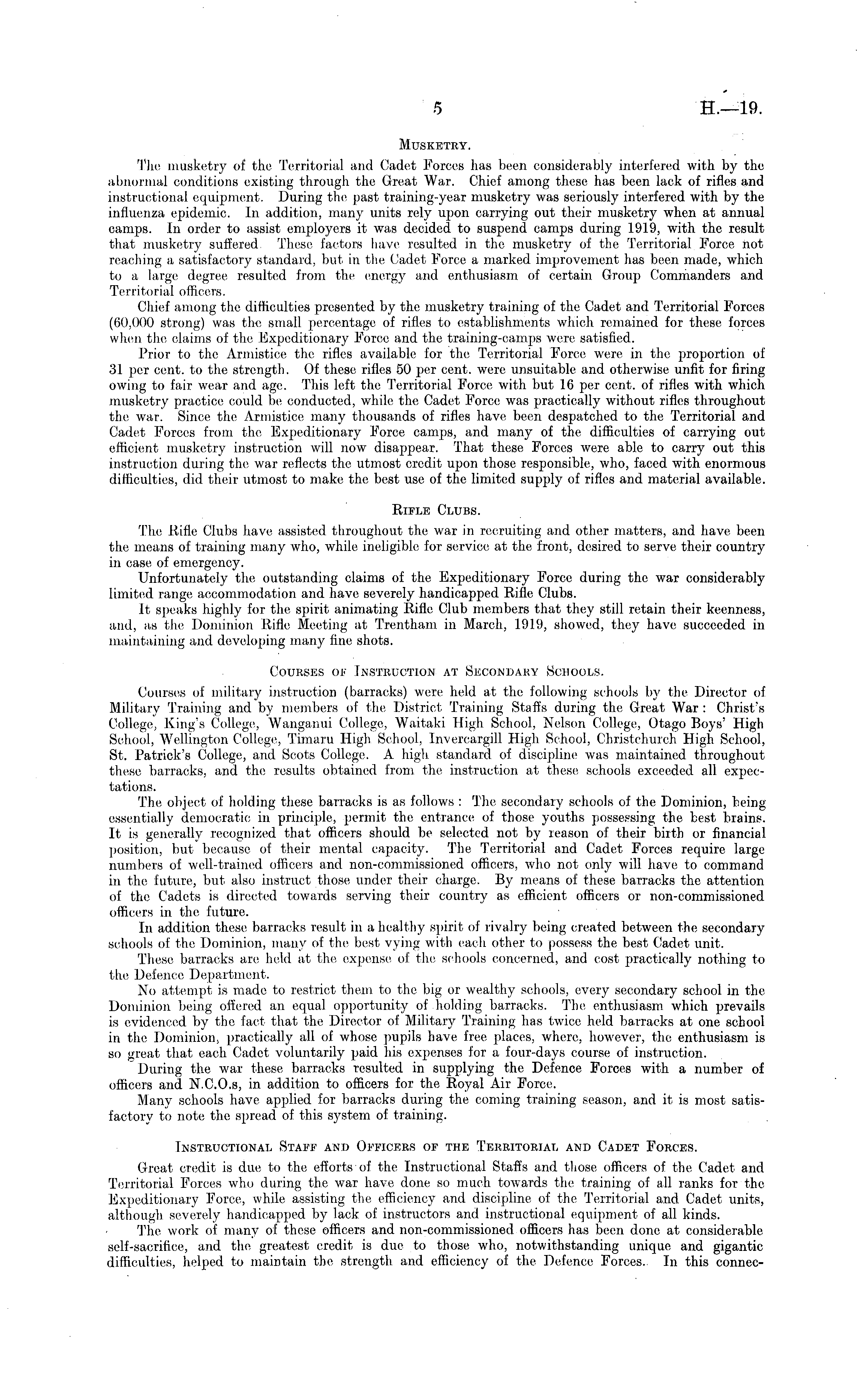 Musketry. The musketry of the Territorial and Cadet Forces has been considerably interfered with by the abnormal conditions existing through the Great War. Chief among these has been lack of rifles and instructional equipment. During the past training-year musketry was seriously interfered with by the influenza epidemic. In addition, many units rely upon carrying out their musketry when at annual camps. In order to assist employers it was decided to suspend camps during 1919, with the result that musketry suffered. These factors have resulted in the musketry of the Territorial Force not reaching a satisfactory standard, but in the Cadet Force a marked improvement has been made, which to a large degree resulted from the energy and enthusiasm of certain Group Commanders and Territorial officers. Chief among the difficulties presented by the musketry training of the Cadet and Territorial Forces (60,000 strong) was the. small percentage of rifles to establishments which remained for these forces when the claims of the Expeditionary Force and the training-camps were satisfied. Prior to the Armistice the rifles available for the Territorial Force were in the proportion of 31 per cent, to the strength. Of these rifles 50 per cent, were unsuitable and otherwise unfit for firing owing to fair wear and age. This left the Territorial Force with but 16 per cent, of rifles with which musketry practice could be conducted, while the Cadet Force was practically without rifles throughout the war. Since the Armistice many thousands of rifles have been despatched to the Territorial and Cadet Forces from the Expeditionary Force camps, and many of the difficulties of carrying out efficient musketry instruction will now disappear. That these Forces were able to carry out this instruction during the war reflects the utmost credit upon those responsible, who, faced with enormous difficulties, did their utmost to make the best use of the limited supply of rifles and material available. Rifle Clubs. The Rifle Clubs have assisted throughout the war in recruiting and other matters, and have been the means of training many who, while ineligible for service at the front, desired to serve their country in case of emergency. Unfortunately the outstanding claims of the Expeditionary Force during the war considerably limited range accommodation and have severely handicapped Rifle, Clubs. It speaks highly for the spirit animating Rifle Club members that they still retain their keenness, and, as the Dominion Rifle, Meeting at Trentham in March, 1919, showed, they have succeeded in maintaining and developing many fine shots. Courses ok Instruction at Secondary Schools. Courses of military instruction (barracks) were held at the following schools by the Director of Military Training and by members of the District Training Staffs during the Great War : Christ's College, King's College, Wanganui College, Waitaki High School, Nelson College, Otago Boys' High School, Wellington College, Timaru High School, Invercargill High School, Christchurch High School, St. Patrick's College, and Soots College. A high, standard of discipline was maintained throughout, these, barracks, and the results obtained from the instruction at these schools exceeded all expectations. The object of holding these barracks is as follows : The secondary schools of the Dominion, being essentially democratic in principle, permit the entrance of those youths possessing the best brains. It is generally recognized that officers should be selected not by reason of their birth or financial position, but because of their mental capacity. The Territorial and Cadet Forces require large numbers of well-trained officers and non-commissioned officers, who not only will have to command in the future, but also instruct those under their charge. By means of these barracks the, attention of the Cadets is directed towards serving their country as efficient officers or non-commissioned officers in the future. In addition these barracks result in a healthy spirit of rivalry being created between the, secondary schools of the Dominion, many of the best vying with each other to possess the, best Cadet unit. These barracks are held at the expense of the schools concerned, and cost practically nothing to the Defence Department. No attempt is made to restrict them to the big or wealthy schools, every secondary school in the Dominion being offered an equal opportunity of holding barracks. The enthusiasm which prevails is evidenced by the fact that the Director of Military Training has twice held barracks at one school in the Dominion, practically all of whose pupils have free places, where, however, the enthusiasm is so great that each Cadet voluntarily paid his expenses for a four-days course of instruction. During the war these barracks resulted in supplying the Defence Forces with a number of officers and N.C.O.s, in addition to officers for the Royal Air Force. Many schools have applied for barracks during the coming training season, and it is most satisfactory to note the spread of this system of training. Instructional Staff and Officers of the Territorial and Cadet Forces. Great credit is due to the efforts of the Instructional Staffs and those officers of the Cadet and Territorial Forces who during the war have done so much towards the training of all ranks for the, Expeditionary Force, while assisting the efficiency and discipline of the Territorial and Cadet units, although severely handicapped by lack of instructors and instructional equipment of all kinds. The work of many of these officers and non-commissioned officers has been done at considerable, self-sacrifice, and the greatest credit is due to those who, notwithstanding unique and gigantic difficulties, helped to maintain the strength and efficiency of the Defence Forces. In this connec-