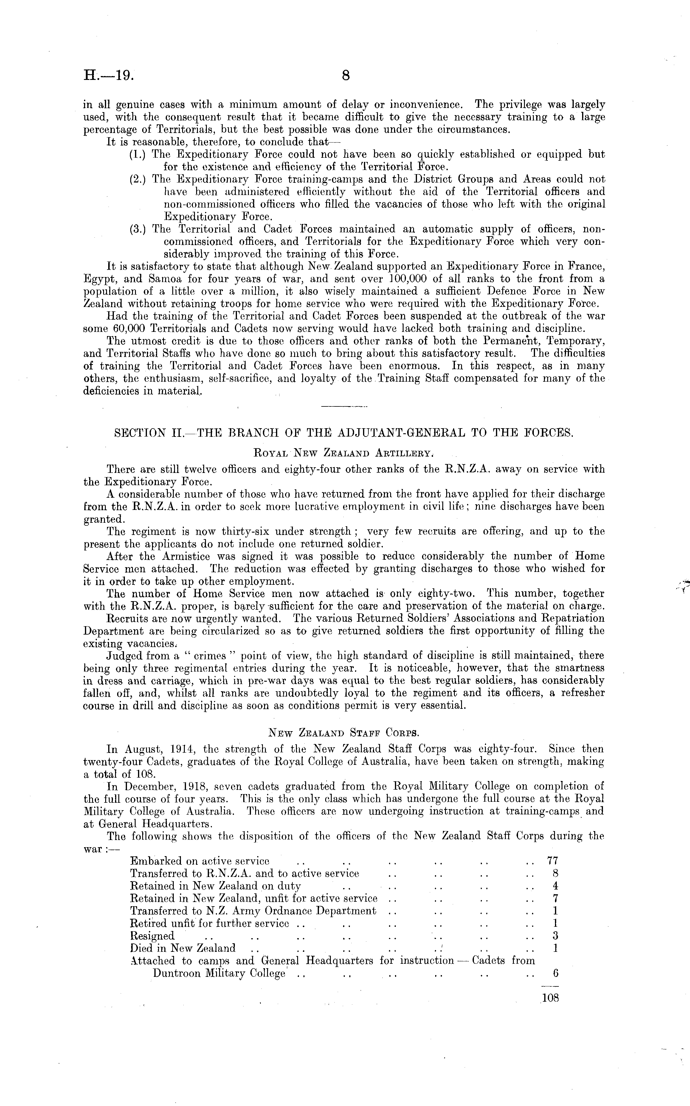 in all genuine cases with a minimum amount of delay or inconvenience. The privilege was largely used, with the consequent result that it became difficult to give the necessary training to a large percentage of Territorials, but the best possible was done under the circumstances. It is reasonable, therefore, to conclude that — (1.) The Expeditionary Force could not have been so quickly established or equipped but for the existence and efficiency of the Territorial Force. (2.) The Expeditionary Force, training-camps and the. District Groups and Areas could not have been administered efficiently without the aid of the Territorial officers and non-commissioned officers who filled the vacancies of those who left with the original Expeditionary Force. (3.) The Territorial and Cadet Forces maintained an automatic supply of officers, noncommissioned officers, and Territorials for the Expeditionary Force which very considerably improved the training of this Force. It is satisfactory to state, that although New Zealand supported an Expeditionary Force in France, Egypt, and Samoa for four years of war, and sent over 100,000 of all ranks to the front from a population of a little over a million, it also wisely maintained a sufficient Defence Force in New Zealand without retaining troops for home service who were required with the Expeditionary Force. Had the training of the Territorial and Cadet Forces been suspended at the outbreak of the war some 60,000 Territorials and Cadets now serving would have lacked both training and discipline. The utmost credit is due to those officers and other ranks of both the Permanent, Temporary, and Territorial Staffs who have done so much to bring about this satisfactory result. The difficulties of training the Territorial and Cadet Forces have been enormous. In this respect, as in many others, the enthusiasm, self-sacrifice, and loyalty of the.Training Staff compensated for many of the deficiencies in material. SECTION II.—THE BRANCH OF THE ADJUTANT-GENERAL TO THE FORCES. Royal New Zealand Artillery. There are still twelve officers and eighty-four other ranks of the R.N.Z.A. away on service with the Expeditionary Force. A considerable number of those who have returned from the front have applied for their discharge from the R.N.Z.A. in order to seek more lucrative employment in civil life; nine discharges have been granted. The regiment is now thirty-six under strength ; very few recruits are offering, and up to the present the applicants do not include one returned soldier. After the Armistice was signed it was possible to reduce, considerably the number of Home Service men attached. The reduction was effected by granting discharges to those who wished for it in order to take up other employment. The number of Home Service men now attached is only eighty-two. This number, together with the R.N.Z.A. proper, is barely sufficient for the care and preservation of the material on charge. Recruits are now urgently wanted. The various Returned Soldiers' Associations and Repatriation Department are being circularized so as to give returned soldiers the first opportunity of filling the existing vacancies.' Judged from a " crimes " point of view, the high standard of discipline is still maintained, there being only three regimental entries during the year. It is noticeable, however, that the smartness in dress and carriage, which in pre-war days was equal to the best regular soldiers, has considerably fallen off, and, whilst all ranks are undoubtedly loyal to the regiment and its officers, a refresher course in drill and discipline as soon as conditions permit is very essential. Nuw Zealand Staff Corps. In August, 1914, the strength of the New Zealand Staff Corps was eighty-four. Since then twenty-four Cadets, graduates of the Royal College of Australia, have been taken on strength, making a total of 108. In December, 1918, seven cadets graduated from the Royal Military College on completion of the full course of four years. This is the only class which has undergone the full course at the Royal Military College of Australia. These officers are now undergoing instruction at training-camps and at General Headquarters. The following shows the disposition of the officers of the New Zealand Staff Corps during the war :— Embarked on active service .. . . . . .. . . 77 Transferred to R.N.Z.A. and to active service . . . . . . .. 8 Retained in New Zealand on duty .. . . .. .. 4 Retained in New Zealand, unfit for active service .. .. .. .. 7 Transferred to N.Z. Army Ordnance Department . . . . . . .. 1 Retired unfit for further service .. .. . . .. .. 1 Resigned . . .. .. .. . . .. .. .. 3 Died in New Zealand .. .. .. . . ..' . . .. 1 Attached to camps and General Headquarters for instruction - Cadets from Duntroon Military College . . ~ ~ ~ .. .. 6 108