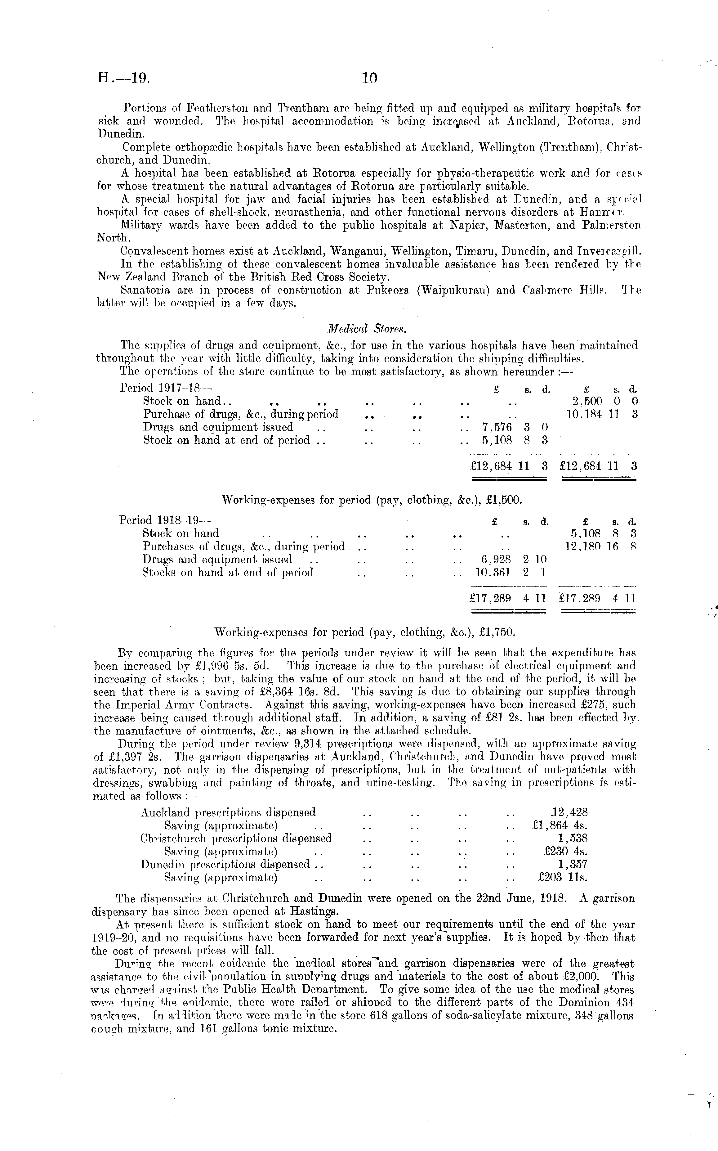 Portions of Featherston and Trentham are being fitted up and equipped as military hospitals for sick and wounded. The hospital accommodation is being increased at Auckland, Rotorua, and Dunedin. Complete orthopaedic hospitals have been established at Auckland, Wellington (Trentham), Christchurch, and Dunedin. A hospital has been established at Rotorua especially for physio-therapeutic work and for cases for whose treatment the natural advantages of Rotorua are particularly suitable. A special hospital for jaw and facial injuries has been established at Eunedin, and a srcciel hospital for cases of shell-shock, neurasthenia, and other functional nervous disorders at Faini r, Military wards have been added to the public hospitals at Napier, Masterton, and Palnerston North. Convalescent homes exist at Auckland, Wanganui, Wellington, Timaru, Dunedin, and Inveicaigill. In the establishing of these convalescent homes invaluable, assistance has been rendered by tie New Zealand Branch of the British Red Cross Society. Sanatoria are in process of construction at Pukeora (Waipukurau) and Cashmere Hills. Tie latter will be occupied in a few days. Medical Stores. The supplies of drugs and equipment, &c, for use in the various hospitals have been maintained throughout the year with little difficulty, taking into consideration the shipping difficulties. The operations of the store continue to be most satisfactory, as shown hereunder :— Period 1917-18 — £ s . d. .£ s. d. Stock on hand.. .. .. .. .. .. .. 2,500 0 0 Purchase of drugs, &c, during period .. .. .. .. 10.184 11 3 Drugs and equipment issued .. .. .. .. 7,576 3 0 Stock on hand at end of period .. .. .. .. 5,108 8 3 £12,684 11 3 £12,684 11 3 Working-expenses for period (pay, clothing, &c), £1,500. Period 1918-19— £ s. d. £ s. d. Stock on hand .. .. .. .. .. .. 5,108 8 3 Purchases of drugs, &c, during period .. .. .. .. 12,180 16 8 Drugs and equipment issued . . . . . . . . 6,928 2 10 Stocks on hand at end of period .. .. 10,361 2 ] £17,289 4 11 £17,289 4 11 Working-expenses for period (pay, clothing, &c), £1,750. By comparing the figures for the periods under review it will be seen that the expenditure has been increased by £1,996 ss. sd. This increase is due to the purchase of electrical equipment and increasing of stocks ; but, taking the value of our stock on hand at the end of the period, it will be seen that there is a saving of £8,364 16s. Bd. This saving is due to obtaining our supplies through the Imperial Army Contracts. Against this saving, working-expenses have been increased £275, such increase being caused through additional staff. In addition, a saving of £81 2s. has been effected by. the manufacture of ointments, &c, as shown in the attached schedule. During the, period under review 9,31.4 prescriptions were dispensed, with an approximate saving of £1,397 2s. The garrison dispensaries at Auckland, Christchurch, and Dunedin. have proved most satisfactory, not only in the dispensing of prescriptions, but in the treatment of out-patients with dressings, swabbing and painting of throats, and urine-testing. The saving in [inscriptions is estimated as follows : Auckland prescriptions dispensed .. .. .. .. .12,428 Saving (approximate) .. .. .. .. .. £1,864 4s. Christchurch prescriptions dispensed .. .. .. .. 1,538 Saving (approximate) .. .. .. .. .. £230 4s. Dunedin prescriptions dispensed .. .. .. .. .. 1,357 Saving (approximate) .. .. . . .. .. £203 lis. The dispensaries at Christchurch and Dunedin were opened on the 22nd June, 1918. A garrison dispensary has since been opened at Hastings. At present there is sufficient stock on hand to meet our requirements until the end of the year 1919-20, and no requisitions have been forwarded for next year's supplies. It is hoped by then, that the cost of present prices will fall. During the recent epidemic the medical stores ""and garrison dispensaries were of the greatest assistance to the civil T>o nidation in sunnlymg drugs and materials to the cost of about £2,000. This was charged against the Public Health Department. To give some idea of the use the medical stores weT-e during the eoidemic, there were railed or shinned to the different parts of the Dominion 434 oackages. In addition there were made in the store 618 gallons of soda-salicylate mixture, 348 gallons cough mixture, and 161 gallons tonic mixture.