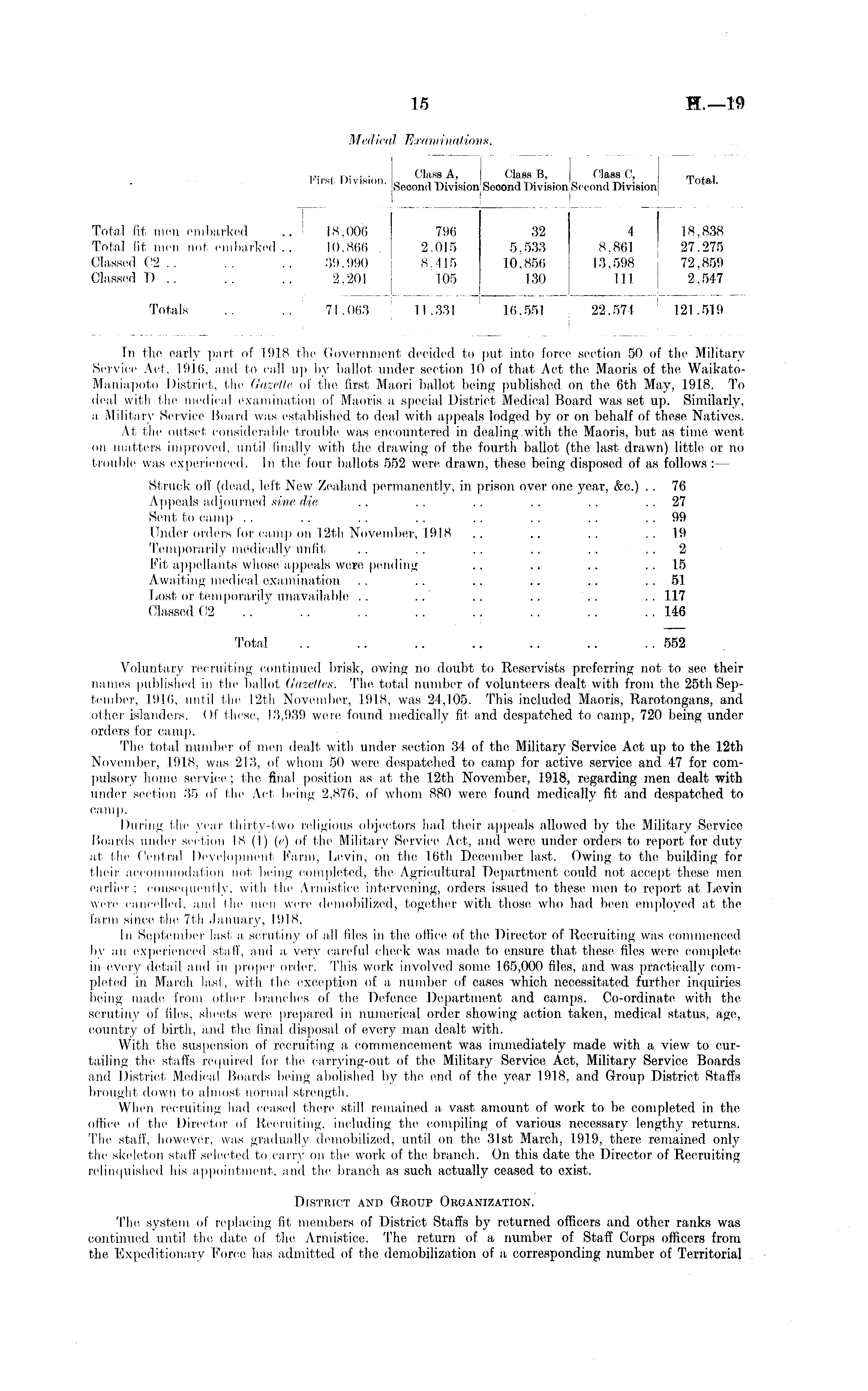 In the early part, of 1918 the Government decided to put into force section 50 of the Military Service Act, 1916, and to call up by ballot under section 10 of that Act the Maoris of the WaikatoManiapoto District, the Gazette of the first Maori ballot being published on the 6th May, 19.18. To deal with the medical examination of Maoris a special District Medical Board was set up. Similarly, a Military Service Board was established to deal with appeals lodged by or on behalf of these Natives. At the outset considerable trouble was encountered in dealing with the Maoris, but as time went on matters improved, until finally with the drawing of the fourth ballot (the last drawn) little or no trouble was experienced. In the four ballots 552 were drawn, these being disposed of as follows : — Struck off (dead, left New Zealand permanently, in prison over one year, &c.) . . 76 Appeals adjourned sine die .. .. .. .. .. 27 Sent to camp .. .. .. .. .. .. .. 99 Under orders for camp on 12th November, 1918 .. .. .. ..19 Temporarily medically unfit .. .. .. .. .. .. 2 Fit appellants whose appeals were pending .. .. .. ..15 Awaiting medical examination .. .. ;. .. .. ..51 Lost or temporarily unavailable .. ..' .. .. '.. .. 117 Classed C 2 '.. .. 146 Total .. .. .. .. .. .. ..552 Voluntary recruiting continued brisk, owing no doubt to Reservists preferring not to see, their names published in the ballot Gazettes. The, total number of volunteers dealt with from the 25th September, 1916, until the 12th November, 1918, was 24,105. This included Maoris, Rarotongans, and other islanders. Of these, 13,939 were found medically fit and despatched to camp, 720 being under orders for camp. The total number of men dealt with under section 34 of the, Military Service Act up to the 12th November, 1918, was 213, of whom 50 were despatched to camp for active service and 47 for compulsory home service; the final position as at the 12th November, 1918, regarding men dealt with under section 35 of the Act being 2,876, of whom 880 were found medically fit and despatched to camp. During the year thirty-two religious objectors had their appeals allowed by the Military Service Boards under section 18 (I) (c) of the Military Service Act, and were under orders to report for duty at the Central Development Farm, Levin, on the 16th December last. Owing to the building for their accommodation not being completed, the Agricultural Department could not accept these men earlier: consequently, with the Armistice intervening, orders issued to these men to report at Levin wire cancelled, and the men were demobilized, together with those wdio had been employed at the farm since the 7th January, 1918. In September last a scrutiny of all files in the office of the Director of Recruiting was commenced by an experienced staff, and a very careful check was made to ensure that these files were complete in every detail and in proper order. This work involved some 165,000 files, and was practically completed in March last, with the exception, of a number of cases which necessitated further inquiries being made from other branches of the, Defence Department and camps. Co-ordinate with the, scrutiny of files, sheets were prepared in numerical order showing action taken, medical status, age, country of birth, and the final disposal of every man dealt with. With the suspension of recruiting a, commencement was immediately made with a view to curtailing, the staffs required for the carrying-out of the Military Service Act, Military Service Boards and District Medical Boards being abolished by the end of the year 1918, and Group District Staffs brought down to almost normal strength. When recruiting had censed there still remained a, vast amount of work to be completed in the office of the Director of Recruiting, including the compiling of various necessary lengthy returns. The staff, however, was gradually demobilized, until on the 31st March, 1919, there, remained only the skeleton staff selected to carry on the work of the branch. On this date the Director of Recruiting relinquished his appointment, and the branch as such actually ceased to exist. District and Group Organization. The system of replacing fit members of District Staffs by returned officers and other ranks was continued until the date of the Armistice. The return of a number of Staff Corps officers from the Expeditionary Force has admitted of the demobilization of a corresponding number of Territorial