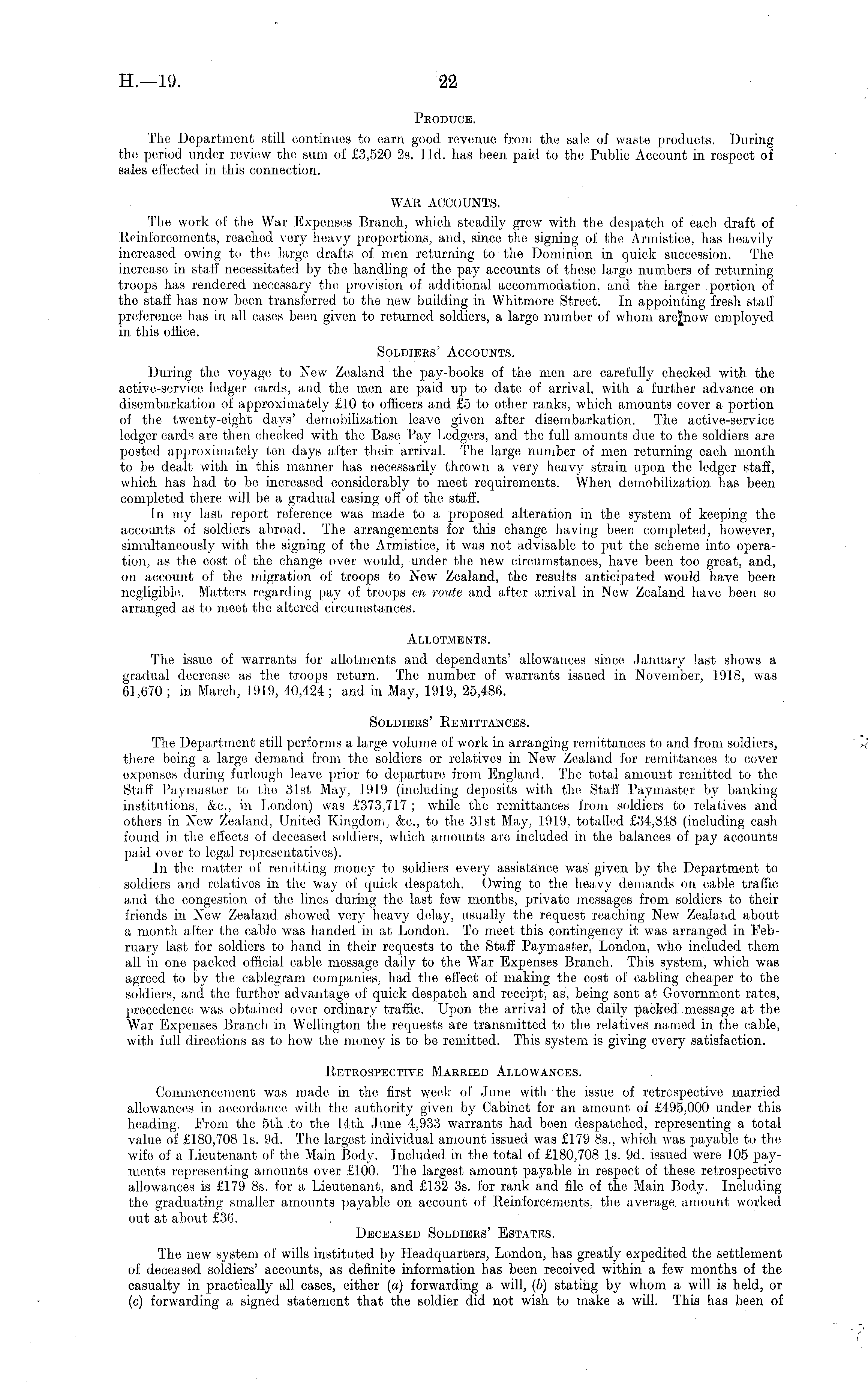 Produce. The Department still continues to earn good revenue from the sale of waste products. During the period under review the sum of £3,520 2s. lid. has been paid to the Public Account in respect of sales effected in this connection. WAR ACCOUNTS. The work of the War Expenses Branch, which steadily grew with the despatch of each draft of Reinforcements, reached very heavy proportions, and, since the signing of tin; Armistice, has heavily increased owing to the large drafts of men returning to the Dominion in quick succession. The increase in staff necessitated by the handling of the pay accounts of these large numbers of returning troops has rendered necessary the provision of additional accommodation, and the larger portion of the staff has now been transferred to the new building in Whitmore Street. In appointing fresh staff preference has in all cases been given to returned soldiers, a largo number of whom are|now employed in this office. Soldiers' Accounts. During the voyage to New Zealand the pay-books of the men are carefully checked with the active-service ledger cards, and the men are paid up to date of arrival, with a further advance on disembarkation of approximately £10 to officers and £5 to other ranks, which amounts cover a portion of the twenty-eight days' demobilization leave given after disembarkation. The active-service ledger cards are then checked with the Base Pay Ledgers, and the full amounts due to the soldiers are posted approximately ton days after their arrival. The large number of men returning each month to be dealt with in this manner has necessarily thrown a very heavy strain upon the ledger staff, which has had to be increased considerably to meet requirements. When demobilization has been completed there will be a gradual easing off of the staff. In my last report reference was made to a proposed alteration in the system of keeping the accounts of soldiers abroad. The arrangements for this change having been completed, however, simultaneously with the signing of the Armistice, it was not advisable to put the scheme into operation, as the cost of the change over would, under the new circumstances, have been too great, and, on account of the migration of troops to New Zealand, the results anticipated would have been negligible. Matters regarding pay of troops en route and after arrival in New Zealand have been so arranged as to meet the altered circumstances. Allotments. The issue of warrants for allotments and dependants' allowances since January last shows a gradual decrease as the troops return. The number of warrants issued in November, 1918, was 61,670 ; in March, 1919, 40,424 ; and in May, 1919, 25,486. Soldiers' Remittances. The Department still performs a large volume of work in arranging remittances to and from soldiers, there being a large demand from the soldiers or relatives in New Zealand for remittances to cover expenses during furlough leave prior to departure from England. The total amount remitted to the Staff Paymaster to the 31st May, 1919 (including deposits with the Staff Paymaster by banking institutions, &c, in London) was £373,717 ; while the remittances from soldiers to relatives and others in New Zealand, United Kingdom, &c, to the 31st May, 1919, totalled £34,818 (including cash found in the effects of deceased soldiers, which amounts are included in the balances of pay accounts paid over to legal representatives). In the matter of remitting money to soldiers every assistance was given by the Department to soldiers and relatives in the way of quick despatch. Owing to the heavy demands on cable tra.ffic and the congestion of the lines during the last few months, private messages from soldiers to their friends in New Zealand showed very heavy delay, usually the request reaching New Zealand about a month after the cable was handed in at London. To meet this contingency it was arranged in February last for soldiers to hand in their requests to the Staff Paymaster, London, who included them all in one packed official cable message daily to the War Expenses Branch. This system, which was agreed to by the cablegram companies, had the effect of making the cost of cabling cheaper to the soldiers, and the further advantage of quick despatch and receipt, as, being sent at Government rates, precedence, was obtained over ordinary traffic. Upon the arrival of the daily packed message at tin; War Expenses Branch in Wellington the requests are transmitted to the relatives named in the cable, with full directions as to how the money is to be remitted. This system is giving every satisfaction. Retrospective Married Allowances. Commencement was made in the first week of June with the issue of retrospective married allowances in accordance with the authority given by Cabinet for an amount of £495,000 under this heading. From the sth to the 14th June 4,933 warrants had been despatched, representing a total value of £180,708 Is. 9d, The largest, individual amount issued was £179 Bs., which was payable to the wife of a Lieutenant of the Main Body. Included in the total of £180,708 Is. 9d. issued were 105 payments representing amounts over £100. The largest amount payable in respect of these retrospective allowances is £179 Bs. for a Lieutenant, and £132 3s. for rank and file of the Main Body. Including the graduating smaller amounts payable on account of Reinforcements, the average, amount worked out at about £36. Deceased Soldiers' Estates. The new system of wills instituted by Headquarters, London, has greatly expedited the settlement of deceased soldiers' accounts, as definite information has been received within a few months of the casualty in practically all cases, either (a) forwarding a will, (b) stating by whom a will is held, or (c) forwarding a signed statement that the soldier did not wish to make a will. This has been of