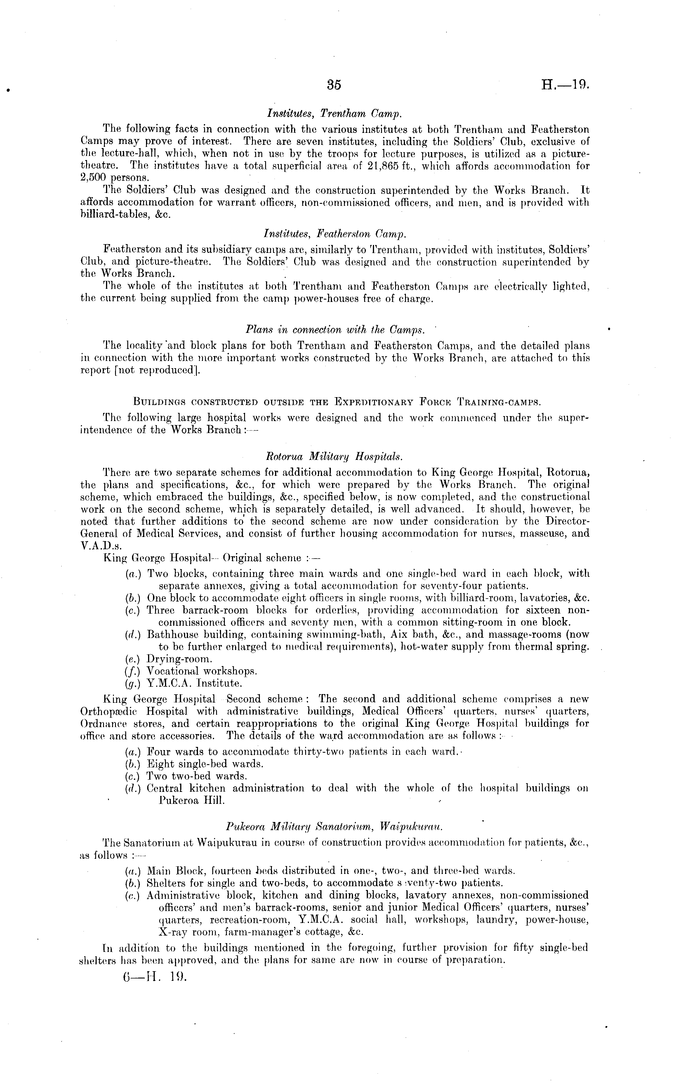 Institutes, Trentham Gamp. The following facts in connection with the various institutes at both Trentham and Featherston Camps may prove of interest. There are seven institutes, including the Soldiers' Club, exclusive of the lecture-hall, which, when not in use, by the troops for lecture purposes, is utilized as a, picturetheatre. The institutes have a total superficial area of 21,865 ft., which affords accommodation for 2,500 persons. The, Soldiers' Club was designed and the construction superintended by the Works Branch, ft affords accommodation for warrant officers, non-commissioned officers, and men, and is provided with billiard-tables, &c. Institutes, Featherston Camp. Featherston and its subsidiary camps are, similarly to Trentham, provided with institutes, Soldiers' Club, and picture-theatre. The Soldiers' Club was designed and the construction superintended by the Works Branch. The whole of the, institutes at both Trentham. and Featherston Camps are electrically lighted, the current being supplied from, the camp power-houses free of charge. Plans in connection with the Camps. The locality "and block plans for both Trentham and Featherston Cam [is, and the detailed plans in connection with the more important works constructed by the Works Branch, are attached to this report [not reproduced]. Buildings constructed outside the Expeditionary Forob Training-cam ps. The following large hospital works were designed and the work commenced under the superintendence of the Works Branch: - Rotorua Military Hospitals. There are two separate schemes for additional accommodation to King George Hospital, Rotorua, the plans and specifications, &c, for which were prepared by the Works Branch. The original scheme, which embraced the buildings, &c, specified below, is now completed, and the constructional work on the second scheme, which is separately detailed, is well advanced. It should, however, be noted that further additions to th(! second scheme, are now under consideration by the DirectorGeneral of Medical Services, and consist of further housing accommodation for nurses, masseuse, and V.A.D.s. King George Hospital Original scheme : — (a.) Two blocks, containing three main wards and one, single-bed ward in each block, with separate annexes, giving a total accommodation for seventy-four patients. (b.) One block to accommodate eight, officers in single rooms, with billiard-room, lavatories, &c. (c.) Three barrack-room blocks for orderlies, providing accommodation for sixteen noncommissioned officers and seventy men, with a common sitting-room in one block. (d.) Bathhouse building, containing swimming-bath, Aix bath, &c, and massage-rooms (now to be further enlarged to medical requirements), hot-water supply from thermal spring. (c.) Drying-room. (/.) Vocational workshops. (g.) V.M.C.A. Institute. King George Hospital Second scheme : The second and additional scheme comprises a new Orthopaedic Hospital with administrative, buildings, Medical Officers' quarters, nurses' quarters, Ordnance stores, and certain reappropriations to the original King George Hospital buildings for office and store accessories. The details of the ward accommodation are ;is follows : (a.) Four wards to accommodate thirty-two patients in each ward. (6.) Eight single-bed wards, (c.) Two two-bed wards. (d.) Central kitchen administration to deal with the whole of the hospital buildings on Pukeroa Hill. Pukeora Military Sanatorium, Waipukurau. The Sanatorium at Waipukurau in course of construction provides accommodation for patients, &c, as follows :— (((.) Main Block, fourteen beds distributed in one-, two-, and three-bed wards. (b.) Shelters for single and two-beds, to accommodate s ■ventv-two patients. (c.) Administrative block, kitchen and dining blocks, lavatory annexes, non-commissioned officers' and men's barrack-rooms, senior and junior Medical Officers' quarters, nurses' quarters, recreation-room, V.M.C.A. social hall, workshops, laundry, power-house, X-ray room, farm-manager's cottage, &c. In addition to the buildings mentioned in the foregoing, further provision for fifty single-bed shelters has been approved, and the plans for same are now in course of preparation.