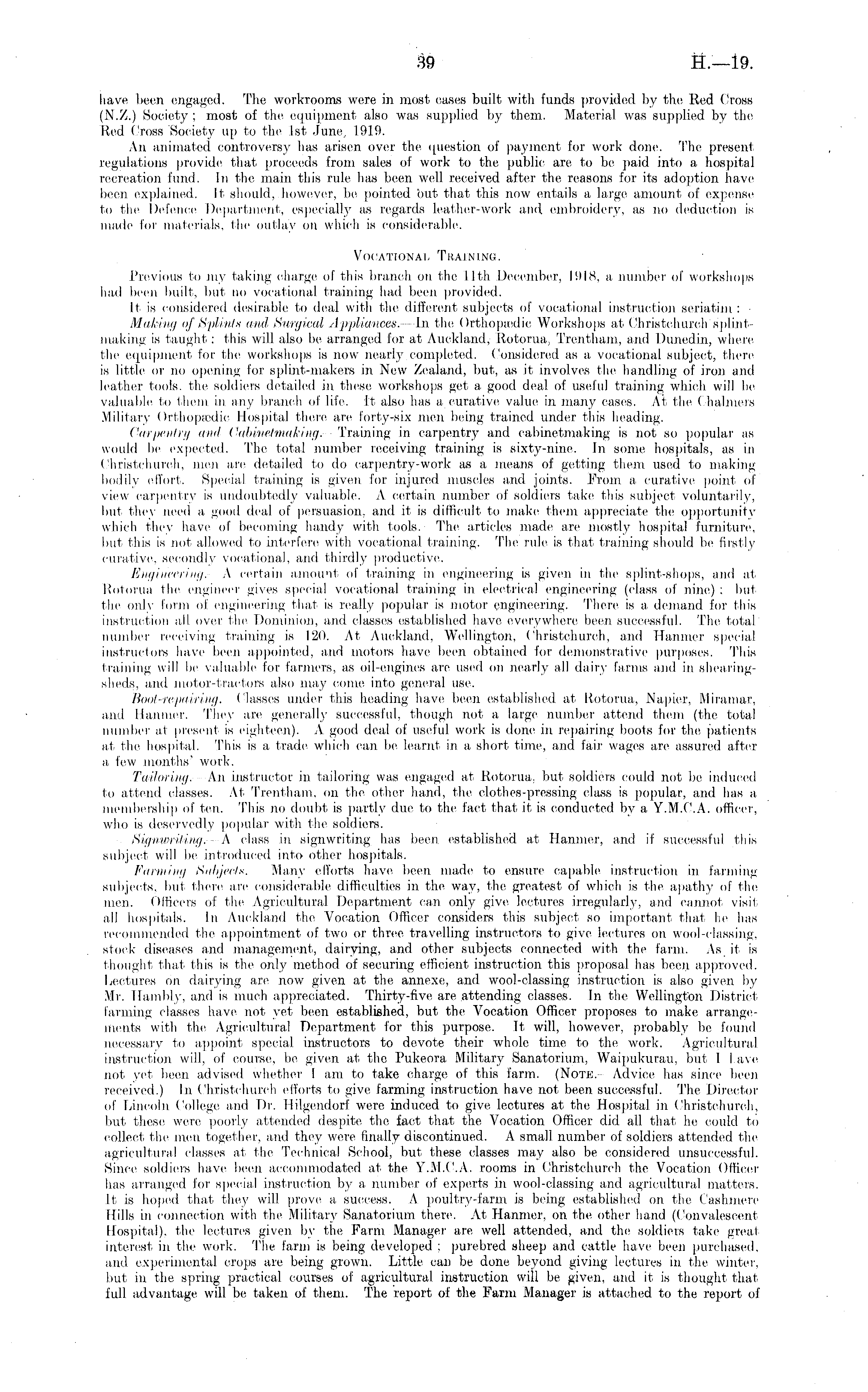 have been engaged. The workrooms were in most cases built with funds provided by the Red Cross (N.Z.) Society; most of the equipment also was supplied by them. Material was supplied by the Red Cross Society up to the Ist June, 1919. An animated controversy has arisen over the, question of payment for work done. The present regulations provide that proceeds from sales of work to the public are to be. paid into a hospital recreation fund. In the, main this rule has been well received after the reasons for its adoption have been explained. It should, however, be pointed but that this now entails a large amount of expense to the Defence Department, especially as regards leather-work and. embroidery, as no deduction is made for materials, the outlay on which is considerable. Vocational Training, Previous to my taking charge of this branch on the 11th December. 1918, a number of workshops had been built, but no vocational training had been provided. It is considered desirable to deal with the different subjects of vocational instruction seriatim : Making of Splints and Surgical Appliances. —ln the Orthopaedic Workshops at Christchurch splintmaking is taught: this will also be arranged for at Auckland, Rotorua, Trentham, and Dunedin, where the equipment for the workshops is now nearly completed. Considered as a vocational subject, there is little or no opening for splint-makers in New Zealand, but, as it involves the handling of iron and leather tools, the soldiers detailed in these workshops get a good deal of useful training which will be valuable to them in any branch of life. It also has a curative value in many cases. At the Chalmers Military Orthopaedic Hospital there are forty-six men being trained under this heading. Carpentry and Cabinetmaking. Training in carpentry and cabinet-making is not so popular as would be expected. The total number receiving training is sixty-nine. In some hospitals, as in Christchurch, men are detailed to do carpentry-work as a means of getting them used to making bodily effort. Special training is given for injured muscles and joints. From a curative point of view carpentry is undoubtedly valuable. A certain number of soldiers take tin's subject voluntarily, but they need a good deal of persuasion., and it is difficult to make them appreciate the opportunity which they have of becoming handy with tools. The articles made are mostly hospital furniture, but this is not allowed to interfere with vocational training. The rule is that- training should be firstly curative, secondly vocational, and thirdly productive. Engineering. A certain amount of training in engineering is given in the splint-shops, and al Rotorua the engineer gives special vocational training in electrical engineering (class of nine) : but the only form of engineering that is really popular is motor engineering. There is a demand for this instruction all over the Dominion, and classes established have everywhere been successful. The total number receiving training is 120. At Auckland, Wellington. Christchurch, and Hanmer special instructors Lave been appointed, and motors have been obtained for demonstrative purposes. This training will be valdable for farmers, as oil-engines are used on nearly all dairy farms and in shearingsheds, and motor-tractors also may come into general use. Boot-repairing. Classes under this heading have been established at Rotorua, Napier, Miramar, and Hanmer. They are generally successful, though not a large number attend them (the total number at present is eighteen). A good deal of useful work is done in repairing boots for the patients at the hospital. This is a trade which can be learnt- in a short time, and fair wages are assured after a, few months' work. Tailoring. An instructor in tailoring was engaged at Rotorua. but soldiers could not be induced to attend classes. At Trentham, on the, other hand, the clothes-pressing class is popular, and has a membership of ten. This no doubt is partly due to the fact that it is conducted by a V.M.C.A. officer, who is deservedly popular with the soldiers. Signwriting. —A class in signwritlng has been established at Hanmer, and if successful this subject will be introduced into other hospitals. Farming Subjects. Many efforts have been made to ensure capable instruction in farming subjects, but there are considerable difficulties in the way, the greatest of which is the apathy of the men. Officers of the Agricultural Department- can only give lectures irregularly, and cannot visitall hospitals. In Auckland the Vocation Officer considers this subject so important- that he has recommended the appointment of two or three travelling instructors to give lectures on wool-classing, stock diseases and management, dairying, and other subjects connected with the farm. As it is thought that this is the only method of securing efficient instruction this proposal has been approved. Lectures on dairying are now given at the annexe, and wool-classing instruction is also given by Mr. Hambly, and is much appreciated. Thirty-five are attending classes. In the Wellington District, farming classes have not yet been established, but the Vocation Officer proposes to make, arrangements with the Agricultural Department for this purpose. It will, however, probably be found necessary to appoint special instructors to devote their whole time to the work. Agricultural instruction will, of course, be given at the Pukeora Military Sanatorium, Waipukurau, but 1 I aye not yet been advised whether I am to take charge, of this farm. (Note. Advice has since been received.) In Christchurch efforts to give farming instruction have not been successful. The Director of Lincoln College and Dr. Hilgendorf were induced to give lectures at the Hospital in Christchurch, but these were poorly attended despite, the fact that the Vocation Officer did all that be could to collect the men together, and they were finally discontinued. A small number of soldiers attended