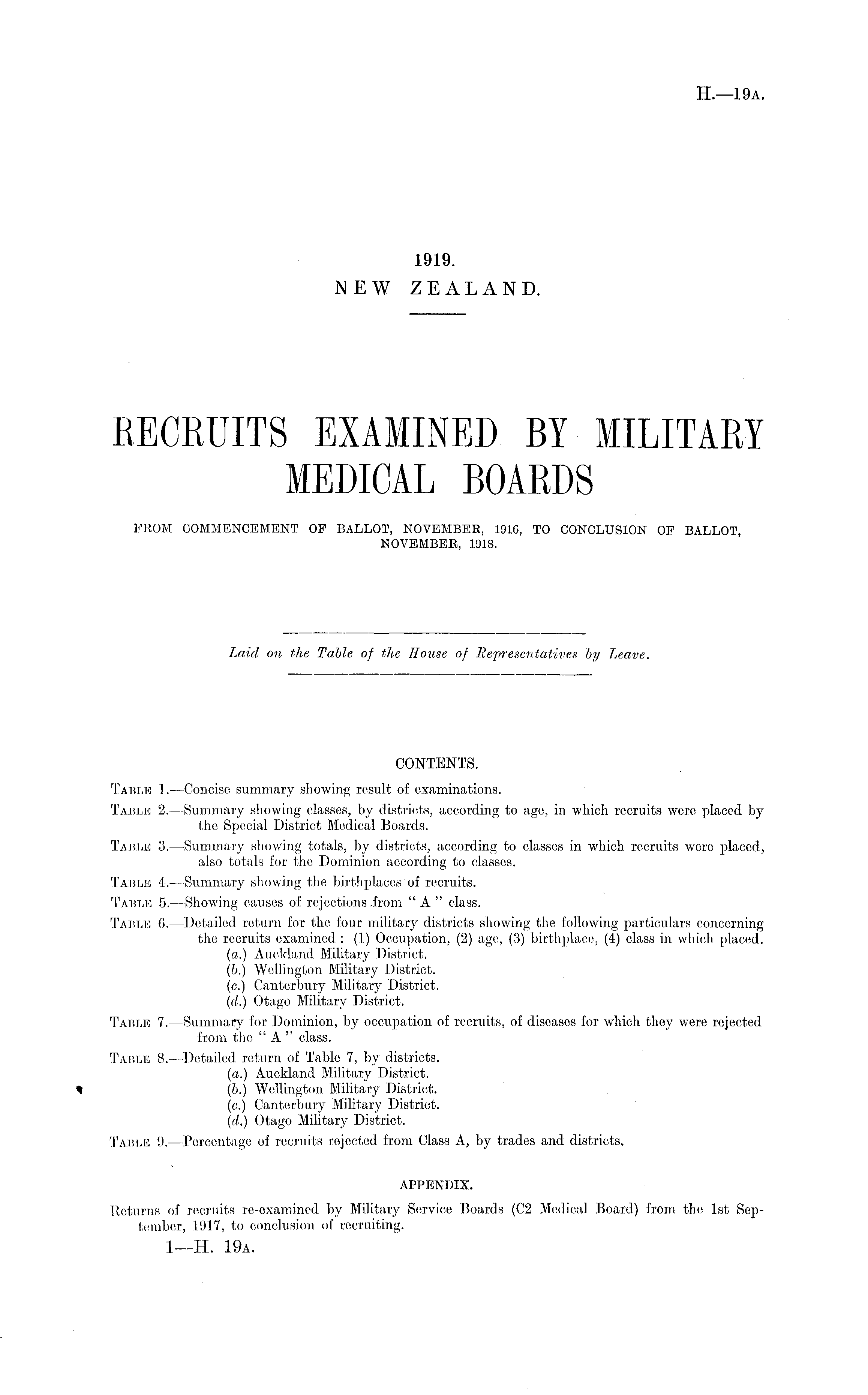 CONTENTS. Table 1. —Concise summary showing result of examinations. Table 2.—Summary showing classes, by districts, according to age, in which recruits were placed by the Special District Medical Boards. Table 3, —Summary showing totals, by districts, according to classes in which recruits were placed, also totals lor the Dominion according to classes. Table 4. —Summary showing the birthplaces of recruits. Table s.—Showing causes of rejections .from " A " class. Table 6. —Detailed return for the four military districts showing the following particulars concerning the recruits examined : (1) Occupation, (2) age, (3) birthplace, (4) class in which placed. (a.) Auckland Military District. (b.) Wellington Military District, (c.) Canterbury Military District. (d.) Otago Military District. Table 7.—Summary for Dominion, by occupation of recruits, of diseases for which they were rejected from the " A " class. Table 8. —Detailed return of Table 7, by districts. (a.) Auckland Military District. (b.) Wellington Military District, (c.) Canterbury Military District. (d.) Otago Military District. Table 9. —Percentage of recruits rejected from Class A, by trades and districts. APPENDIX. Returns of recruits re-examined by Military Service Boards (C 2 Medical Board) from the Ist September, 1917, to conclusion of recruiting.