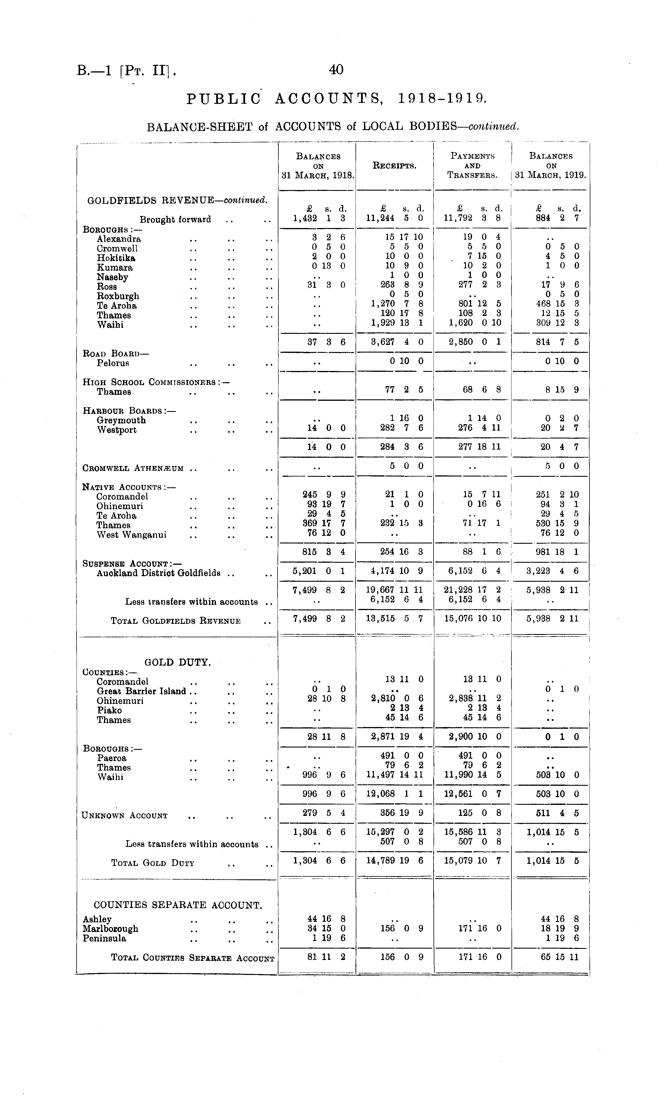 Balances on 31 March, 1918. Receipts. Payments AND Transfers. Balances on GOLDFIELDS REVENUE— continued. 31 March, 1919. Brought forward £ s. d. 1,432 1 3 £ s. d. 11,244 5 0 £ s. d. 11,792 3 8 £ s. d. 884 2 7 Boroughs:— Alexandra Cromwell llokitika Kumara Naseby Ross Roxburgh Te Aroha Thames Waihi 3 2 (i 0 5 0 2 0 0 0 18 0 31' 3 0 15 17 10 5 5 0 10 0 0 10 9 0 10 0 263 8 9 0 5 0 1,270 7 8 120 17 8 1,929 13 1 19 0 4 5 5 0 7 15 0 10 2 0 10 0 277 2 3 0 5 0 4 5 0 1 0 0 17 9 6 0 5 0 468 15 3 12 15 5 309 12 3 801 12 5 108 2 3 1,620 0 10 37 3 6 Road Board — Pelorus 3,627 4 0 2,850 0 1 814 7 5 0 10 0 0 10 0 High School Commissioners: — Thames 77 2 5 68 6 8 8 15 9 Harbour Boards :— Greymouth Westport li' 0 0 1 16 0 282 7 6 1 14 0 276 4 11 0 2 0 20 2 7 14 0 0 284 3 6 277 18 11 20 4 7 Cromwell Athen^um 5 0 0 5 0 0 Native Accounts :— Coromandel Ohinemuri Te Aroha Thames West Wanganui 245 9 9 93 19 7 29 4 5 369 17 7 76 12 0 21 1 0 1 0 0 15 7 11 0 16 6 251 2 10 94 8 1 29 4 5 530 15 9 76 12 0 232 15 3 71 17 1 815 3 4 254 16 8 88 1 6 981 18 1 Suspense Account:— Auokland Distriot Goldfields 5,201 0 1 4,174 10 9 6,152 6 4 3,223 4 6 Less transfers within accounts .. 7,499 8 2 19,667 11 11 6,152 6 4 21,228 17 2 6,152 6 4 5,938 2 11 Total Goldfields Revenue 7,499 8 2 13,515 5 7 15,076 10 10 5,938 2 11 GOLD DUTY. Counties :— Coromandel Great Barrier Island Ohinemuri Piako Thames 13 11 0 13 11 0 6' 1 0 28 10 8 2,810 0 6 2 13 4 45 14 6 2,838 11 2 2 13 4 45 14 6 0 10 0 10 Boroughs :— Paeroa Thames Waihi 28 11 8 2,871 19 4 2,900 10 0 996' 9 6 491 0 0 79 6 2 11,497 14 11 491 0 0 79 6 2 11,990 14 5 503'10 0 996 9 6 12,068 1 1 12,561 0 7 503 10 0 Unknown Account 279 5 4 356 19 9 125 0 8 511 4 5 Less transfers within accounts .. 1,304 6 6 15,297 0 2 507 0 8 15,586 11 3 507 0 8 1,014 15 5 Total Gold Duty 1,304 6 6 14,789 19 6 15,079 10 7 1,014 15 5 COUNTIES SEPARATE ACCOUNT. Ashley Marlborough Peninsula 44 16 8 34 15 0 1 19 6 44 16 8 18 19 9 1 19 6 156 0 9 17116 0 Total Counties Separate Account 81 11 2 156 0 9 171 16 0 65 15 11