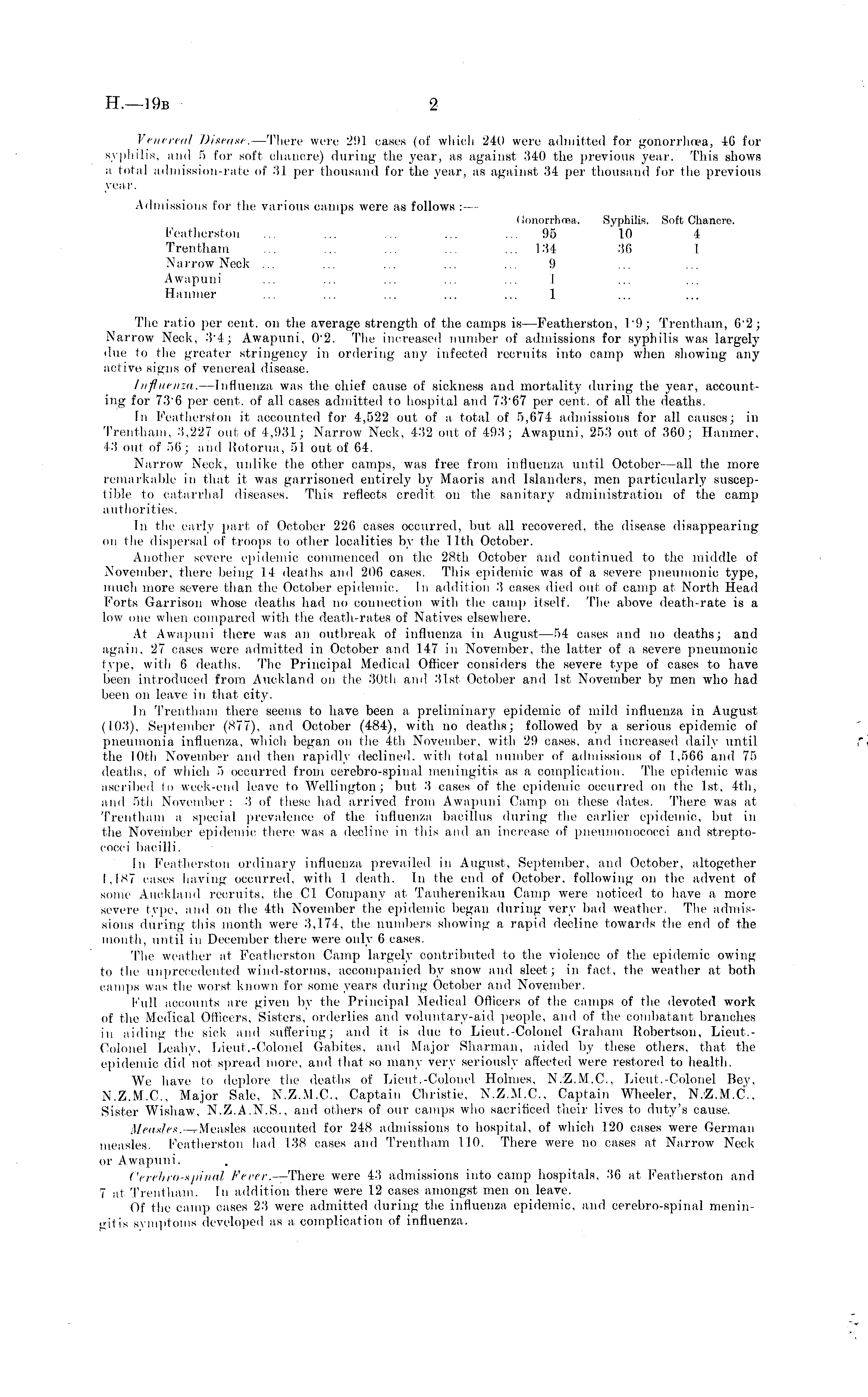Venereal Disease. —There were 29] cases (of which 240 were admitted for gonorrhoea, 46 for syphilis, and 5 for soft chancre) during the year, as against 340 the previous year. This shows a total admission-rate of 31 per thousand for the year, as against 34 per thousand for the previous year. Admissions for the various camps were as follows : — Gonorrhoea. Syphilis. Soft Chancre. Featherston ... ... ... ... ... 95 10 4 Trentham ... ... ... ... ... 134 36 I Narrow Neck ... ... ... ... ... 9 Awapuni ... ... ... ... ... 1 Hanmer ... ... ... ... ... 1 The ratio per cent, on the average strength of the camps is—Featherston, I' 9; Trentham, 62; Narrow Neck, 34; Awapuni, o'2. The increased number' of admissions for syphilis was largely due to the greater stringency in ordering any infected recruits into cnmp when showing any active signs of venereal disease. Influenza. —Influenza was the chief cause of sickness and mortality during the year, accounting for 736 per cent, of all cases admitted to hospital and 7367 per cent, of all the deaths. In Featherston it accounted for 4,522 out of a total of 5,674 admissions for all causes; in Trentham, 3,227 out of 4,931; Narrow Neck, 432 out of 493; Awapuni, 253 out of 360; Hanmer, 43 out, of 56; and Rotorua, 51 out of 64. Narrow Neck, unlike the other camps, was free from influenza until October —all the more remarkable in that it was garrisoned entirely by Maoris and Islanders, men particularly susceptible to catarrhal diseases. This reflects credit on the sanitary administration of the camp authorities. In the early part of October 226 cases occurred, but all recovered, the disease disappearing on the dispersal of troops to other localities by the 11th October. Another severe epidemic commenced on the 28th October and continued to the middle of November, there being 14 deaths and 206 cases. This epidemic was of a severe pneumonic type, much more severe than the October epidemic. In addition 3 cases died out of camp at North Head Forts Garrison whose deaths had no connection with the camp itself. The above death-rate is a low one when compared with the death-rates of Natives elsewhere. At Awapuni there was an outbreak of influenza in August—s4 cases and no deaths; and again. 27 cases were admitted in October and 147 in November, the latter of a severe pneumonic type, with 6 deaths. The Principal Medical Officer considers the severe type of cases to have been introduced from Auckland on the 30th and 31st October and Ist, November by men who had been on leave in that city. In Trentham there seems to have been a preliminary epidemic of mild influenza in August (103), September (877), and October (484), with no deaths; followed by a serious epidemic of pneumonia influenza, which began on the 4th November, with 29 cases, and increased daily until the 10th November and then rapidly declined, with total number of admissions of 1,566 and 75 deaths, of which 5 occurred from cerebro-spinal meningitis as a complication. The epidemic was ascribed Id week-end leave to Wellington; but 3 cases of the epidemic occurred on the Ist, 4th, and sth November : 3 of these had arrived from Awapuni Camp on these dates. There was at Trentham a special prevalence of the influenza bacillus during the earlier epidemic, but in the November epidemic there was a decline in this and an increase of pneunionooocei and streptococci bacilli. In Featherston ordinary influenza prevailed in August, September, and October, altogether 1,187 cases having occurred, with I death. hi the end of October, following on the advent of some Auckland recruits, the CI. Company at Tauherenikau Camp were noticed to have a, more severe type, and on the 4th November the epidemic began during very bad weather. Tin- admissions during this month were 3,174, the numbers showing a rapid decline towards the end of the month, until in December there were only 6 eases. The weather at Featherston Camp largely contributed to the violence of the epidemic owing to the unprecedented wind-storms, accompanied by snow and sleet; in fad, tin- weather at both camps was the worst known for some years during October and November. Full accounts are given by the Principal Medical Officers of the camps of the devoted work of the Medical Officers, Sisters, orderlies and voluntary-aid people, and of the combatant branches in aiding the sick and suffering; and it is due to Lieut,-Colonel Graham Robertson, Lieut.Colonel Leahy, Lieut.-Colonel Gabites, and Major Sliarman, aided by these others, that the epidemic did not spread more, and that so many very seriously affected were restored to health. We have to deplore the deaths of Lieut.-Colonel Holmes, N.'Z.M.C, Lieut.-Colonel Bey, N.Z.M.C., Major Sale, N.Z.M.C., Captain Christie, N.Z.M.C., Captain Wheeler, N.'Z.M.C., Sister Wishaw, N.Z.A.N.S., and others of our camps who sacrificed their lives to duty's cause. Measles.— rMeasles accounted for 248 admissions to hospital, of which 120 cases were German measles. featherston had 138 cases and Trentham 110. There were no cases at Narrow Neck or Awapuni. Cerebro-spinal Fever. —There were 43 admissions into camp hospitals, 36 at Featherston and 7at Trentham. In addition there were 12 cases amongst men on leave. Of the camp cases 23 were admitted during the influenza epidemic, and cerebro-spinal meningitis symptoms developed as a complication of influenza.