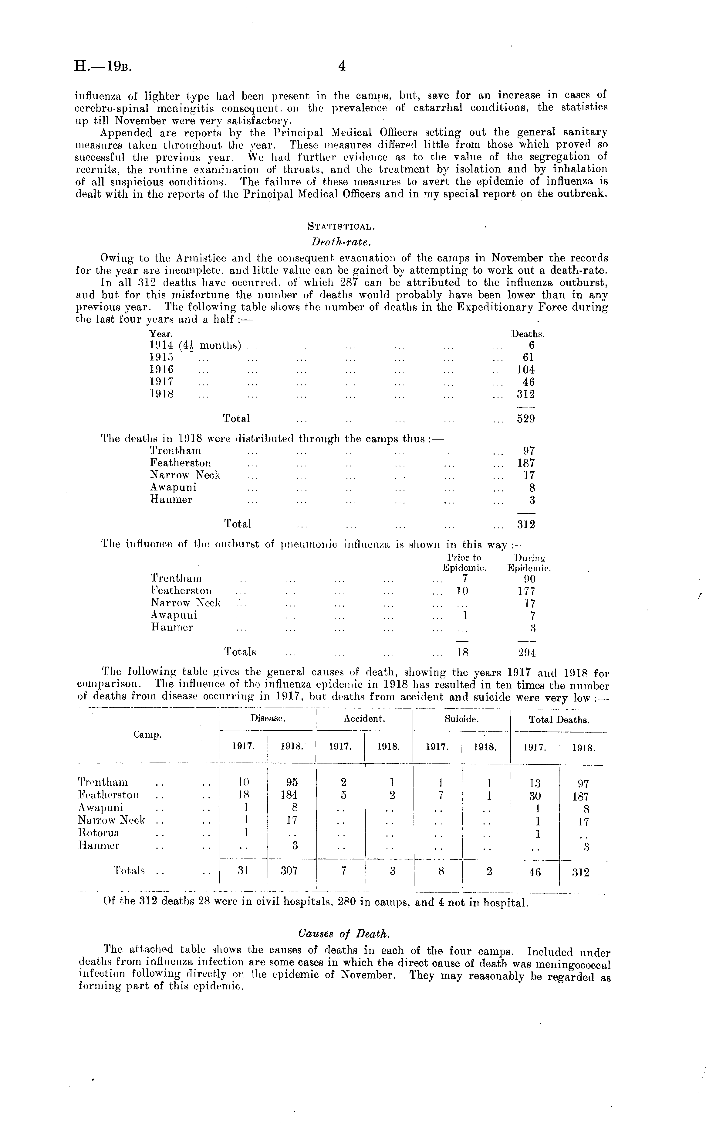 Causes of Death. The attached table shows the causes of deaths in each of the four camps. Included under deaths from influenza infection are some cases in which the direct cause of death was meningococcal infection directly on (lie epidemic of November. They may reasonably be regarded as forming part of this epidemic.