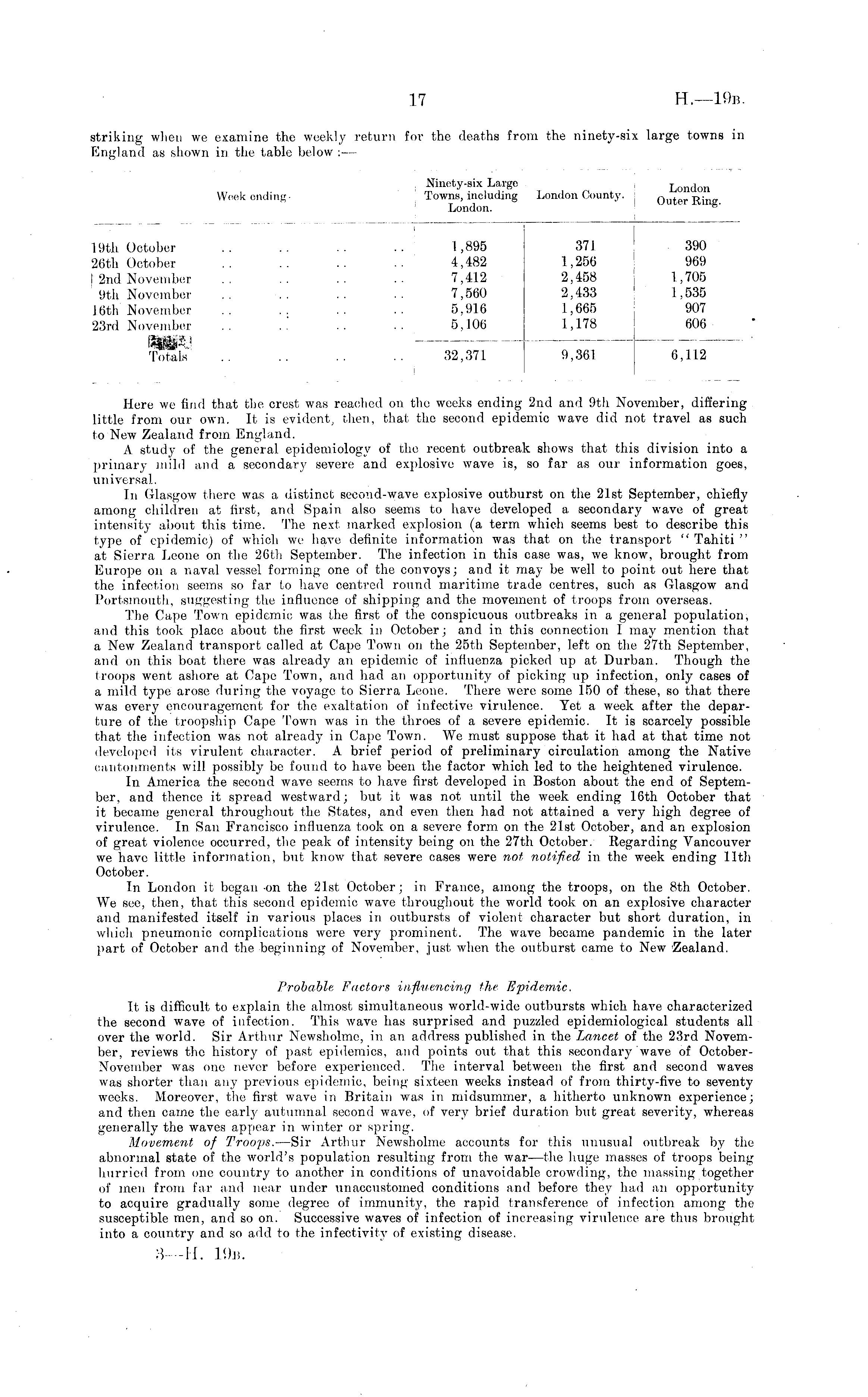 Here we find that the crest was reached on the weeks ending 2nd and 9th November, differing little from our own. It is evident, then, that the second epidemic wave did not travel as such to New Zealand from. England. A study of the general epidemiology of the recent outbreak shows that this division into a primary mild and a secondary severe and explosive wave is, so far as our information goes, universal. In Glasgow there was a distinct second-wave explosive outburst on the 21st September, chiefly among children at first, and Spain also seems to have developed a. secondary wave of great intensity about this time. The next marked explosion (a term which seems best to describe this type of epidemic) of which we have definite information was that on the transport " Tahiti " at Sierra Leone on the 26th September. The infection in this case was, we know, brought from Europe on a naval vessel forming one of the convoys; and it may be well to point out here that the infection seems so far to have centred round maritime trade centres, such as Glasgow and Portsmouth, suggesting the influence of shipping and the movement of troops from overseas. The Cape Town epidemic was the first of the conspicuous outbreaks in a general population, and this took place about the first week in October; and in this connection I may mention that a New Zealand transport called at Cape Town on the 25th September, left on the 27th September, and on this boat there was already an epidemic of influenza picked up at Durban. Though the troops went ashore at Cape Town, and had an. opportunity of picking up infection, only cases of a mild type arose during the voyage to Sierra Leone. There were some 150 of these, so that there was every encouragement for the exaltation of infective virulence. Yet a week after the departure of the troopship Cape Town was in the throes of a severe epidemic. It is scarcely possible that the infection was not already in Cape Town. We must suppose that it had at that time not developed its virulent character. A brief period of preliminary circulation among the Native cantonments will possibly be found to have been the factor which led to the heightened virulence. In America the second wave seems to have first developed in Boston about the end of September, and thence it spread westward; but it was not until the week ending 16th October that it became general throughout the States, and even then had not attained a very high degree of virulence. In San Francisco influenza took on a severe form on the 21st October, and an explosion of great violence occurred, the peak of intensity being on the 27th October. Regarding Vancouver we have little information, but know that severe cases were not notified in the week ending 11th October. In London it began -on the 21st October; in France, among the troops, on the Bth October. We see, then, that this second epidemic wave throughout the world took on an explosive character and manifested itself in various places in outbursts of violent character but short duration, in which pneumonic complications were very prominent. The wave became pandemic in the later part of October and the beginning of November, just when the outburst came to New Zealand. Probable Factors influencing the Epidemic. It is difficult to explain the almost simultaneous world-wide outbursts which have characterized the second wave of infection. This wave has surprised and puzzled epidemiological students all over the world. Sir Arthur Newsholme, in an address published in the Lancet of the 23rd November, reviews tho history of past epidemics, and points out that this secondary wave of OctoberNovember was one never before experienced. The interval between the first and second waves was shorter than any previous epidemic, being sixteen weeks instead of from thirty-five to seventy weeks. Moreover, the first wave in Britain was in midsummer, a hitherto unknown experience; and then came the early autumnal second wave, of very brief duration but great severity, whereas generally the waves appear in winter or spring. Movement of Troops. —Sir Arthur Newsholme accounts for this unusual outbreak by the abnormal state of the world's population resulting from the war —the huge masses of troops being hurried from one country to another in conditions of unavoidable crowding, the massing together of men from far and near under unaccustomed conditions and before they had an opportunity to acquire gradually some degree of immunity, the rapid transference of infection among the susceptible men, and so on. Successive waves of infection of increasing virulence are thus brought into a country and so add to the infectivity of existing disease.