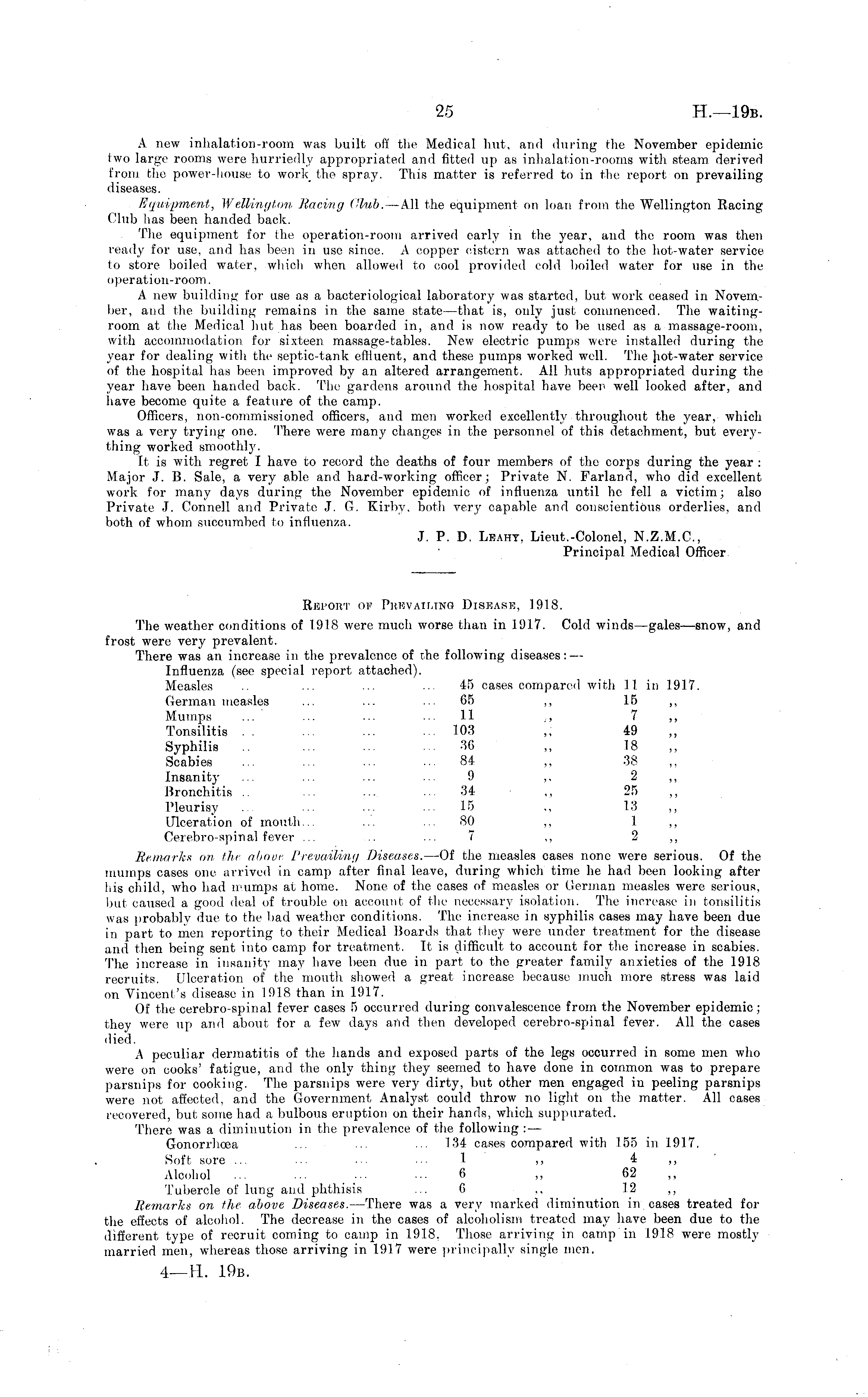 A new inhalation-room was built off the Medical hut, and during the November epidemic two large rooms were hurriedly appropriated and fitted up as inhalation-rooms with steam derived from the power-house to work the spray. This matter is referred to in the report on prevailing diseases. Equipment, Wellington Racing Club. —All the equipment on loan from the Wellington Racing Club has been handed back. The equipment for the operation-room arrived early in the year, and the room was then ready for use, and has been in use since. A copper cistern was attached to the hot-water service to store boiled water, which when allowed to cool provided cold boiled water for use in the operation-room. A new building for use as a bacteriological laboratory was started, but work ceased in November, and the building remains in the same state —that is, only just commenced. The waitingroom at the Medical hut has been boarded in, and is now ready to be used as a massage-room, with accommodation for sixteen massage-tables. New electric pumps were installed during the year for dealing with the septic-tank effluent, and these pumps worked well. The Jiot-water service of the hospital has been improved by an altered arrangement. All huts appropriated during the year have been handed back. The gardens around the hospital have been well looked after, and have become quite a feature of the camp. Officers, non-commissioned officers, and men worked excellently throughout the year, which was a very trying one. There were many changes in the personnel of this detachment, but everything worked smoothly. It is with regret I have to record the deaths of four members of the corps during the year : Major J. B. Sale, a very able and hard-working officer; Private N. Farland, who did excellent work for many days during the November epidemic of influenza until he fell a victim; also Private J. Connell and Private J. G. Kirby. both very capable and conscientious orderlies, and both of whom succumbed to influenza. J. P. D. Leahy. Lieut.-Colonel, N.Z.M.C, Principal Medical Officer. Recort of Prevailing Disease, 1918. The weather conditions of 1918 were much worse than in 1917. Cold winds—gales—snow, and frost were very prevalent. There was an increase in the prevalence of the following diseases: — Influenza (see special report attached). Measles .. ... ... ... 45 cases compared with 11. in 1917. German measles ... ... ... 65 ~ 15 ~ Mumps ... ... ... 11 ~ 7 ~ Tonsilitis . . ... ... ... 103 ~ 49 Syphilis ... ... ... 36 ~ 18 ~ Scabies ... ... ... ... 84 ~ 38 Insanity ... ... ... ... 9 ~ 2 ~ Bronchitis .. ... ... ... 34 ~ 25 Pleurisy ... ... ... ... 15 ~ 13 ~ Ulceration of mouth... ... ... 80 ~ 1 ~ Cerebro-spinal fever ... ... 7 ~ 2 ~ Remarks on the above Prevailing Diseases. —Of the measles cases none were serious. Of the mumps cases one arrived in camp after final leave, during which time he had been looking after his child, who bad mumps at home. None of the cases of measles or German measles were serious, but caused a good deal of trouble on account of the necessary isolation. The increase in tonsilitis was probably due to the bad weather conditions. The increase in syphilis cases may have been due in part to men reporting to their Medical Boards that they were under treatment for the disease and then being sent into camp for treatment. It is difficult to account for the increase in scabies. The increase in insanity may have been due in. part to the greater family anxieties of the 1918 recruits. Ulceration of the mouth, showed a great increase because much more stress was laid on Vincent's disease in 1918 than in 1917. Of the cerebro-spinal fever cases 5 occurred during convalescence from the November epidemic; they were up and about for a few days and then developed cerebro-spinal fever. All the cases died. A peculiar dermatitis of the hands and exposed parts of the legs occurred in some men who were on cooks' fatigue, and the only thing they seemed to have done in common was to prepare parsnips for cooking. The parsnips were very dirty, but other men engaged in peeling parsnips were not affected, and the Government Analyst could throw no light on the matter. All cases recovered, but some had a bulbous eruption on their hands, which suppurated. There was a diminution in the prevalence of the following : — Gonorrhoea ... ... ... 134 cases compared with 155 in 1917. Soft sore ... ... ... ... 1 ~ 4 ~ Alcohol ... ... ... ... 6 ~ 62 Tubercle of lung and phthisis ... 6 ~ 12 ~ Remarks on the above Diseases. —There was a very marked diminution in cases treated for the effects of alcohol. The decrease in the cases of alcoholism treated may have been due to the different type of recruit coming to camp in 1918. Those arriving in camp in 1918 were mostly married men, whereas those arriving in 1917 were principally single men.