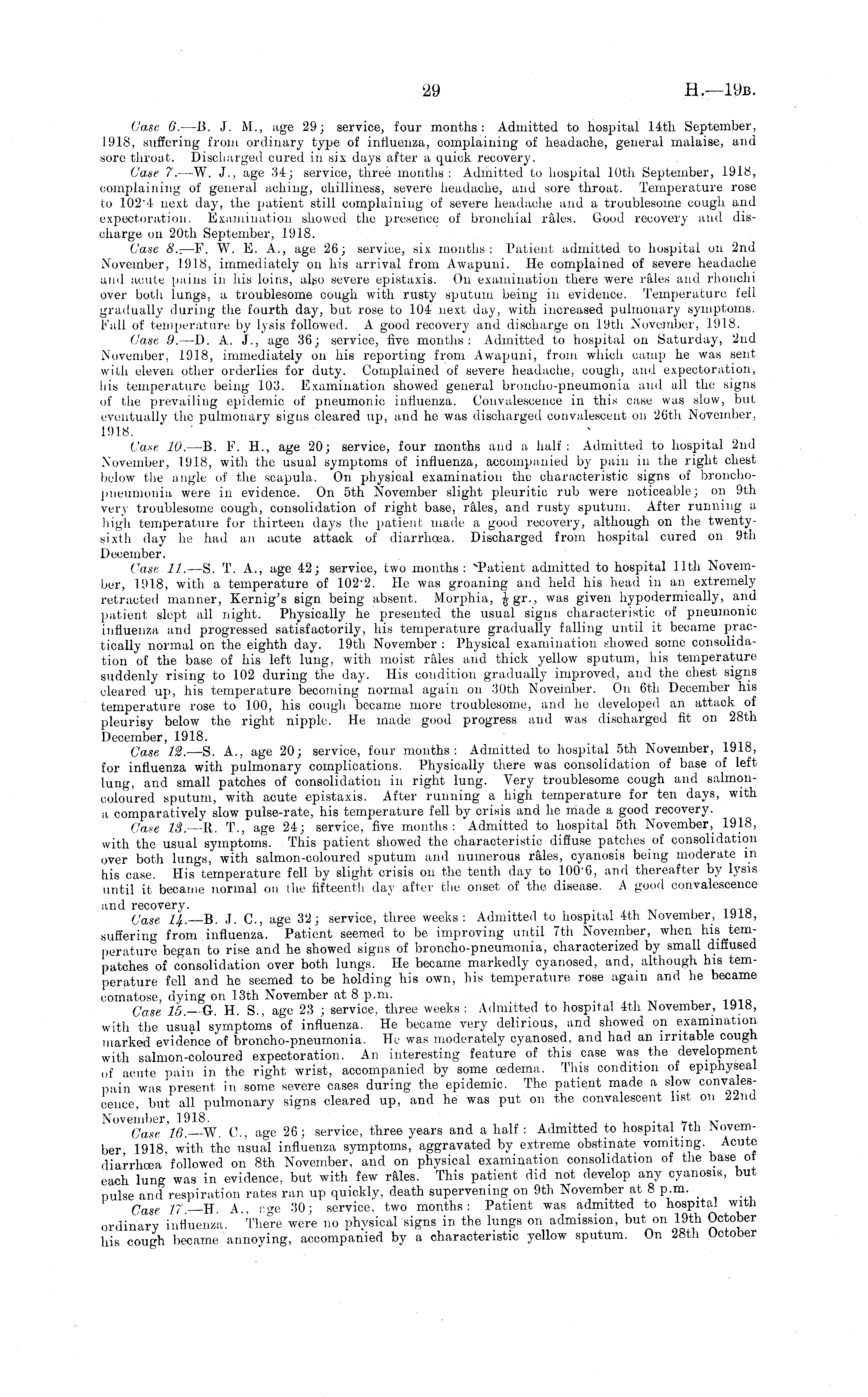 Case 6. —B. J. i\L, age 29; service, four months: Admitted to hospital 14th September, 1918, suffering from ordinary type of influenza, complaining of headache, general malaise, and sore throat. Discharged cured in six days after a quick recovery. Case 7. — W. J., age 34; service, three months : Admitted to hospital 10th September, 1.918, complaining of general aching, chilliness, severe headache, and sore throat. Temperature rose to 1024 next day, the patient still complaining of severe headache and a troublesome cough and expectoration. Examination showed the presence of bronchial rales. Good recovery and discharge on 20th September, 1918. Case 8.- —F. W. E. A., age 26; service, six months: Patient admitted to hospital on 2nd November, 1918, immediately on his arrival from Awapuni. He complained of severe headache and acute pains in his loins, also severe epistaxis. On examination there were rales and rhonchi over both lungs, a troublesome cough with rusty sputum being in evidence. Temperature fell gradually during the fourth day, but rose to 104 next day, with increased pulmonary symptoms. Fall of temperature by lysis followed. A good recovery and discharge on 19th November, 1918. Case 9. —D. A. J., age 36; service, five months: Admitted to hospital on Saturday, 2nd November, 1918, immediately on his reporting from Awapuni, from which camp he was sent with eleven other orderlies for duty. Complained of severe headache, cough, and expectoration, his temperature being 103. Examination showed general broncho-pneumonia and all the signs of the prevailing epidemic of pneumonic influenza. Convalescence in this case was slow, but eventually the pulmonary signs cleared up, and he was discharged convalescent on 26th November, 1918. Case 10. — B. F. H., age 20; service, four months and a half : Admitted to hospital 2nd November, 191.8, with the usual symptoms of influenza, accompanied by pain in the right chest below the angle of the scapula. On physical examination the characteristic signs of bronchopneumonia were in evidence. On sth November slight pleuritic rub were noticeable; on 9th very troublesome cough, consolidation of right base, rales, and rusty sputum. After running a high temperature for thirteen days the patient made a good recovery, although on the twentysixth day he had an acute attack of diarrhoea. Discharged from hospital cured on 9th December. Case 11. — S. T. A., age 42; service, two months: "Patient admitted to hospital I.lth November, 191.8, with a temperature of 1022. He was groaning and held his head in an extremely retracted manner, Kernig's sign being absent. Morphia, |gr., was given hypodermically, and patient slept all night. Physically he presented the usual signs characteristic of pneumonic influenza and progressed satisfactorily, his temperature gradually falling until it became practically normal on the eighth day. 19th November : Physical examination showed some consolidation of the base of his left lung, with moist rales and thick yellow sputum, his temperature suddenly rising to 102 during the day. His condition gradually improved, and the chest signs cleared up, his temperature becoming normal again on 30th November. On 6th December his temperature rose to 100, his cough became more troublesome, and he developed an attack of pleurisy below the right nipple. He made good progress and was discharged fit on 28th December, 1918. Case 12. — S. A., age 20; service, four months: Admitted to hospital sth November, 1918, for influenza with pulmonary complications. Physically there was consolidation of base of left lung, and small patches of consolidation in right lung. Very troublesome cough and salmoncoloured sputum, with acute epistaxis. After running a high temperature for ten days, with a comparatively slow pulse-rate, his temperature fell by crisis and he made a good recovery. Case 18—ll. T., age 24; service, five mouths: Admitted to hospital sth November, 1918, with the usual symptoms. This patient showed the characteristic diffuse patches of consolidation over both lungs, with salmon-coloured sputum and numerous rales, cyanosis being moderate in his case. His temperature fell by slight crisis on the tenth day to 100(5, and thereafter by lysis until it became normal on the fifteenth day after the onset of the disease. A good convalescence and recovery. (Jase l\. B. J. C, age 32; service, three weeks: Admitted to hospital 4th November, 1918, suffering from influenza. Patient seemed to be improving until 7th November, when his temperature began to rise and he showed signs of broncho-pneumonia, characterized by small diffused patches of consolidation over both lungs. He became markedly cyanosed, and, although his temperature fell and he seemed to be holding his own, his temperature rose again and he became comatose, dying on 13th November at 8 p.m. ....■» , mio Case 15.— G. H. S., age 23 ; service, three weeks : Admitted to hospital 4th November, 1918, with the usual symptoms of influenza. He became very delirious, and showed on examination marked evidence of broncho-pneumonia. He was moderately cyanosed, and had an irritable cough with salmon-coloured expectoration. An interesting feature of this case was the development of acute pain in the right wrist, accompanied by some oedema. This condition of epiphyseal pain was present in some severe cases during the epidemic. The patient made a slow convalescence, but all pulmonary signs cleared up, and he was put on the convalescent list on 22nd November, 1918. ... -, , ~ , «,, w Case 16— W. C, age 26; service, three years and a halt : Admitted to hospital 7th November 1918, with the usual influenza symptoms, aggravated by extreme obstinate vomiting. Acute diarrhoea followed on Bth November, and on physical examination consolidation of the base ol each lung was in evidence, but with few rales. This patient did not develop any cyanosis, but pulse and respiration rates ran up quickly, death superven
