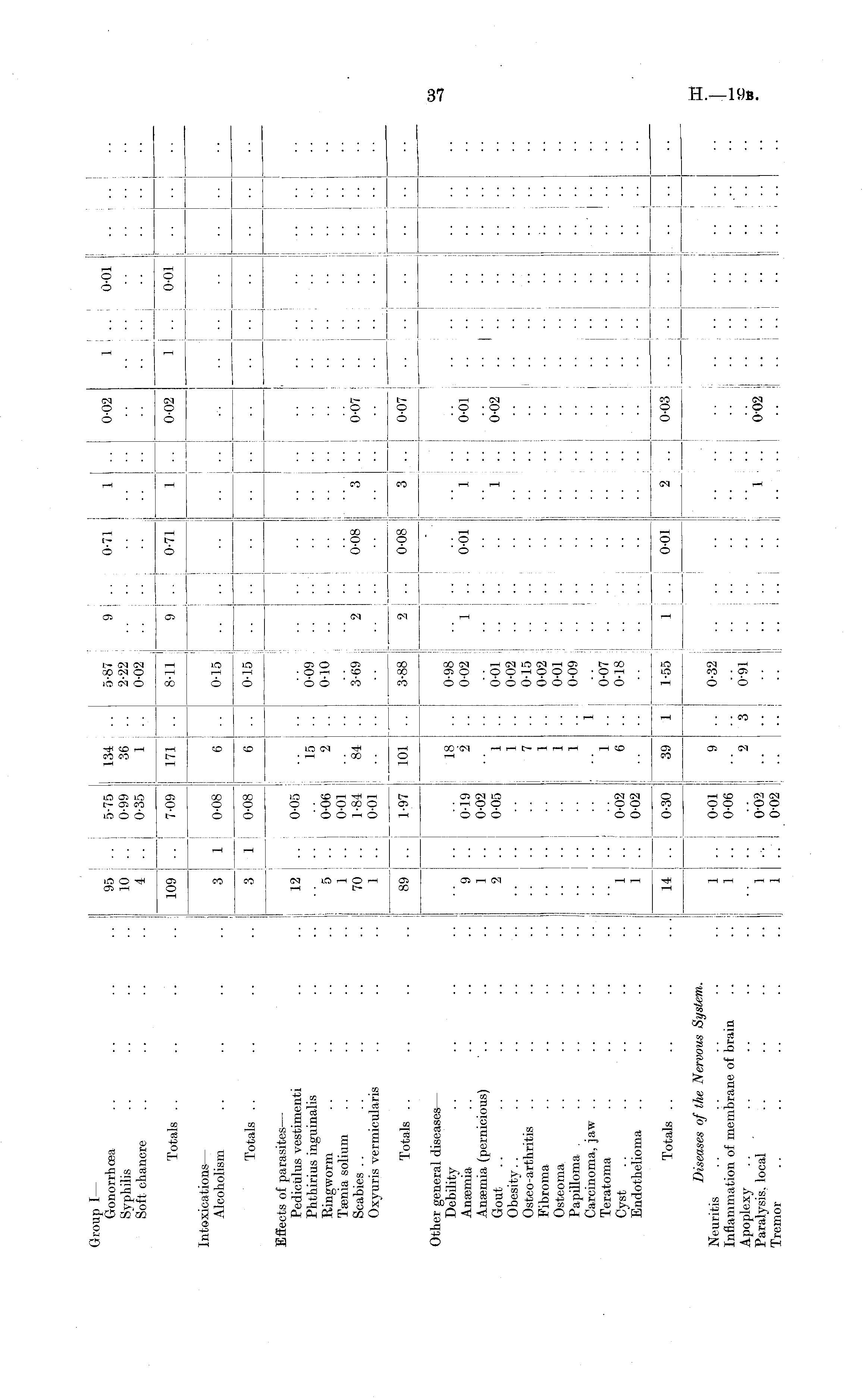 Group I— Gonorrhoea Syphilis Soft chancre 95 .. 10 .. 4 .. ... 95 .. 10 .. 4 .. 5-75 0-99 0-35 5-75 0-99 0-35 134 36 1 5-87 2-22 0-02 I 9 .. 0-71 1 .. 0-02 1 .. I 0-01 !■ I " I .. .. i Totals 109 .. 109 .. 7-09 7-09 171 8-11 9 .. ' 0-71 | 1 | .. 0-02 1 I •• 0-01 ■ i L I I Intoxications — Alcoholism I 3 1 3 1 0-08 0-08 6 0-15 I ; Totals .. 3 ! 1 3 1 0-08 0-08 6 0-15 ii • • " •■ I _L_i i I !— Effects of parasites — PedicUlus vestimenti Phthirius inguinalis Ringworm Taenia solium Scabies Oxyuris vermicularis ! 12 .. 5 | .. 1 I -- 70 .. i ! ,. 12 5 1 70 1 0-05 0-06 0-01 1-84 0-01 0-05 0-06 0-01 1-84 0-01 15 2 0-09 0-10 i .. " I i " . - I I •• I •• I ... i:: •• 84 3-69 2 .. 0-08 3 0-07 1 .. . ! . . ' •' I •' __L L, Totals .. 89 .. 89 1-97 1-97 101 3-88 2 0-08 3 0-07 •• Other general diseases — Debility Ansemia Ansemia (pernicious) Gout Obesity Osteo-arthritis Fibroma Osteoma Papilloma . Carcinoma, jaw Teratoma Cyst .. Endothelioma Totals .. Diseases of the Nervous System. Neuritis Inflammation of membrane of brain Apoplexy Paralysis, local Tremor 9 .. 1 .. 2 .. 1 1 .. 14 .. 1 .. 1 .. 1 ., 1 .. 0-19 0-02 0-05 0-02 0-02 0-30 0-01 0-06 0-02 002 0-19 0-02 0-05 0-02 0-02 18 2 1 1 7 1 1 1 1 6 1 0-98 0-02 0-01 0-02 0-15 0-02 0-01 0-09 0-07 0-18 1 .. 1 . . 0-01 1 1 0-01 0-02 I ! I ;; .. ! .. .. | .. .. .. .. .. . .-. .. .. .. i .. .. • • i •• I 0-30 39 1 1-55 1 0-01 2 ■• 0-03 i ■ ■ i •- __[_ ii hiii " _ 9 3 0-32 0-91 ■ 2 1 .. 0-02 -. i