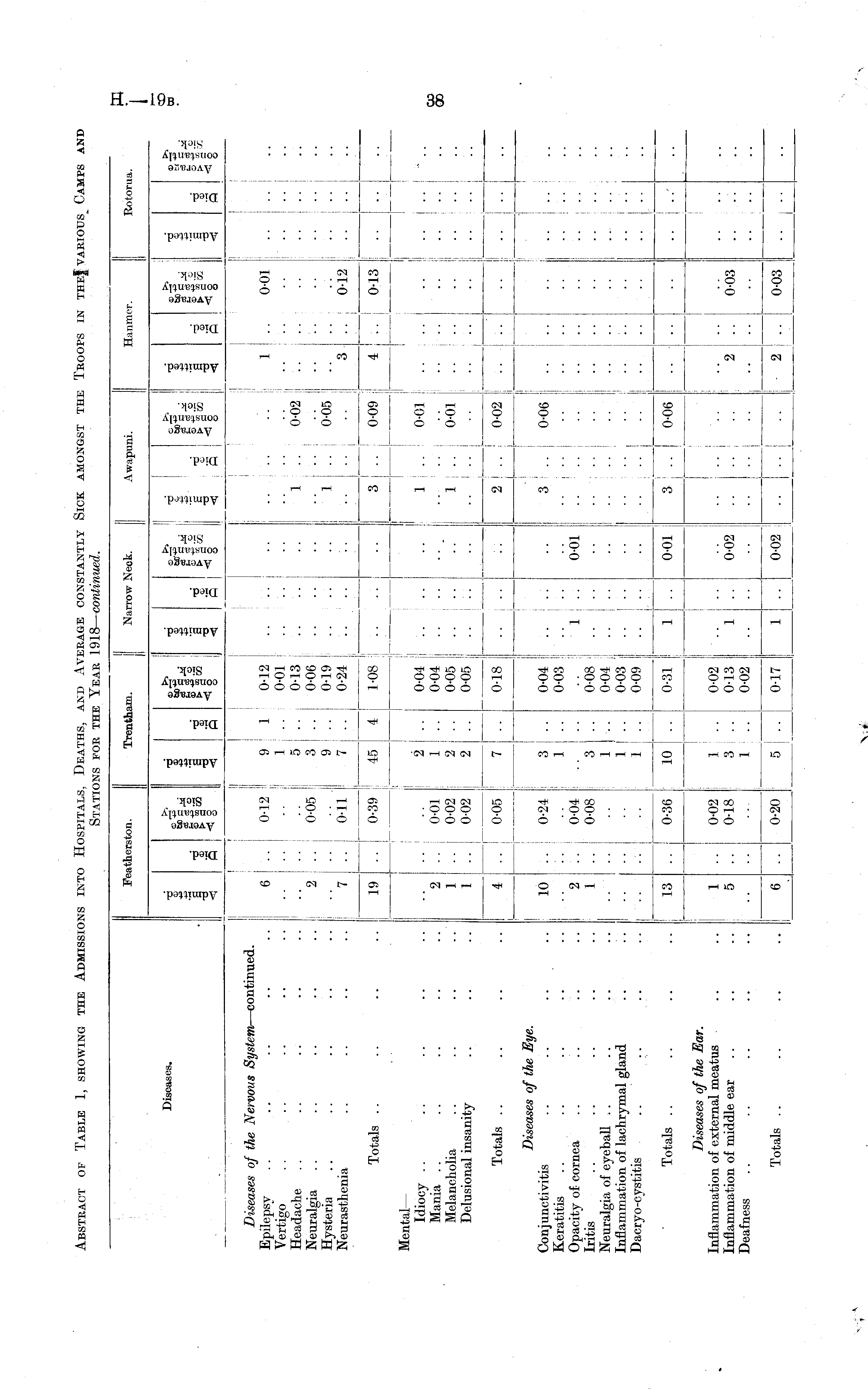 Abstract of Table 1, showing the Admissions into Hospitals, Deaths, and Average constantly Sick amongst the Troops in the various Camps and Stations for the Year 1918— continued.
