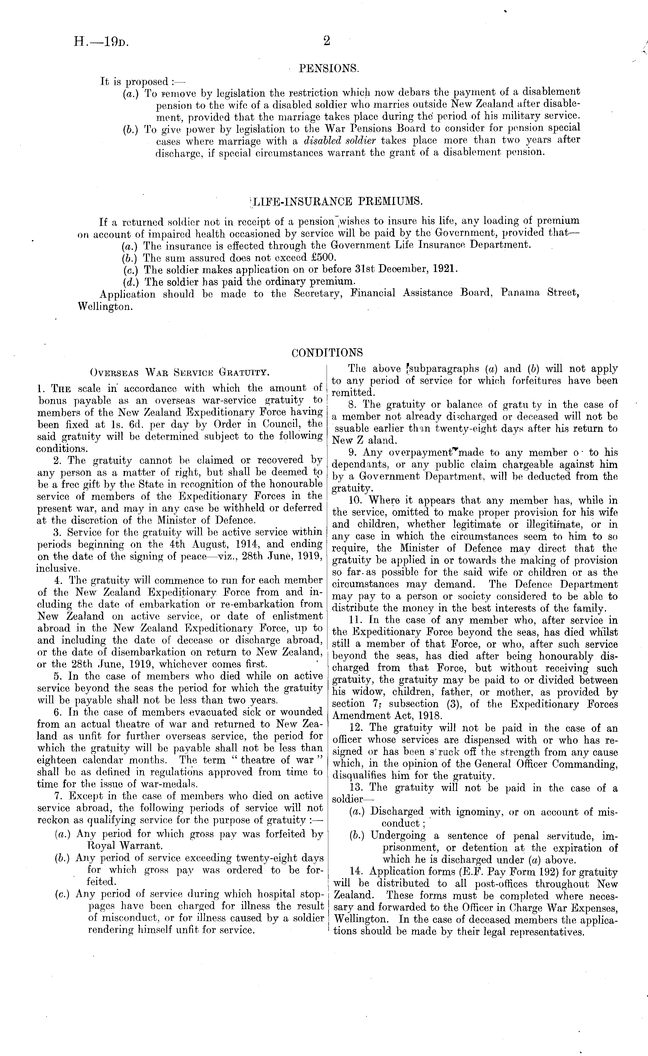 PENSIONS. It is proposed : — (a.) To remove by legislation the restriction which now debars the payment of a disablement pension to the wife of a disabled soldier who marries outside New Zealand after disablement, provided that the marriage takes place during the period of his military service. (6.) To give power by legislation to the War Pensions Board to consider for pension special cases where marriage with a disabled soldier takes place more than two years after discharge, if special circumstances warrant the grant of a disablement pension. 'LIFE-INSURANCE PREMIUMS. If a returned soldier not in receipt of a pension'wishes to insure his life, any loading of premium on account of impaired health occasioned by service will be paid by the Government, provided that— (a.) The insurance is effected through the Government Life Insurance Department. (b.) The sum assured does not exceed £500. (c.) The soldier makes application on or before 31st Deoember, 1921. (d.) The soldier has paid the ordinary premium. Application should be made to the Secretary, Financial Assistance Board, Panama Street, Wellington.