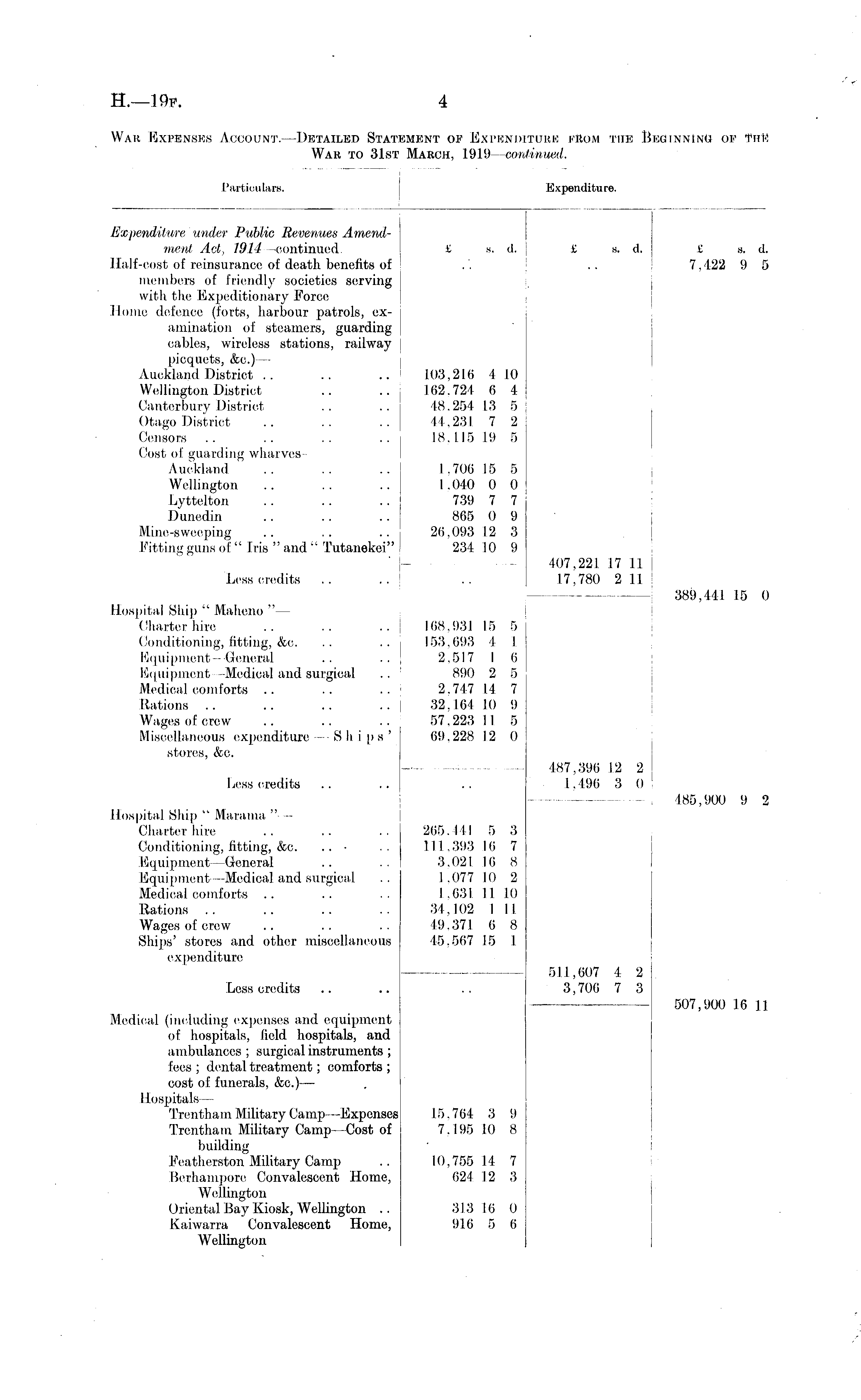 Particulars. Expenditure. Expenditure under Public Revenues Amendment Act, 1914 —continued. Half-cost of reinsurance of death benefits of members of friendly societies serving with the Expeditionary Force .Home defence (forts, harbour patrols, examination of steamers, guarding cables, wireless stations, railway picquets, &c.) — - Auckland District Wellington District Canterbury District Otago District Censors Cost of guarding wharves Auckland Wellington Lyttelton Dunedin Mine-sweeping Kitting guns of " Iris " and " Tutanekei" £ s. d. 103.216 4 10 162.724 6 4 48.254 13 5 14.231 7 2 18.115 19 5 £ s. d. £ s. d. £ s. d. 7,422 9 5 1.706 15 5 1.040 0 0 739 7 7 865 0 9 26.093 12 3 234 10 9 Less credits 407,221 17 11 17.780 2 11 389,441 15 0 Hospital Ship " Maheno " — Charter hire Conditioning, fitting, &c. Equipment General Equipment Medical and surgical Medical comforts .. Rations Wages of crew Miscellaneous expenditure Ships' stores, &o. 168.931 15 5 153,693 4 I 2.517 1 6 890 2 5 2.747 14 7 32,164 10 9 57.223 I I 5 69.228 12 0 Less credits Hospital Ship " Marama " — Charter hire Conditioning, fitting, &c. .. • Equipment —General Equipment—Medical and surgical Medical comforts Rations Wages of crow Ships' stores and other miscellaneous expenditure 187,396 12 2 1,496 3 0 187,39(i 12 I,496 3 2 0 485,900 9 2 265,141 5 3 111.393 16 7 3,021 16 8 I.077 10 2 1.631 II 10 34,102 I II 49.371 6 8 45,567 15 1 511,607 4 2 3,706 7 3 507,900 16 11 Less credits 511,607 4 3,706 7 2 3 Medical (including expenses and equipment of hospitals, field hospitals, and ambulances ; surgical instruments ; fees ; dental treatment; comforts ; cost of funerals, &c.) — Hospitals— Trentham Military Camp —Expenses Trentham Military Camp —Cost of building Peatherston Military Camp Berhampore Convalescent Home, Wellington Oriental Bay Kiosk, Wellington .. Kaiwarra Convalescent Home, Wellington 15.761 3 9 7.195 10 8 10.755 14 7 624 12 3 313 16 0 916 5 6