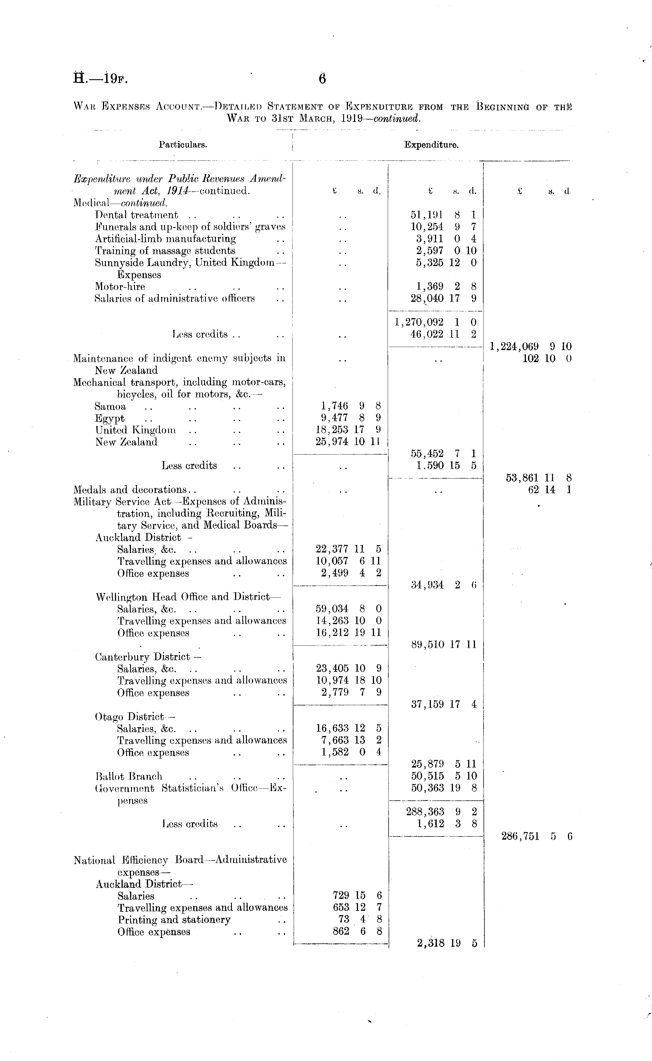 Particulars. Expenditure. Expenditure under Public Revenues Amendment Act, 1914— -continued. Medical — continued. Dental treatment Funerals and up-keep of soldiers' graves Artificial-limb manufacturing Training of massage, students Sunnyside Laundry, United KingdomExpenses Motor-hire Salaries of administrative officers E s. d. £ S. d. 51,191 8 I 10,254 9 7 3,911 0 4 2,597 0 10 5,325 12 0 £ s. d. 1,369 2 8 28,040 17 9 Less credits 1,270,092 1 0 46,022 11 2 Maintenance of indigent enemy subjects in New Zealand Mechanical transport, including motor-cars, bicycles, oil for motors, &o. — 1,224,069 9 10 102 10 0 Samoa Egypt United Kingdom New Zealand 1,746 9 8 9,477 8 9 18,253 17 9 25,974 10 II 55,452 7 1 1.590 15 5 Less credits Medals and decorations Military Service Act -Expenses of Administration, including Recruiting, Military Service, and Medical Boards - Auckland District - Salaries, &c. . . Travelling expenses and allowances Office expenses 53,861 11 62 14 8 1 22,377 11 5 10,057 6 11 2,499 4 2 34,934 2 6 Wellington Head Office and District — Salaries, &c. Travelling expenses and allowances Office expenses 59,034 8 0 14,263 10 0 16,212 19 1.1 89,510 17 11 Canterbury District—■ Salaries, &c. .. Travelling expenses and allowances Office expenses 23,405 10 9 10,974 18 10 2,779 7 9 37,159 17 4 Otago District — Salaries, &c. Travelling expenses and allowances Office expenses 16,633 12 7,663 13 1,582 0 5 2 4 Ballot Branch Government Statistician's Office —Ex25,879 5 11 50,515 5 10 50,363 19 8 penses 288,363 9 2 1,612 3 8 286,751 5 Loss credits National Efficiency Board -Administrative expenses —- Auckland District — Salaries .. . . Travelling expenses and allowances Printing and stationery Office expenses 729 15 6 653 12 7 73 4 8 862 6 8 2,318 19 5