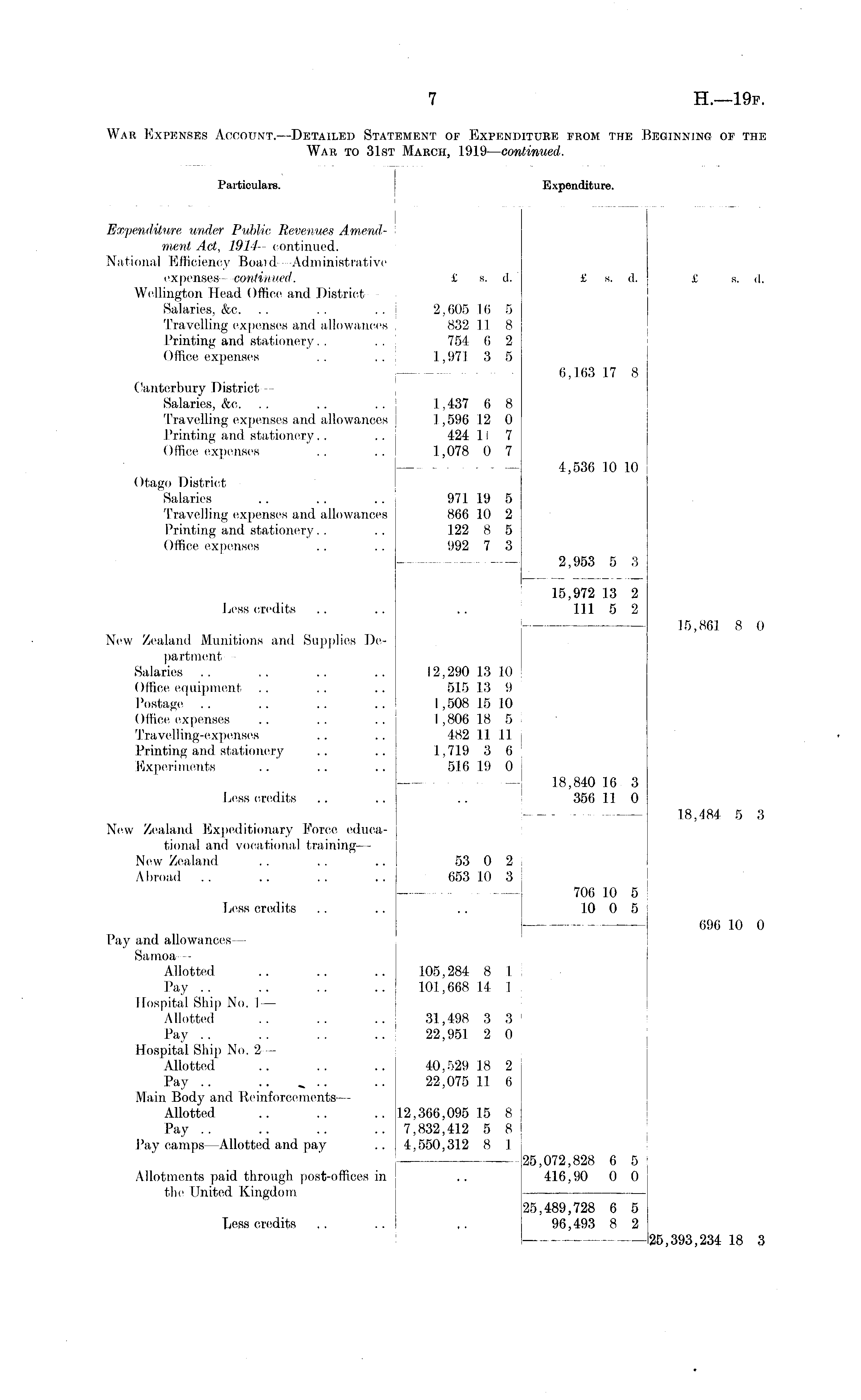 Particulars. Expenditure. Expenditure under Public Revenues Amendment Act, 1914— continued. National Efficiency Boaid -Administrative expenses— continued. Wellington Head Office and District Salaries, &c. . . Travelling expenses and allowances Printing and stationery Office expenses £ s. d. 2,605 16 5 832 11 8 754 (i 2 1,971 3 5 £ s. d. £ s. | d. 6,163 17 8 Canterbury District— Salaries, &c. . . Travelling expenses and allowances Printing and stationery Office expenses 1.437 6 8 1,596 12 0 424 II 7 1,078 0 7 Otago District Salaries Travelling (expenses and allowances Printing and stationery Office expenses Less credits 971 19 5 866 10 2 122 8 5 992 7 3 4,536 10 10 2,953 5 3 15,972 13 2 111 5 2 15,861 8 0 New Zealand Munitions and Supplies Department — Salaries Office equipment Postage Office expenses Travelling-expenses Printing and stationery Experiments Less credits 12,290 13 10 515 13 9 1,508 15 10 1,806 18 5 482 11 11 1,719 3 6 516 19 0 18,840 16 3 356 11 0 18,484 5 3 New Zealand Expeditionary Force educational and vocational training— New Zealand Abroad Less credits 53 0 2 653 10 3 706 10 5 10 0 5 696 10 0 Pay and allowances— Samoa — Allotted Pay .. Hospital Ship No. 1 — Allotted Pay ■• Hospital Ship No. 2 — Allotted Pay .. .. „ .. Main Body and Reinforcements— Allotted Pay Pay camps —Allotted and pay 11 11 I i 12,3i 7,8; 4,51 105,284 8 101,668 14 31,498 3 22,951 2 L05,284 8 I :01,668 14 1 31,498 3 3 22,951 2 0 40,529 18 2 22,075 11 6 (66,095 15 8 532,412 5 8 >50,312 8 1 < I 1 3 0 •i R 079, 828 fi R 40,529 18 22,075 11 2 6 Allotments paid through post-offices in the United Kingdom 12,366,095 15 7,832,412 5 4.550,312 8 < 8 8 1 25,072,828 416,90 D,U(2,020 O O 416,90 0 0 R 4-89 79H R K 6 0 5 0 25,393,234 18 3 Less credits 25,489,728 96,493 o,toy, izo o o 96,493 8 2 6 5 8 2